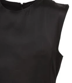 Robe longue grise dos nu. Col rond côtelé. Fente latérale au bas. Coupe droite. Base droite.