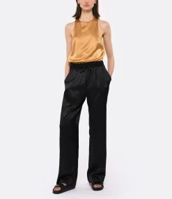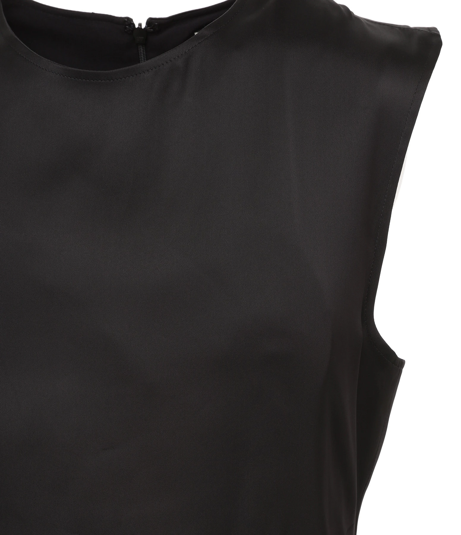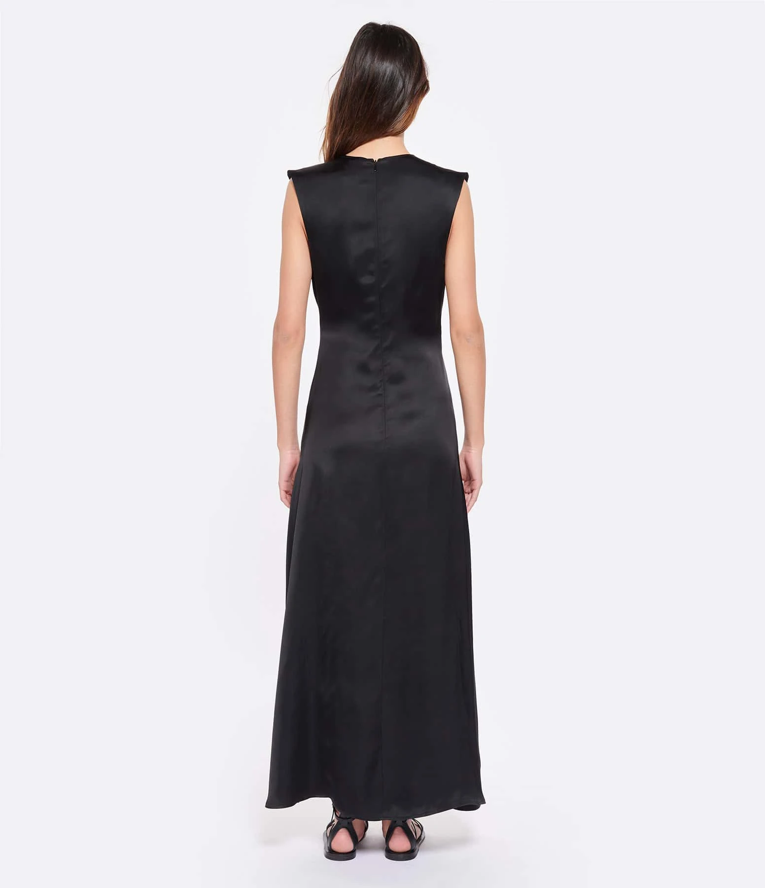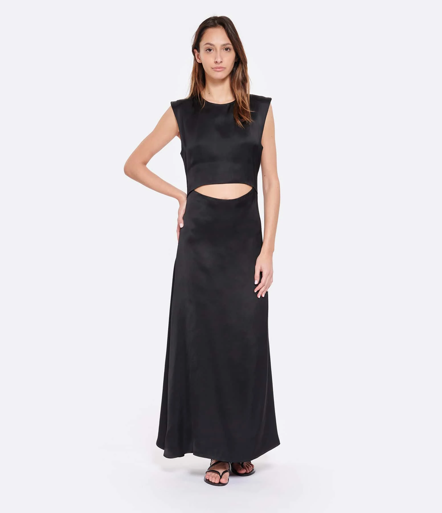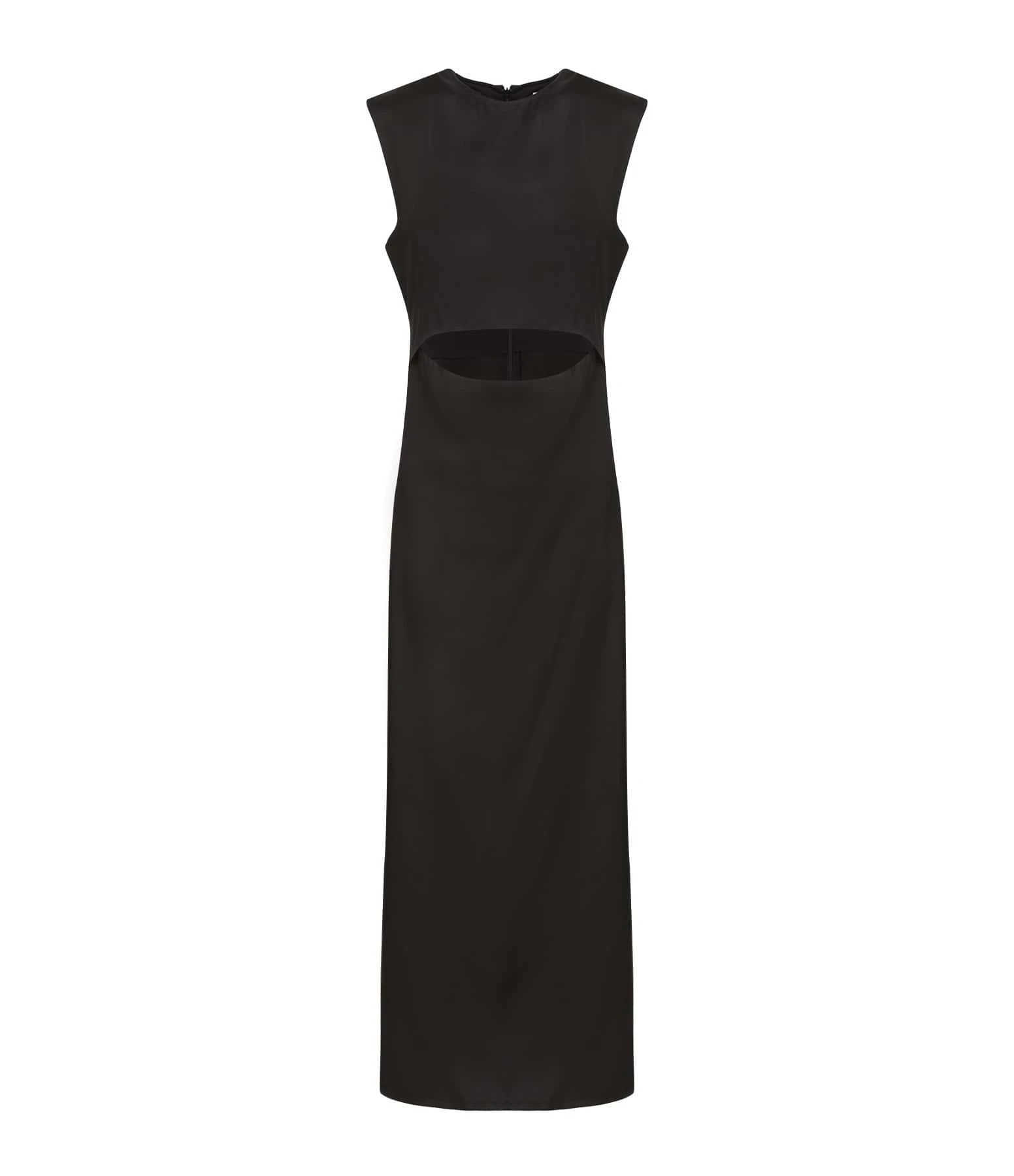 Robe longue noire satinée. Ouverte au niveau du ventre. Sans manches. Fermeture zippée invisible à l’arrière. Coupe droite.