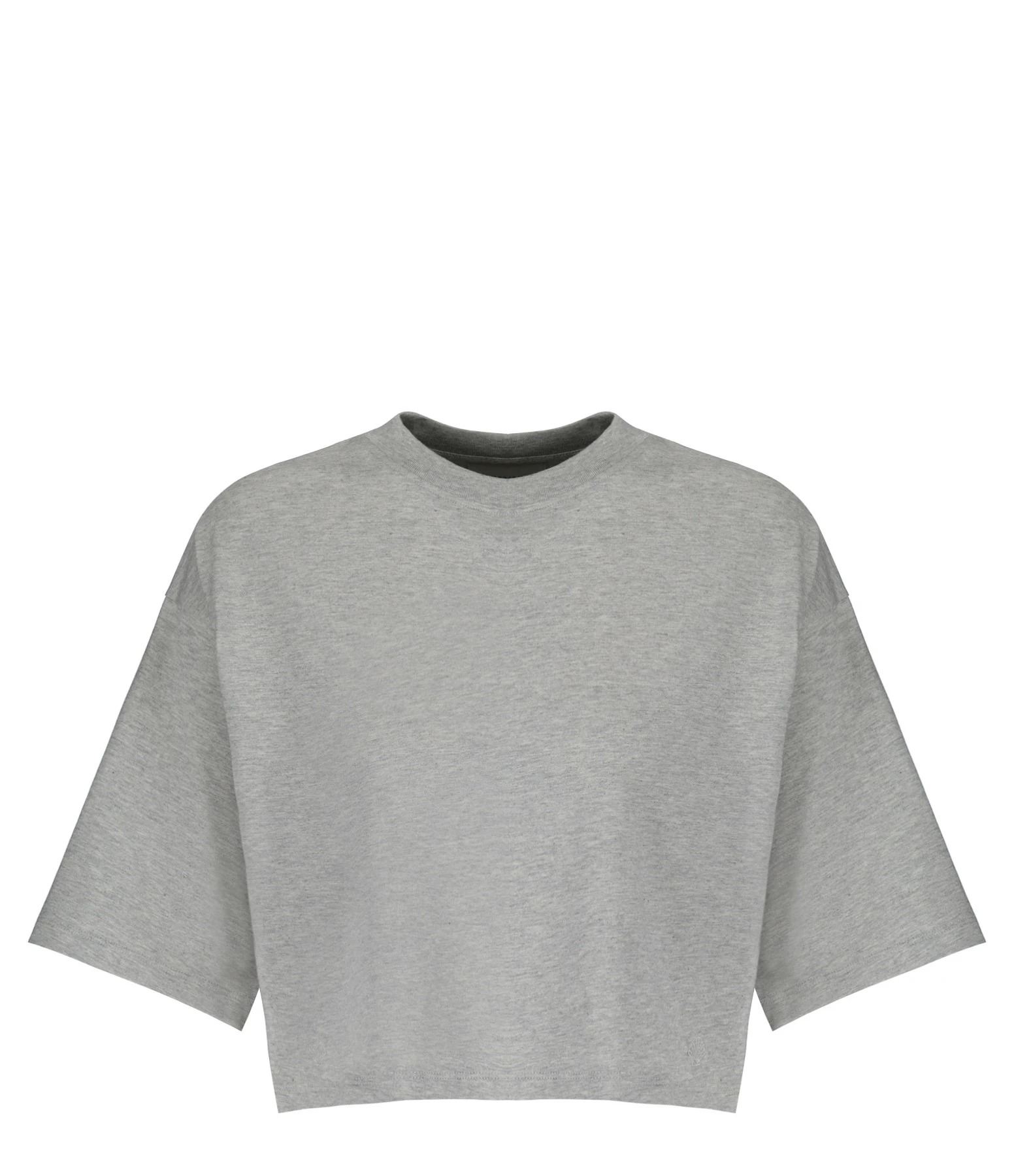 Tee-shirt en coton gris chiné avec le logo coquillage brodé ton sur ton sur le devant. Col rond côtelé. manches courtes. Coupe droite. Longueur raccourcie. Base droite.