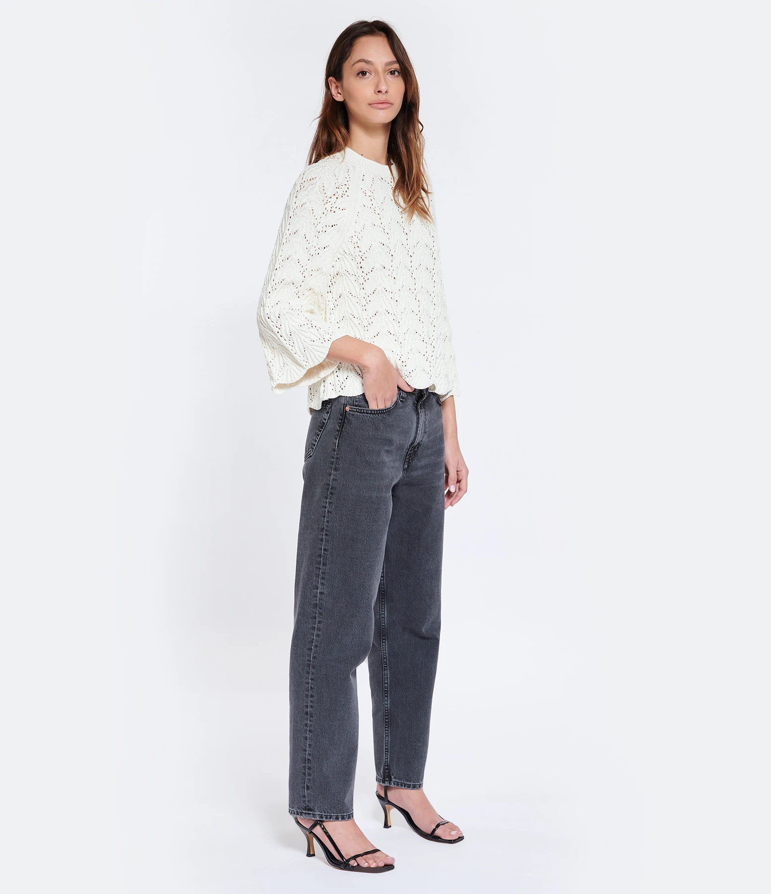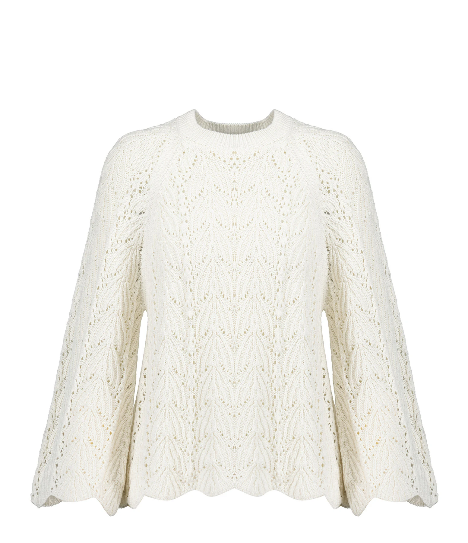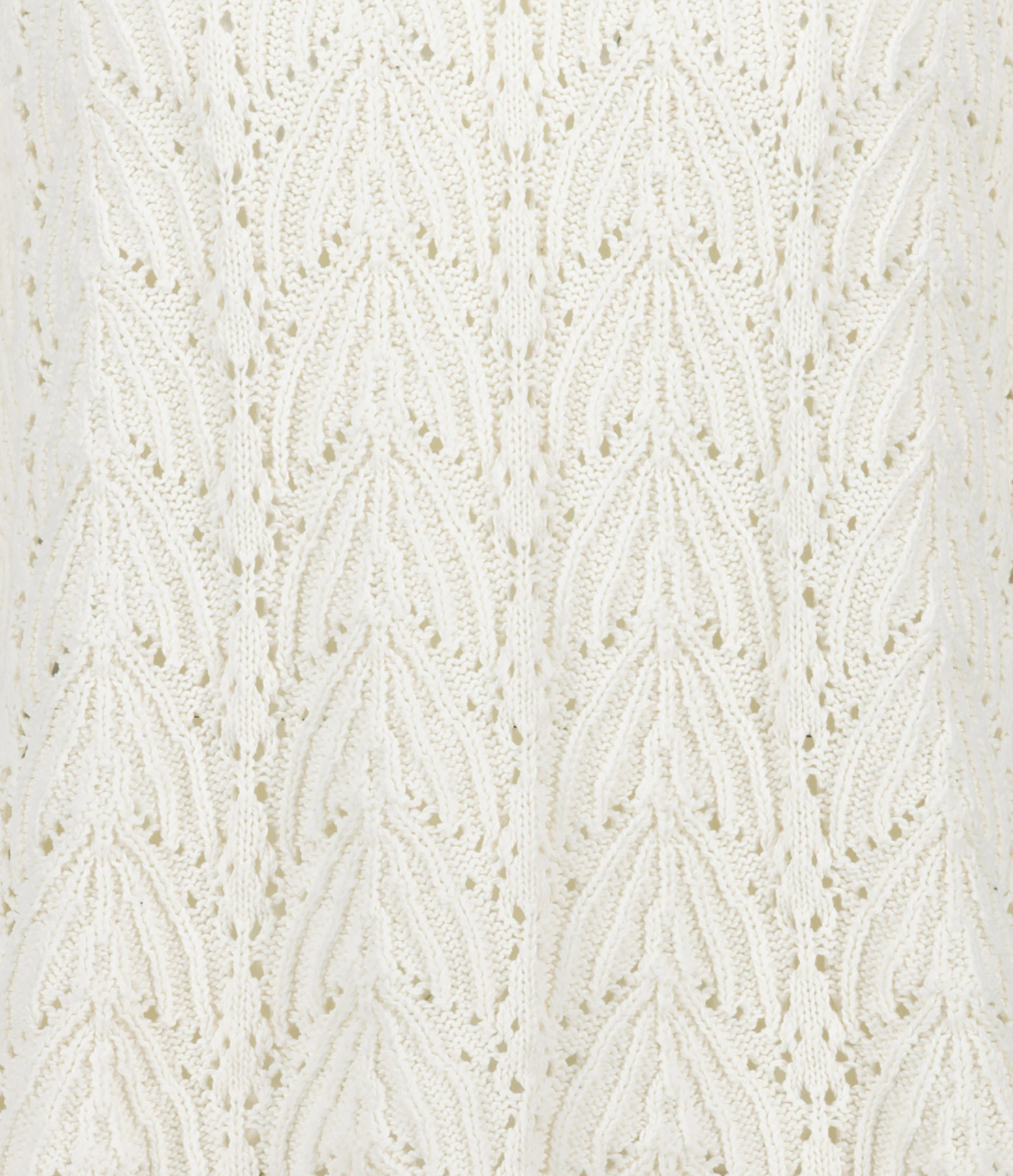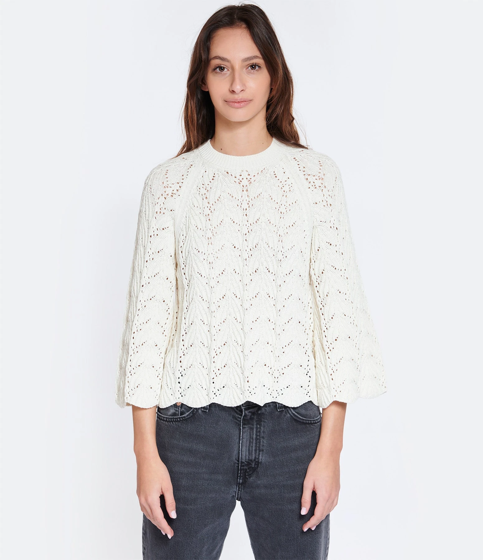 Top en coton crocheté ivoire. Col rond côtelé. Manches longues évasées avec extrémités ondulées. Coupe droite. Base légèrement ondulée.