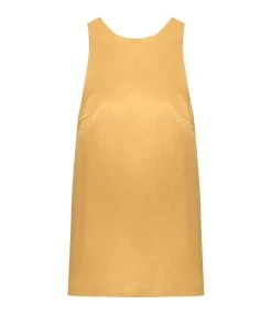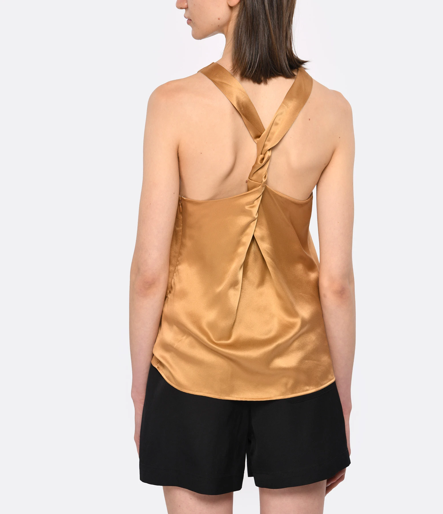 Top en soie camel à bretelles croisées dans le dos. Sans manches. Fermeture zippée invisible latérale. Coupe droite. Base droite.