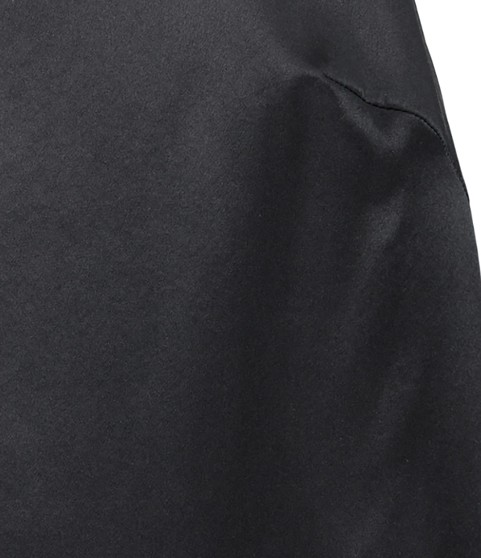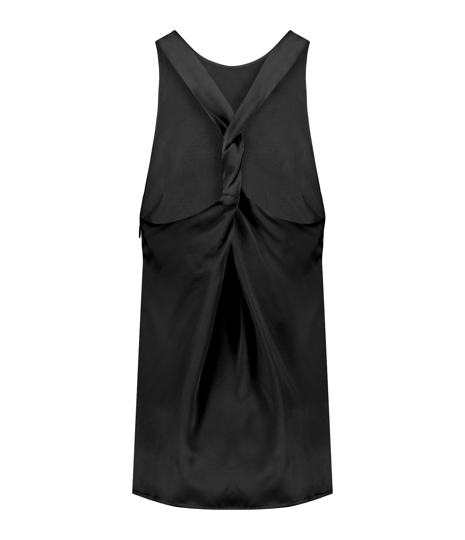 Top en soie noire à bretelles croisées dans le dos. Sans manches. Fermeture zippée invisible latérale. Coupe droite. Base droite.