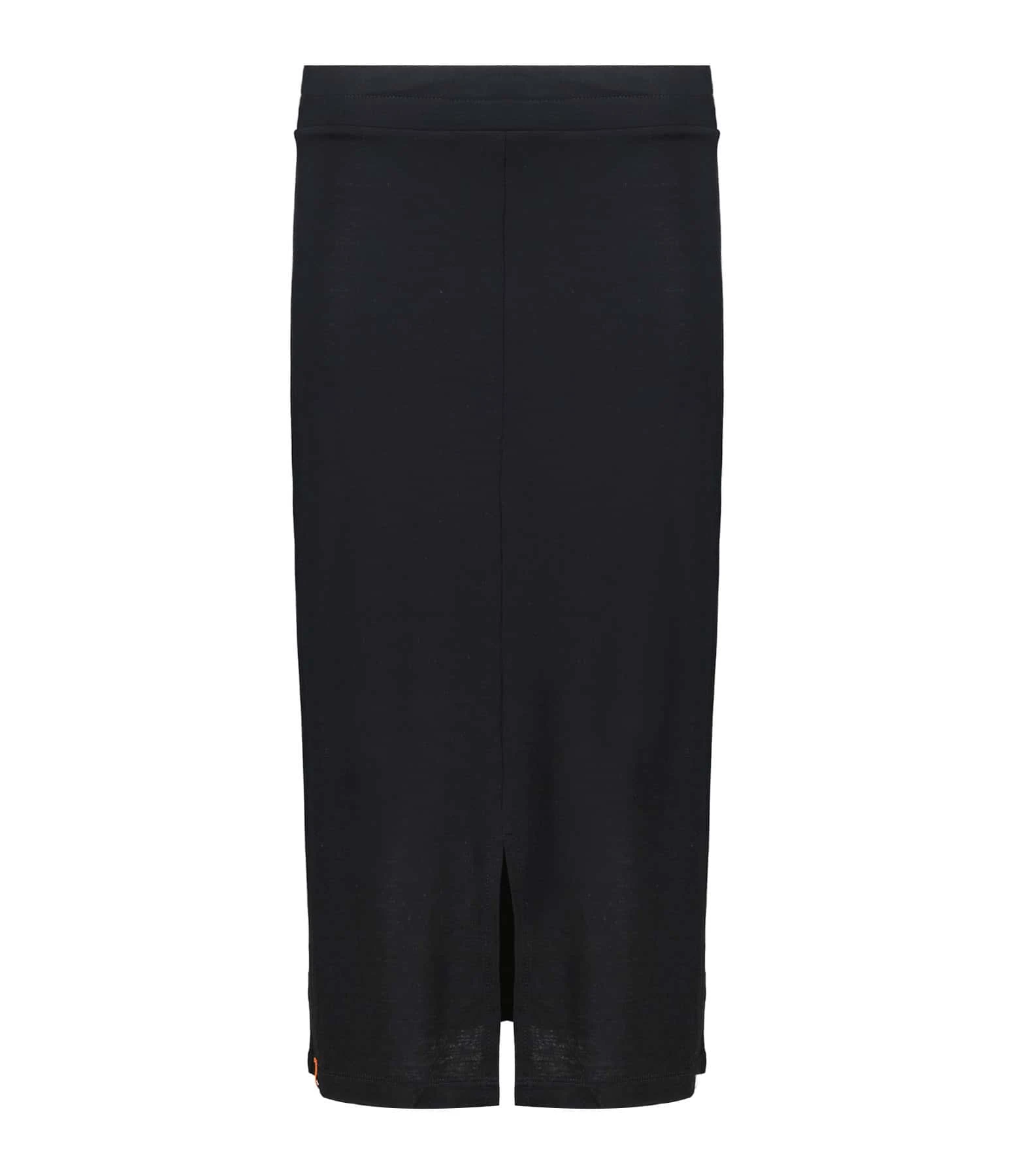 Jupe mi-longue noire. Légère fente centrale sur le devant. Taille élastiquée. Coupe droite. Base droite.