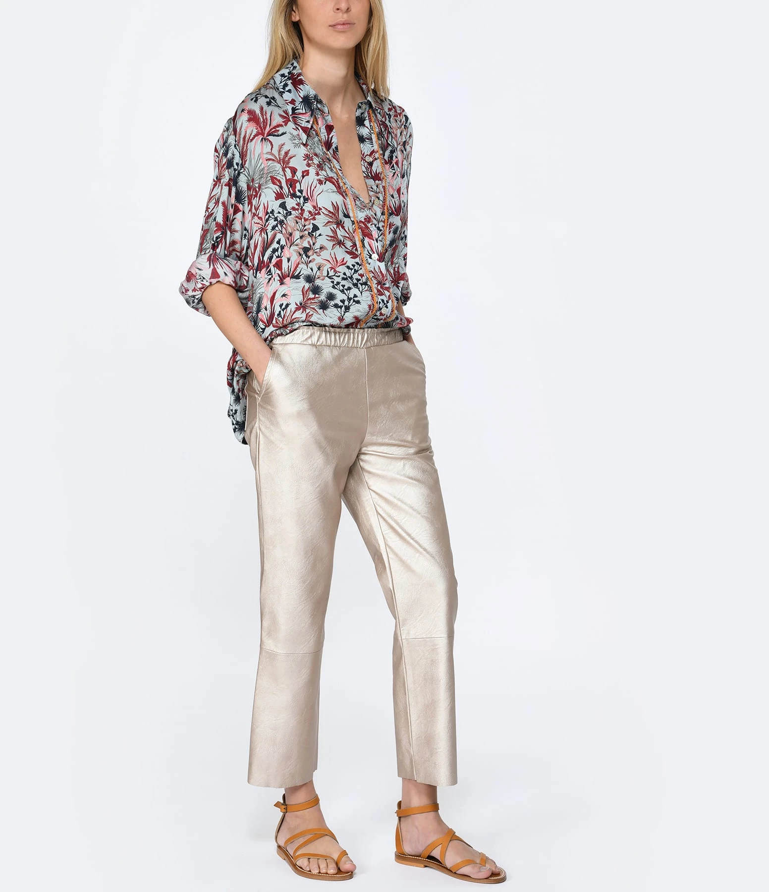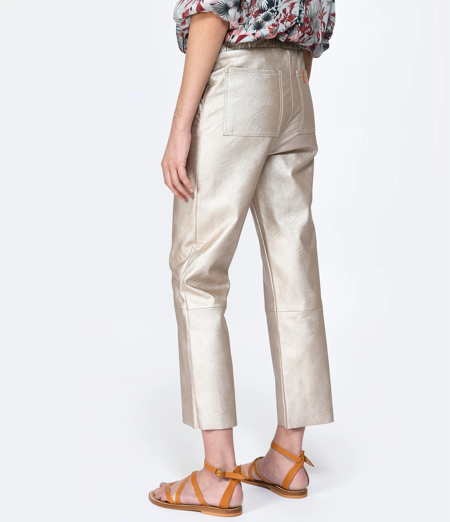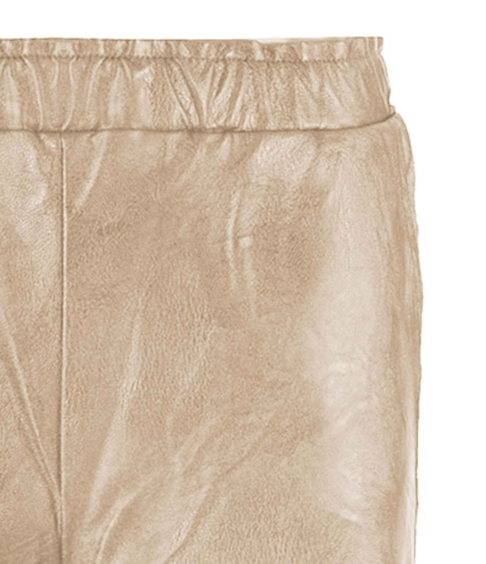 Pantalon droit en cuir vegan champagne. Taille élastiquée. Deux poches fendues et deux poches plaquées à l’arrière. Coupe droite. Base droite coupée à cru.