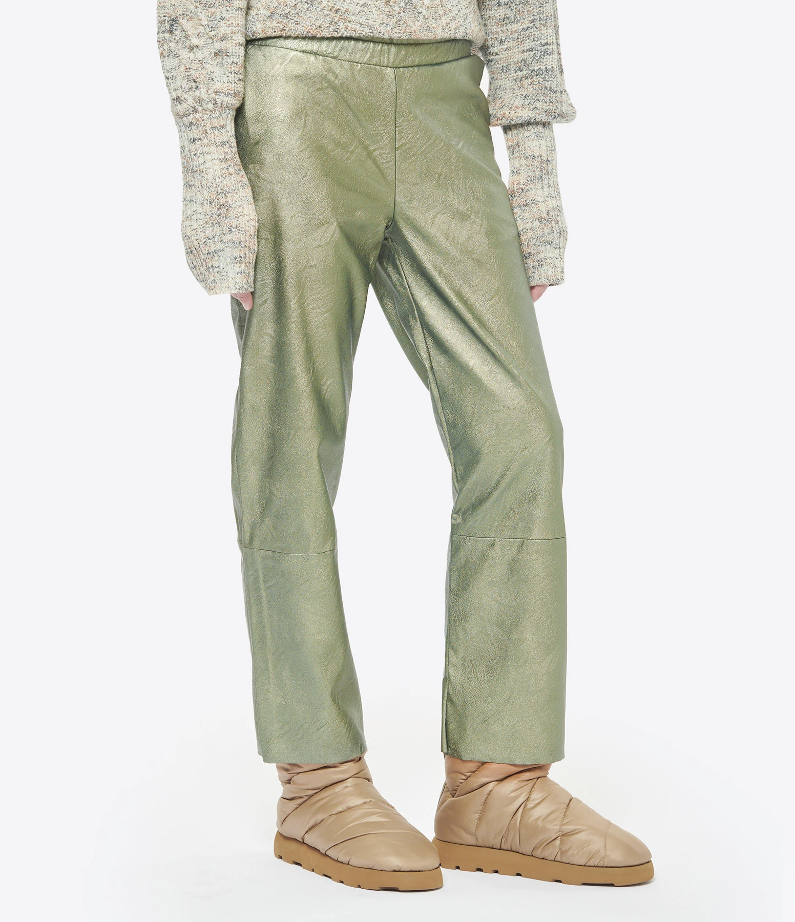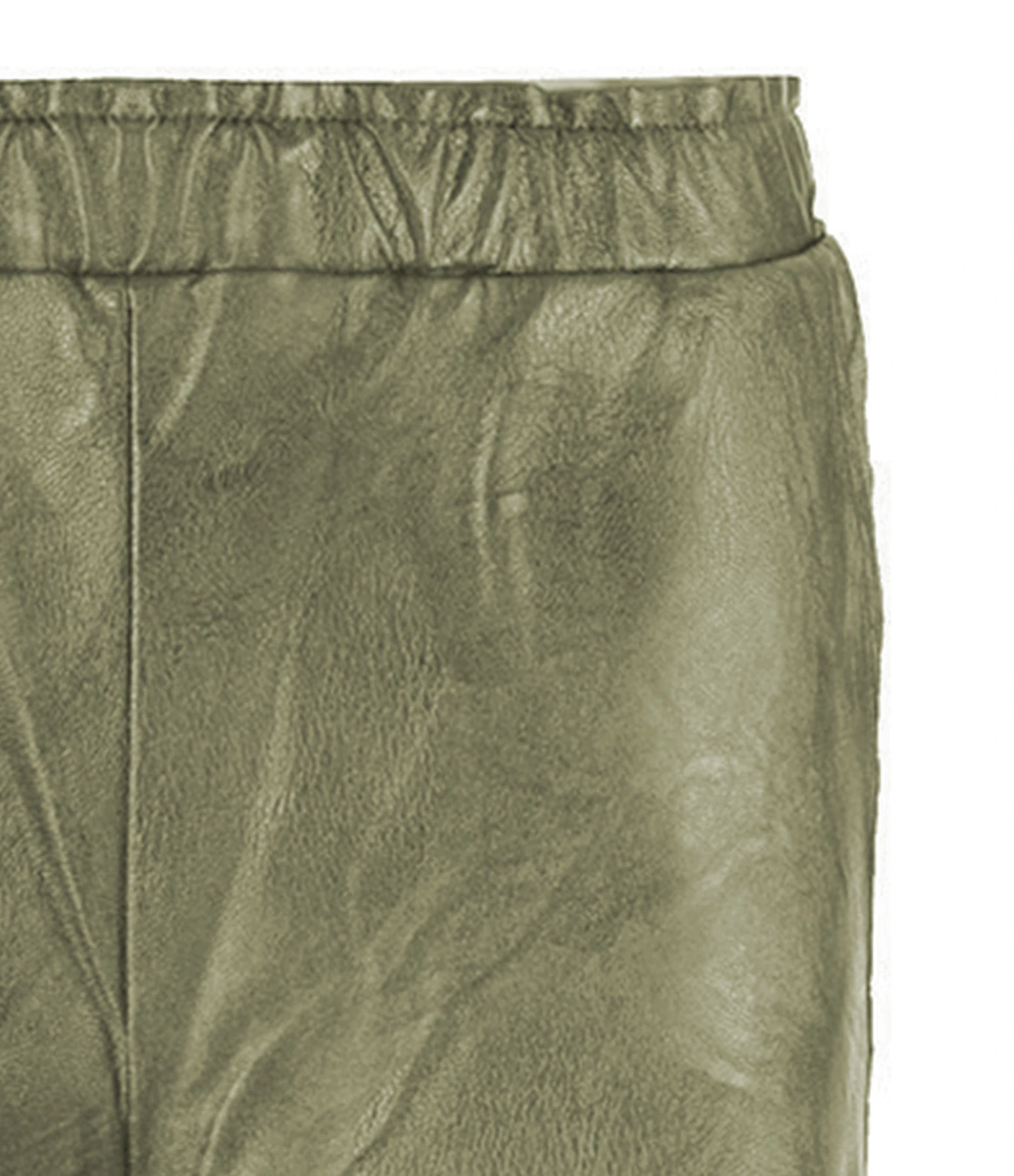 Pantalon droit en cuir vegan vert. Taille élastiquée. Deux poches fendues et deux poches plaquées à l’arrière. Coupe droite. Base droite coupée à cru.