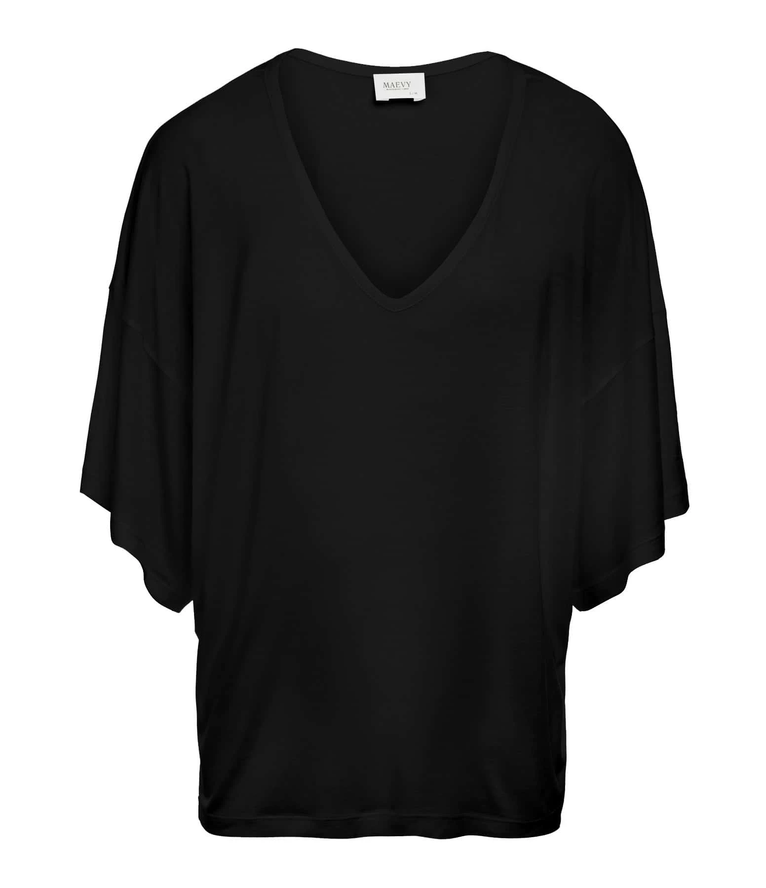 Tee-shirt en bambou noir. Col en V. Manches courtes. Coupe oversize. Base droite.