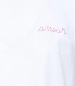 Short bleu marine. Broderie verte « amour toujours » au bas. Taille élastiquée avec cordons de serrage. Deux poches à l’avant. Coupe droite. Base droite.