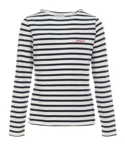 Marinière en coton écru à rayures bleues marines. Broderie « amour » côté cœur. Manches longues. Col bateau. Coupe droite. Base droite.