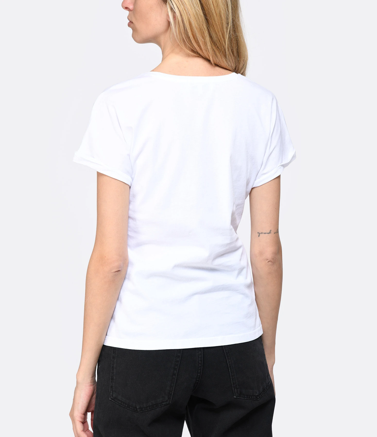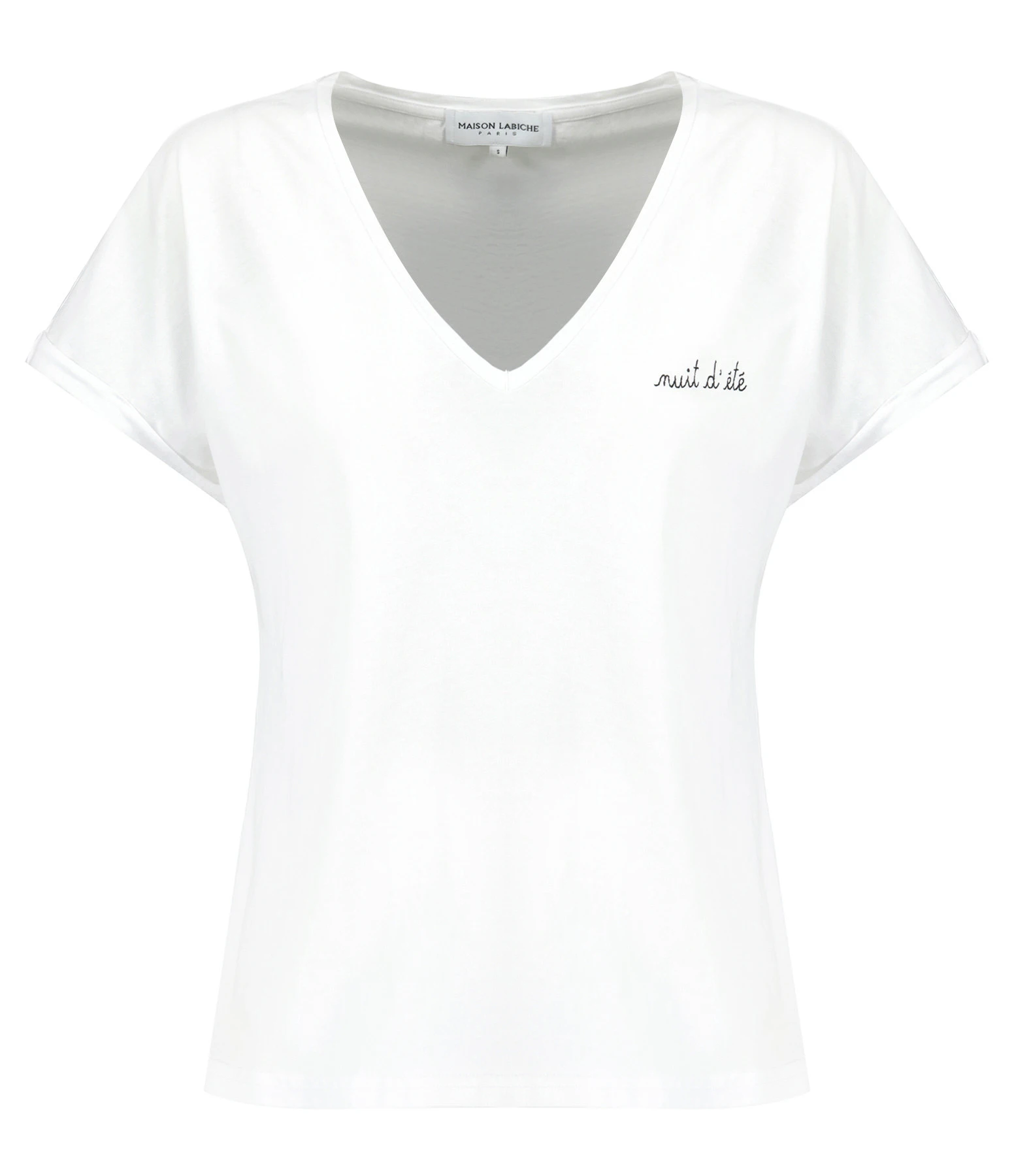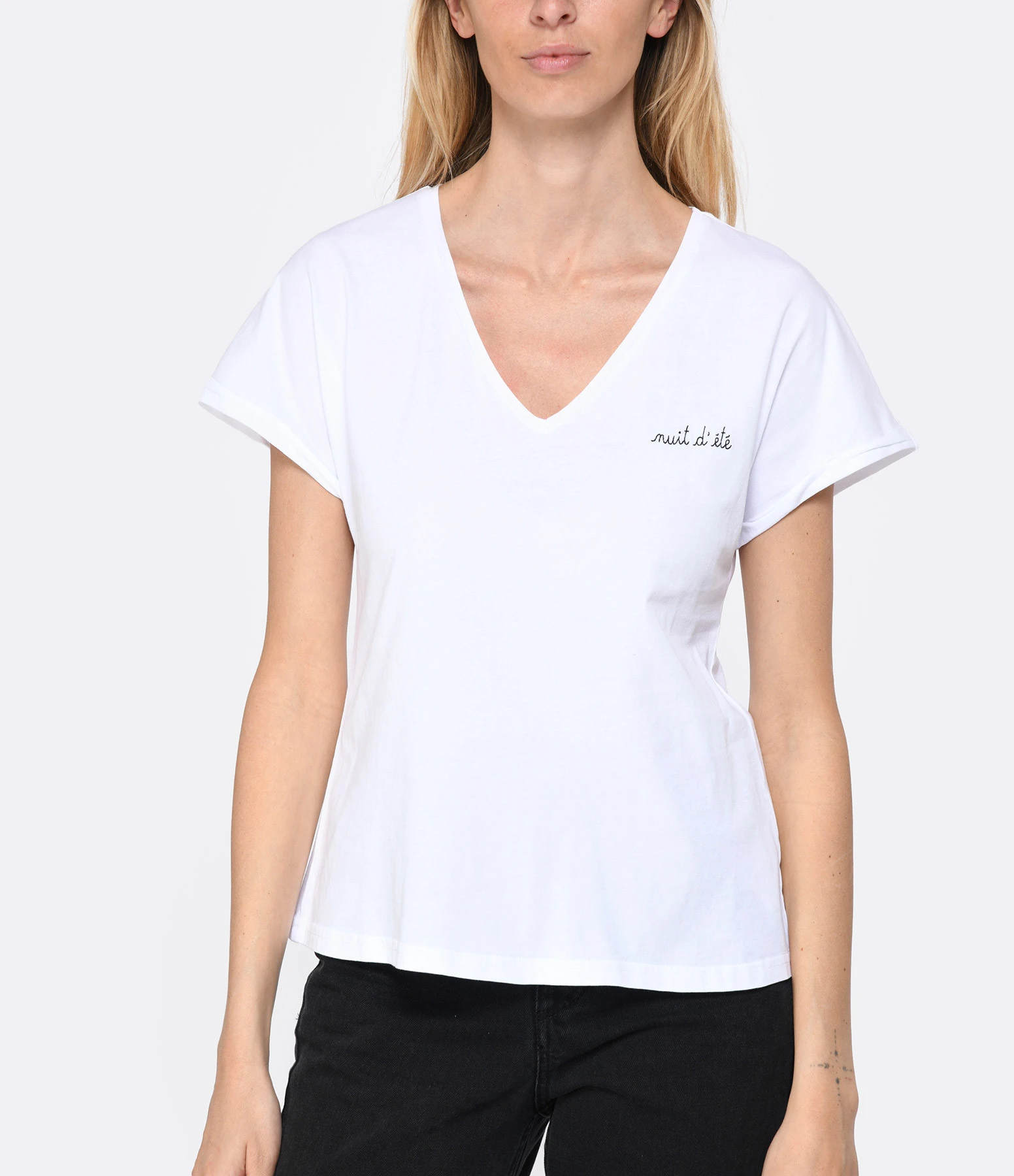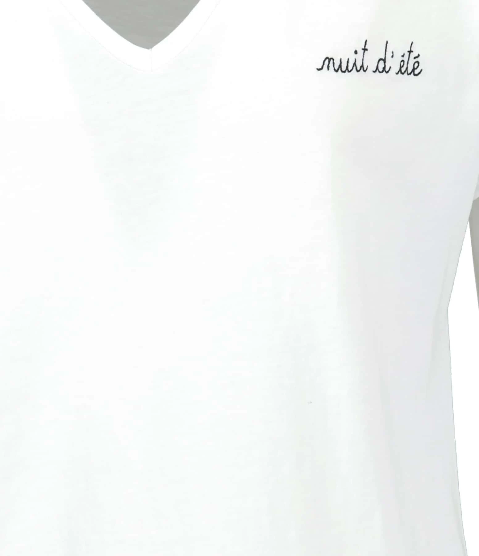 Tee-shirt à manches courtes blanc. Broderie noire « nuit d’été » côté cœur sur le devant. Col en V. Manches courtes. Coupe droite. Base droite.