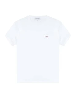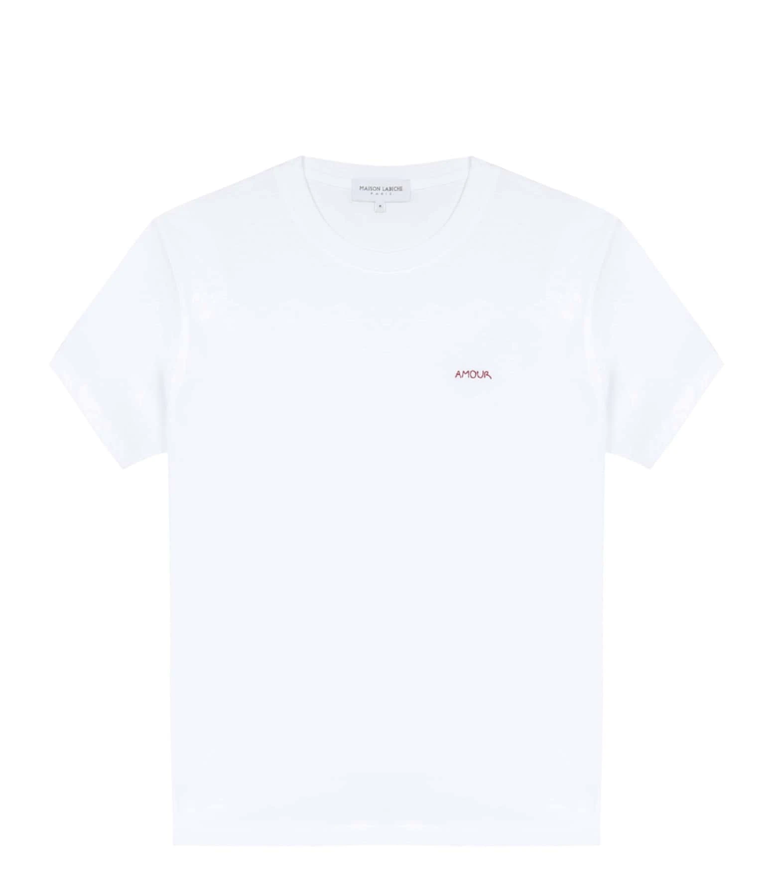 Tee-shirt en coton blanc. Broderie rouge « AMOUR » côté cœur. Col rond. Manches courtes. Coupe droite. Base droite.
