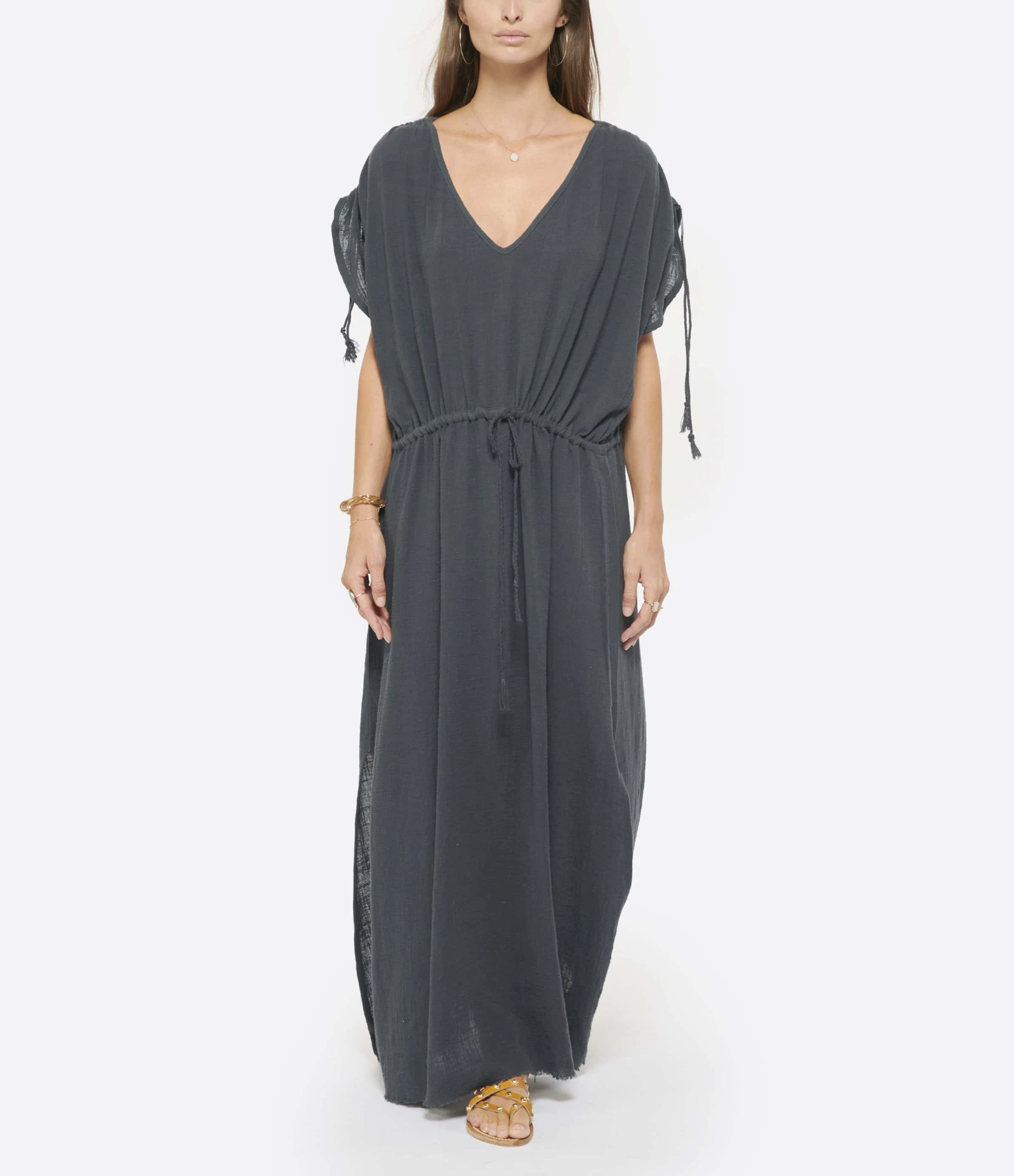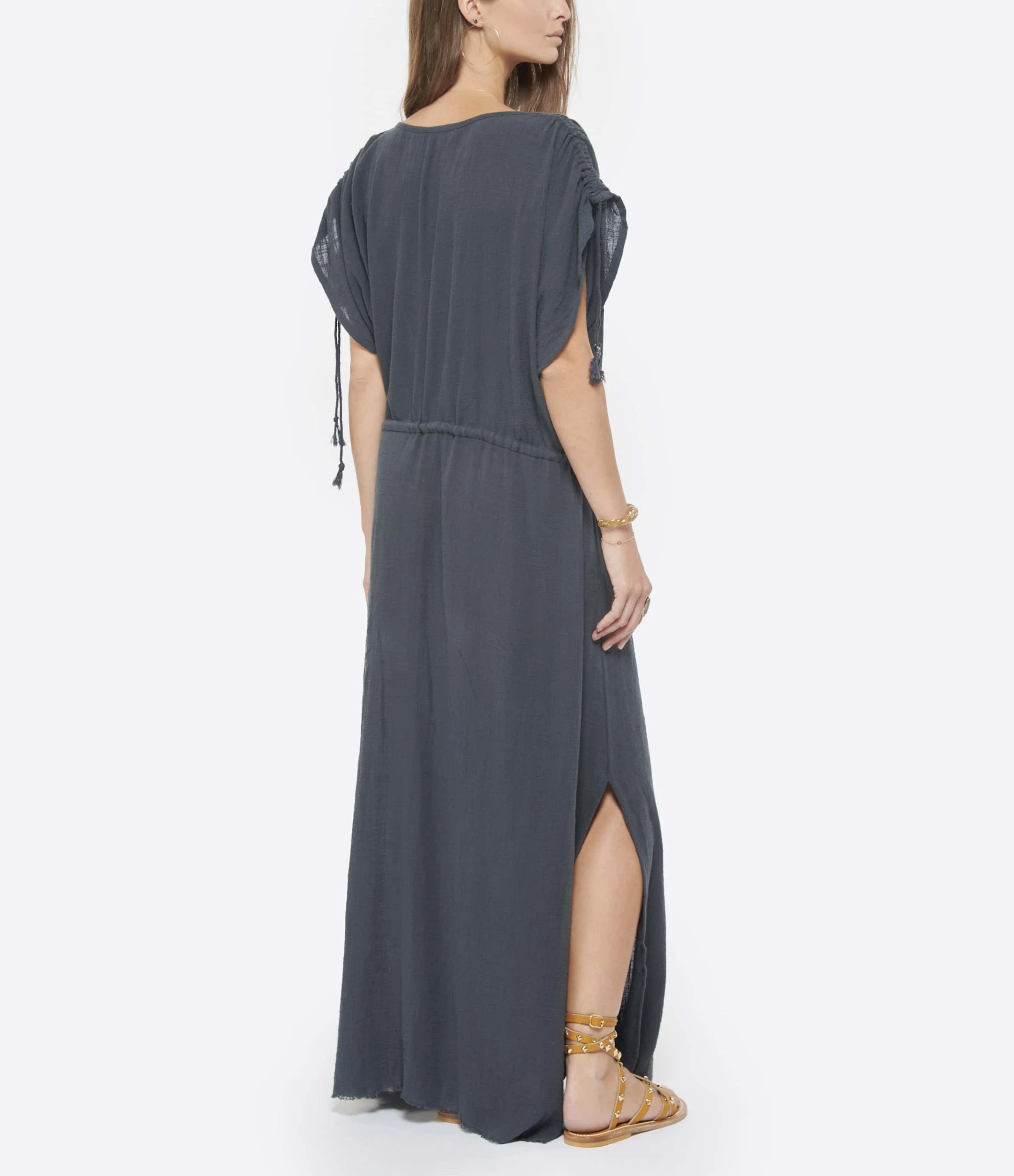 Robe longue en coton bleu. Col en V. Manches courtes tombantes froncées avec lanières d’ajustement tressées. Lien de serrage à nouer à la taille. Coupe droite ample. Base droite avec bords frangés. Fentes latérales. Non doublée.