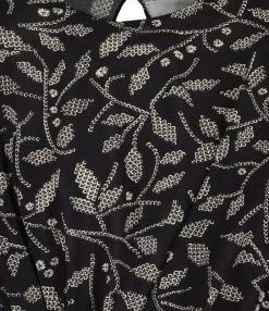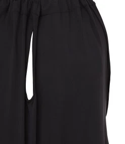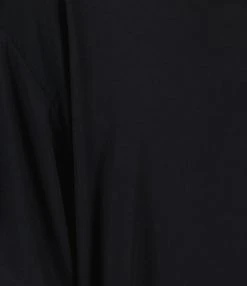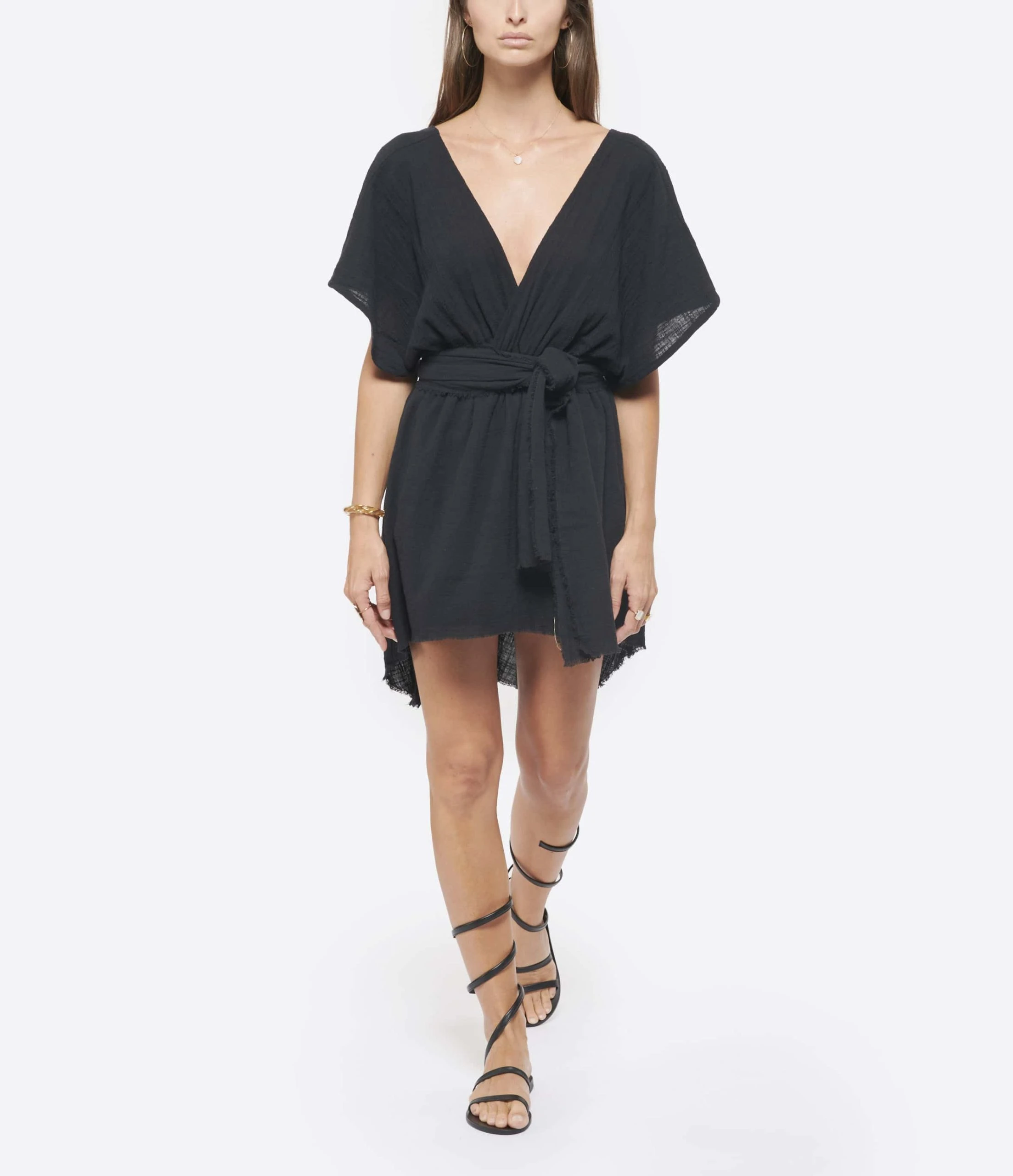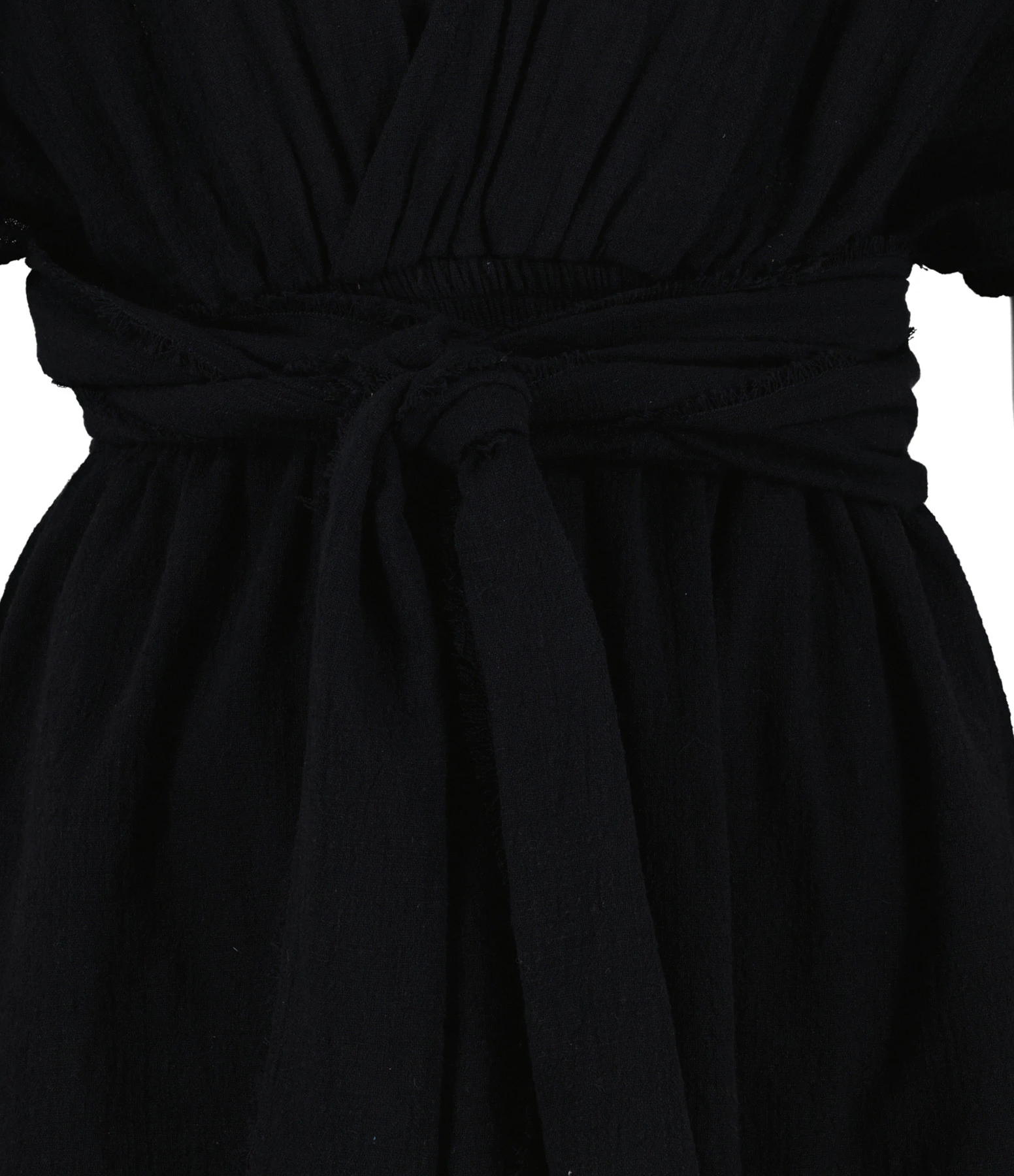 Robe courte en coton noir. Col et dos en V. Manches courtes chauve-souris. Taille haute sous poitrine élastique avec ceinture longue amovible. Non doublé.