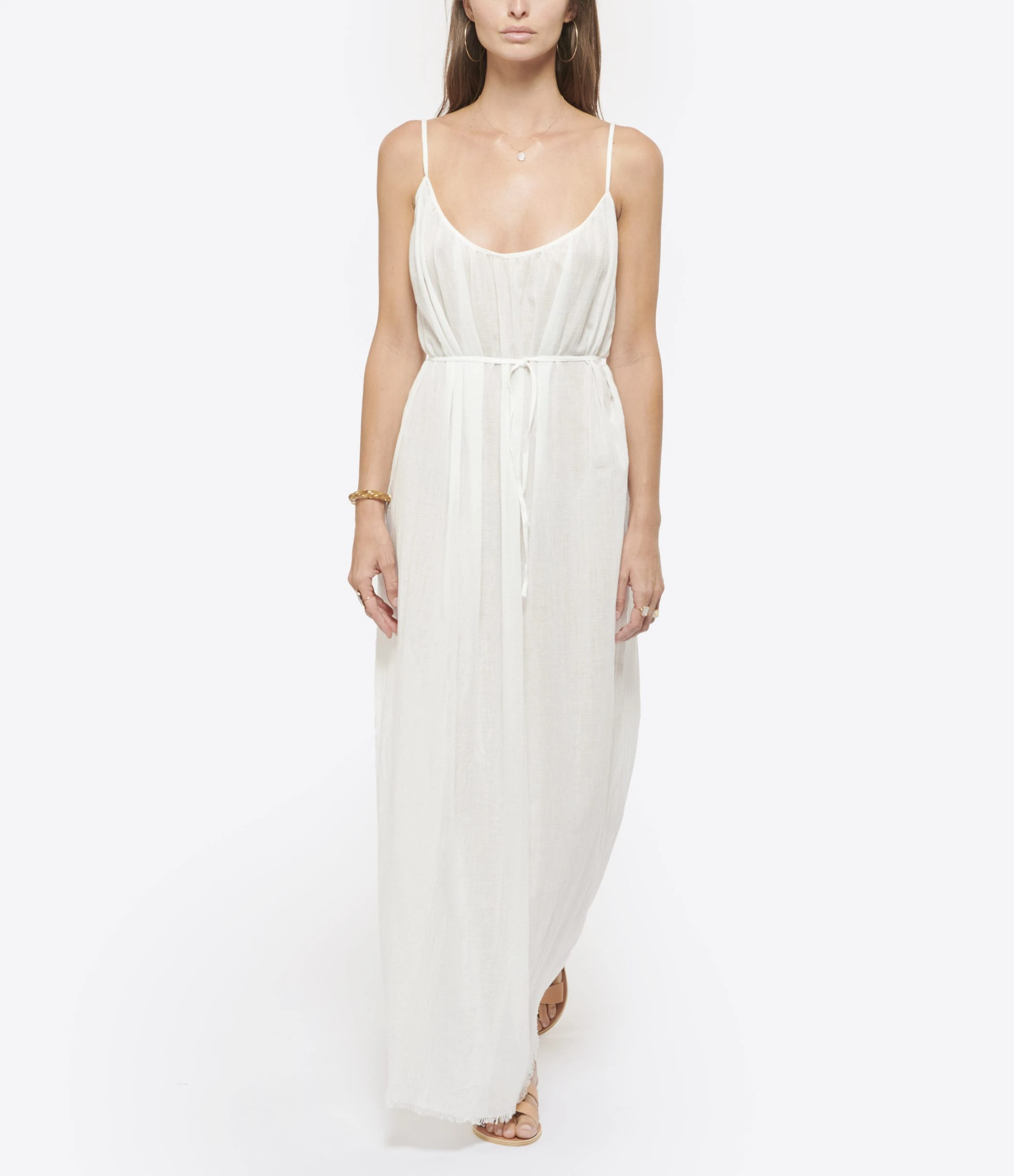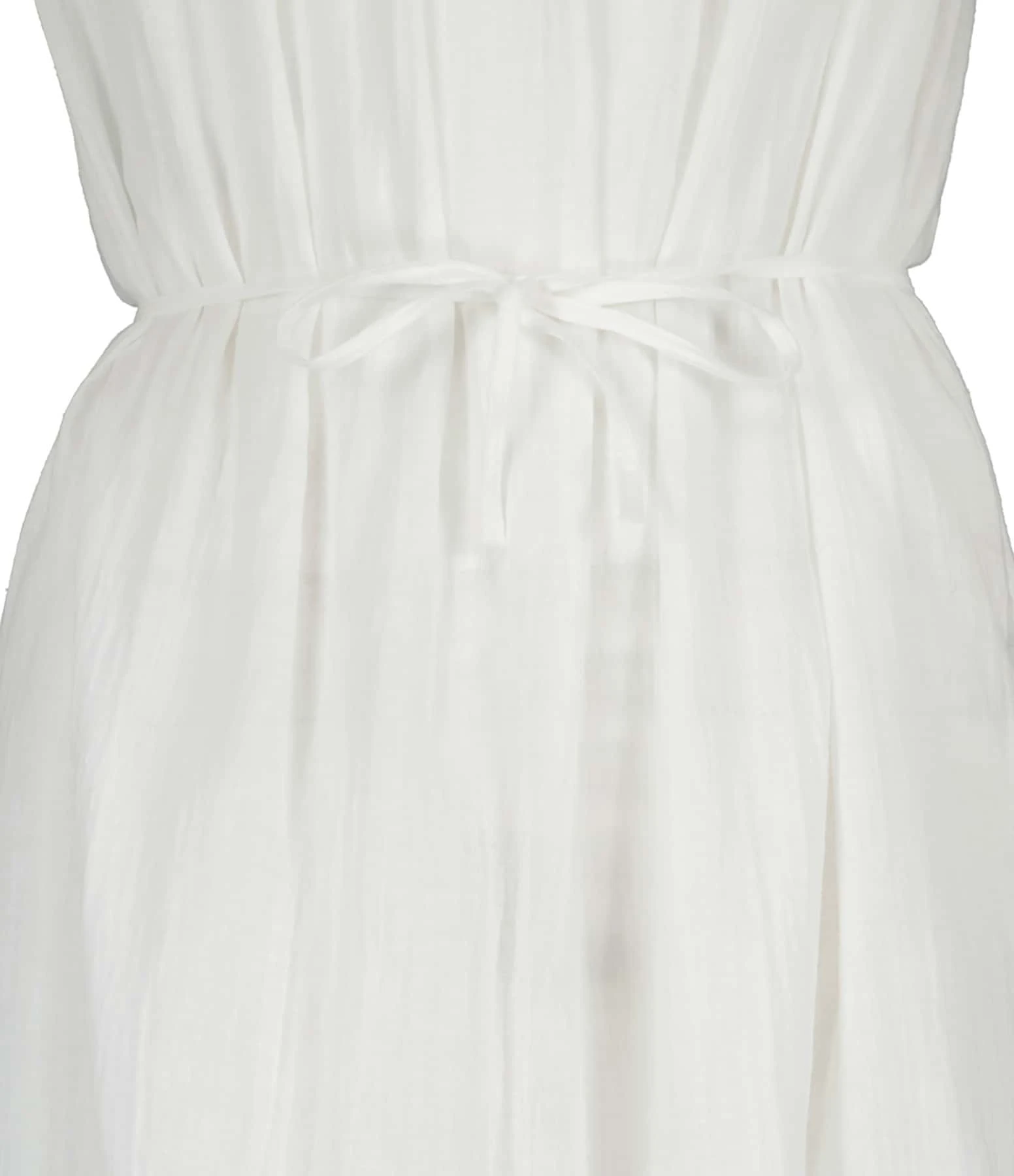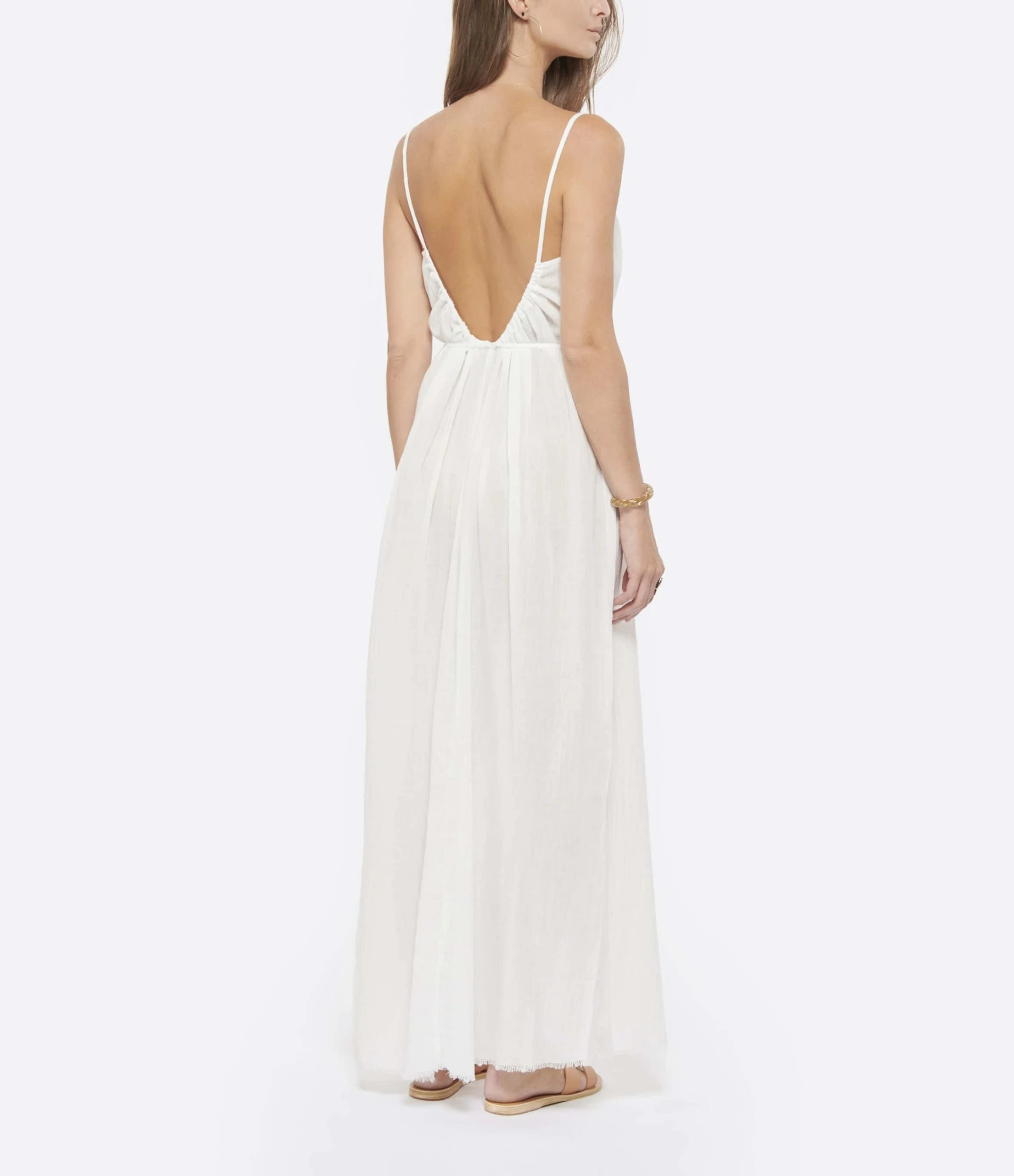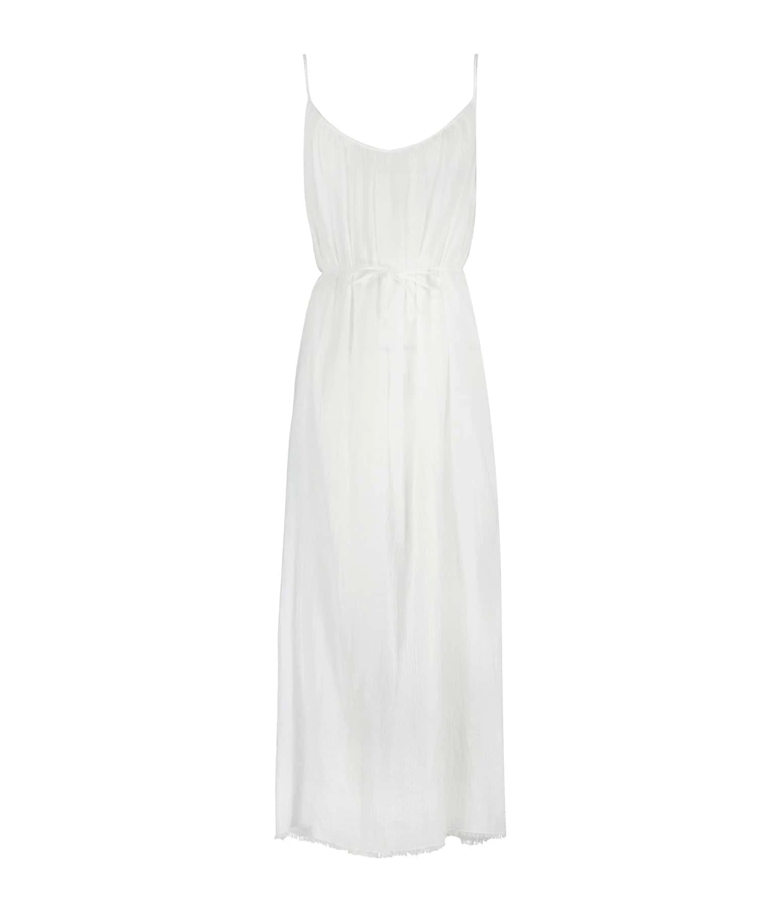 Robe longue en coton blanc. Col rond. Sans manches. Fines bretelles. Dos nu en U froncé avec lanières d’ajustement pouvant être nouées autour de la taille. Coupe droite ample. Base droite. Finitions brutes. Non doublée. Tissu respirant légèrement transparent.