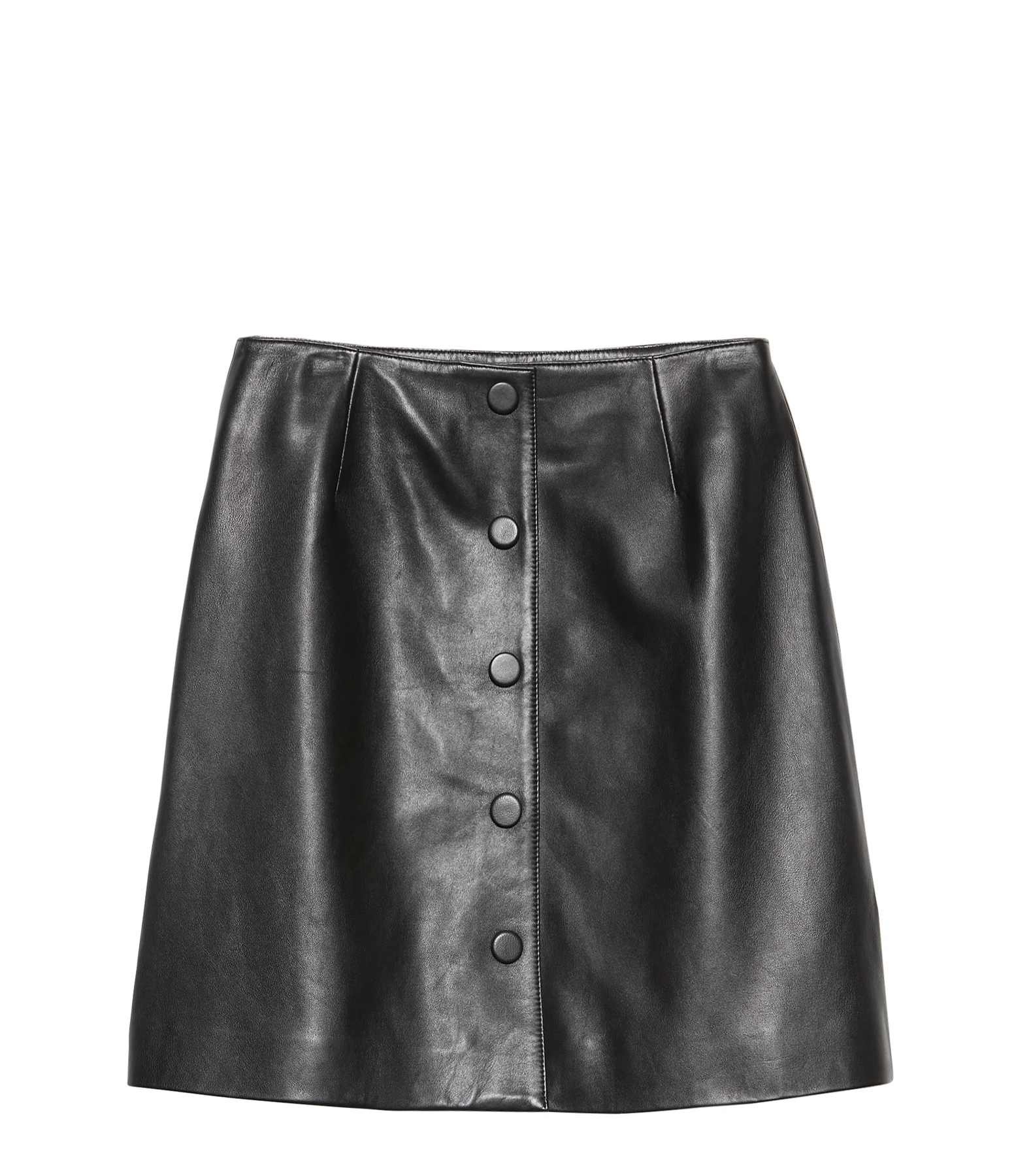 Jupe courte en cuir lisse noir. Fermeture pressionnée milieu devant. Boutons pression recouverts de cuir lisse noir. Coupe droite. Base droite. Doublée.