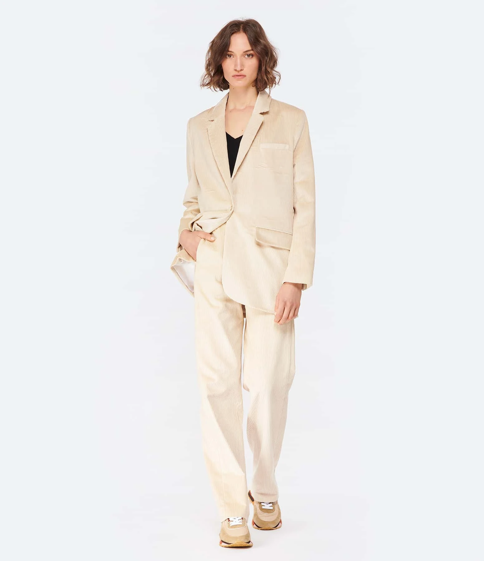 Pantalon à pinces en velours côtelé beige. Passants pour ceinture. Braguette zippée et crochet. Deux poches invisibles sur le devant. Deux poches passepoilées boutonnées dans le dos. Petits boutons beiges effet corne. Coupe droite. Base droite.