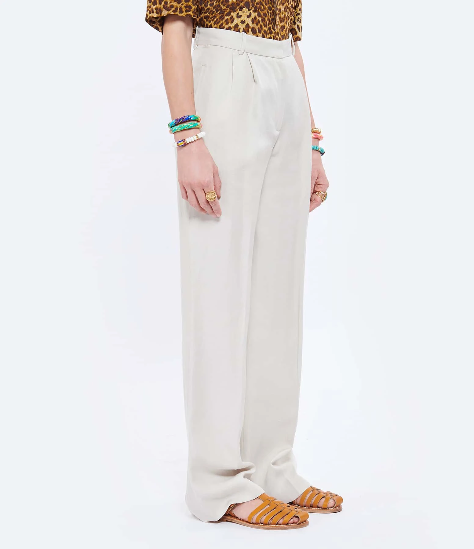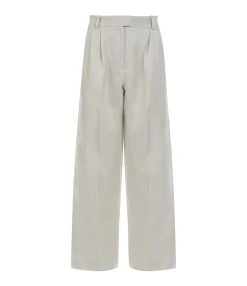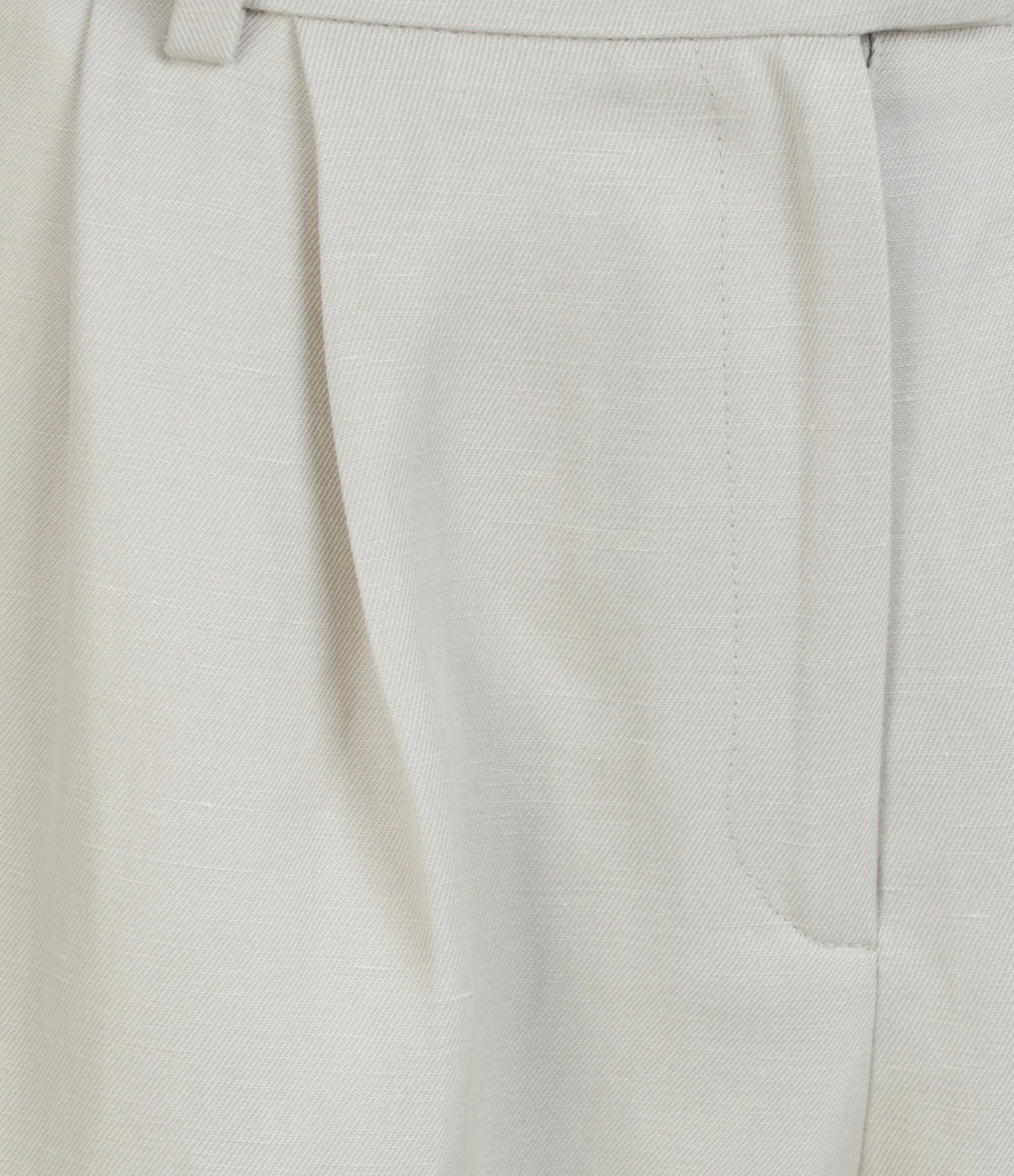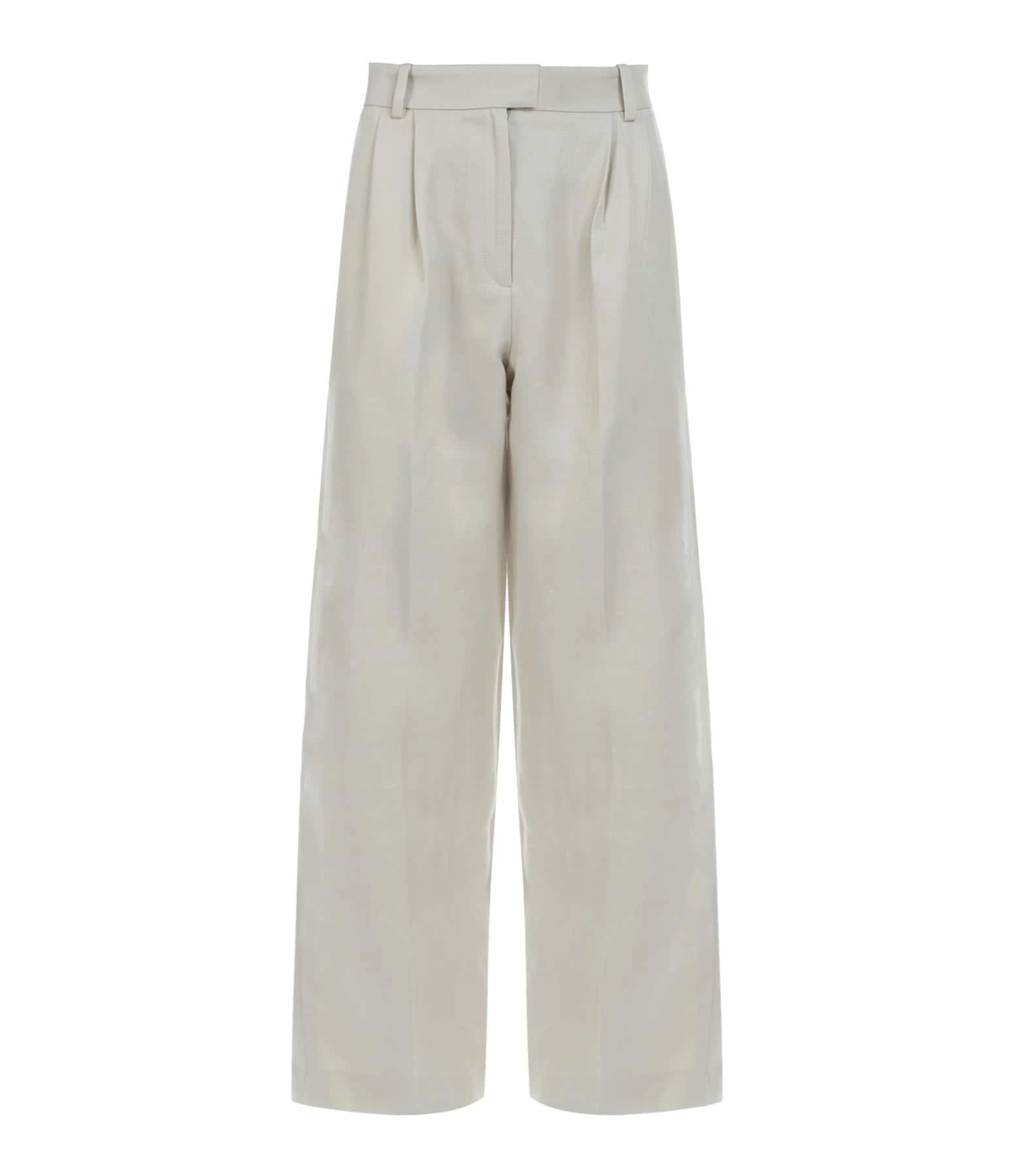 Pantalon à pinces en lin beige. Taille haute. Passants pour ceinture. Deux poches fendues. Une poche passepoilée à l’arrière. Fermeture par zip et agrafes. Coupe large. Base droite. Doublé.