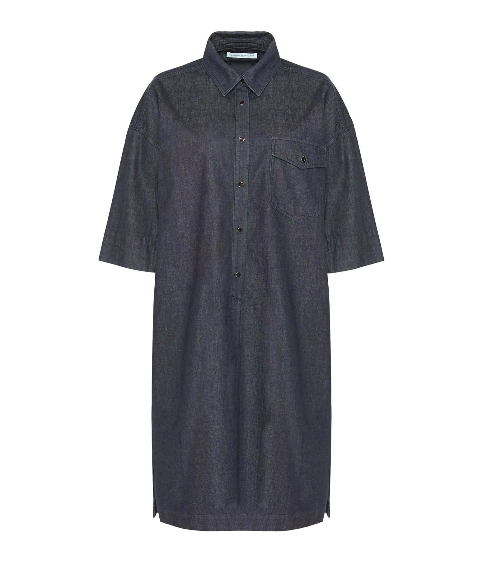 Robe en denim bleu brut. Col chemise. Manches 3/4. Fermeture boutonnée. Deux poches plaquées à rabats boutonnés sur la poitrine et deux poches fendues. Coupe droite. Base droite.