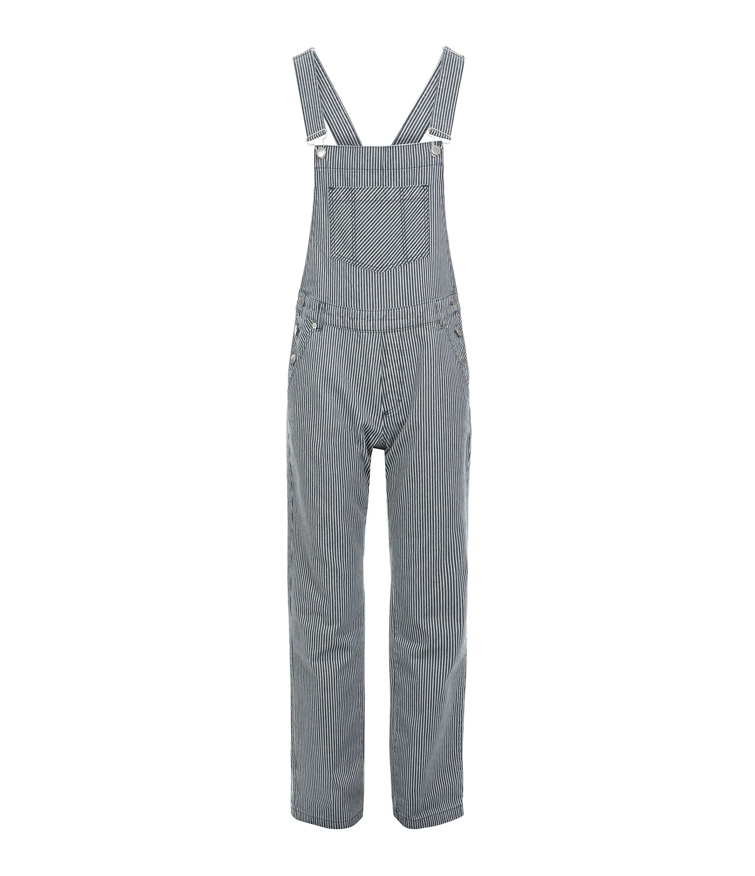Salopette en denim rayée bleu et blanc. Coupe et fourche larges. Fermeture par bretelles réglables ornées de boucles en métal. Boutons au niveau des hanches. Deux poches à l’italienne sur l’avant et deux poches plaquées à l’arrière. Une grande poche poitrine. Non doublée.
