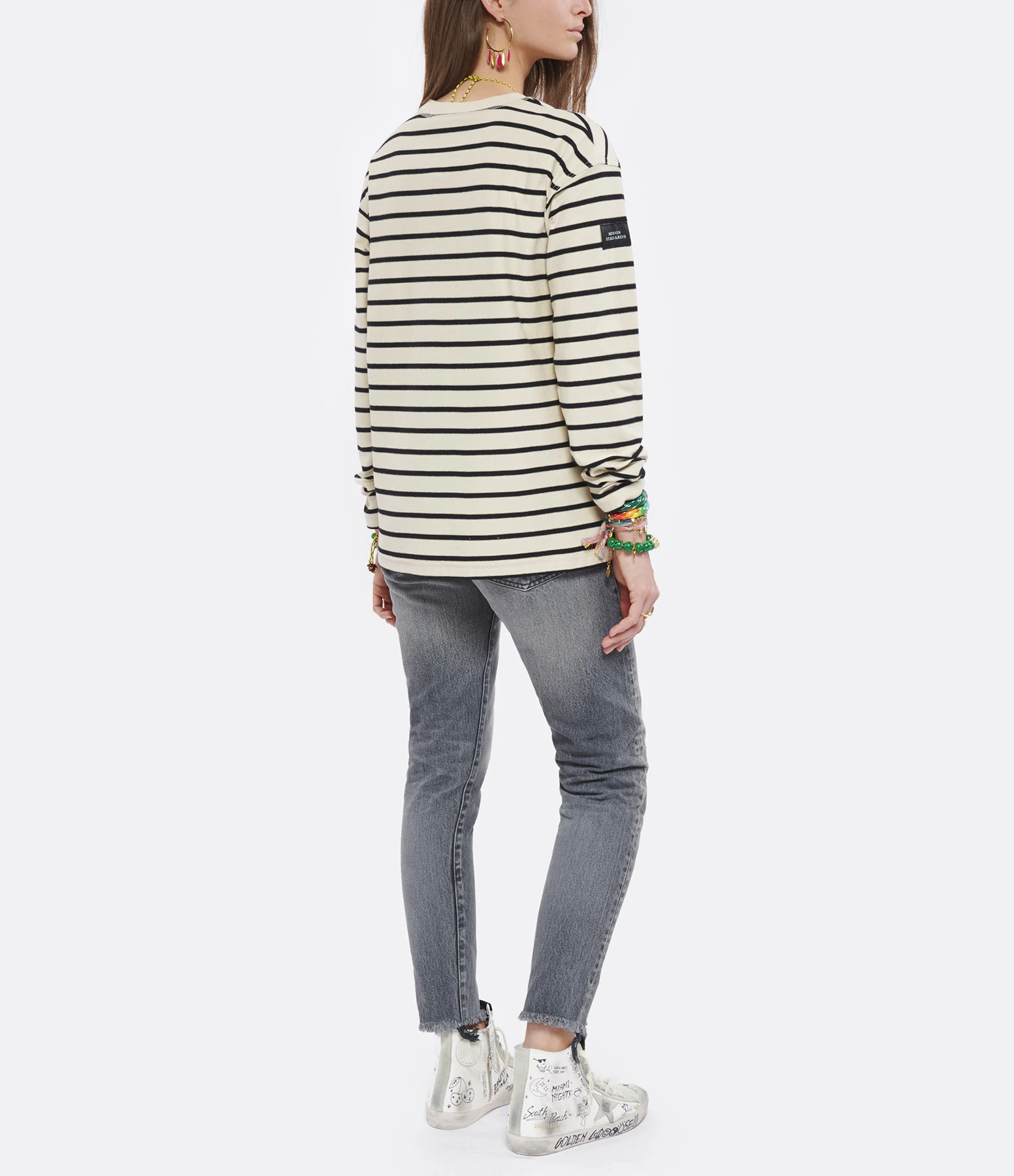 Tee-shirt en coton beige à rayures noires. Manches longues. Col rond côtelé. Coupe droite. Base droite.