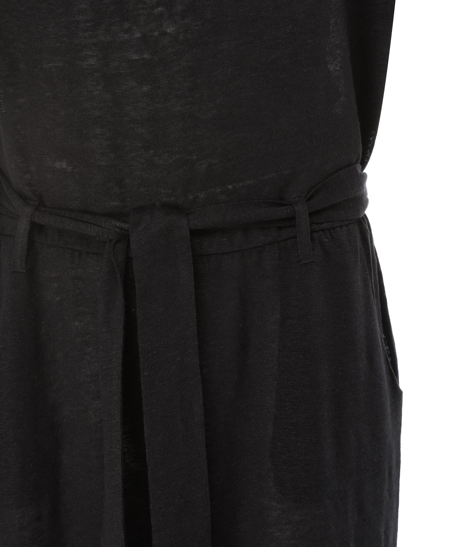 Combinaison longue en lin noir. Décolleté en V. Taille ajustable par cordons à nouer. Coupe évasée. Base droite.