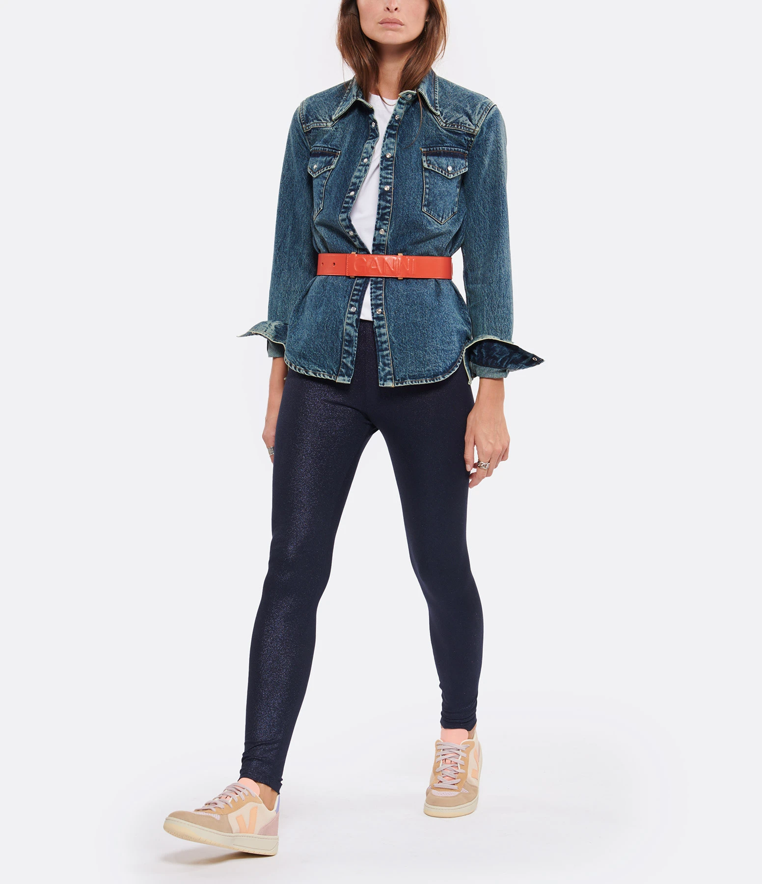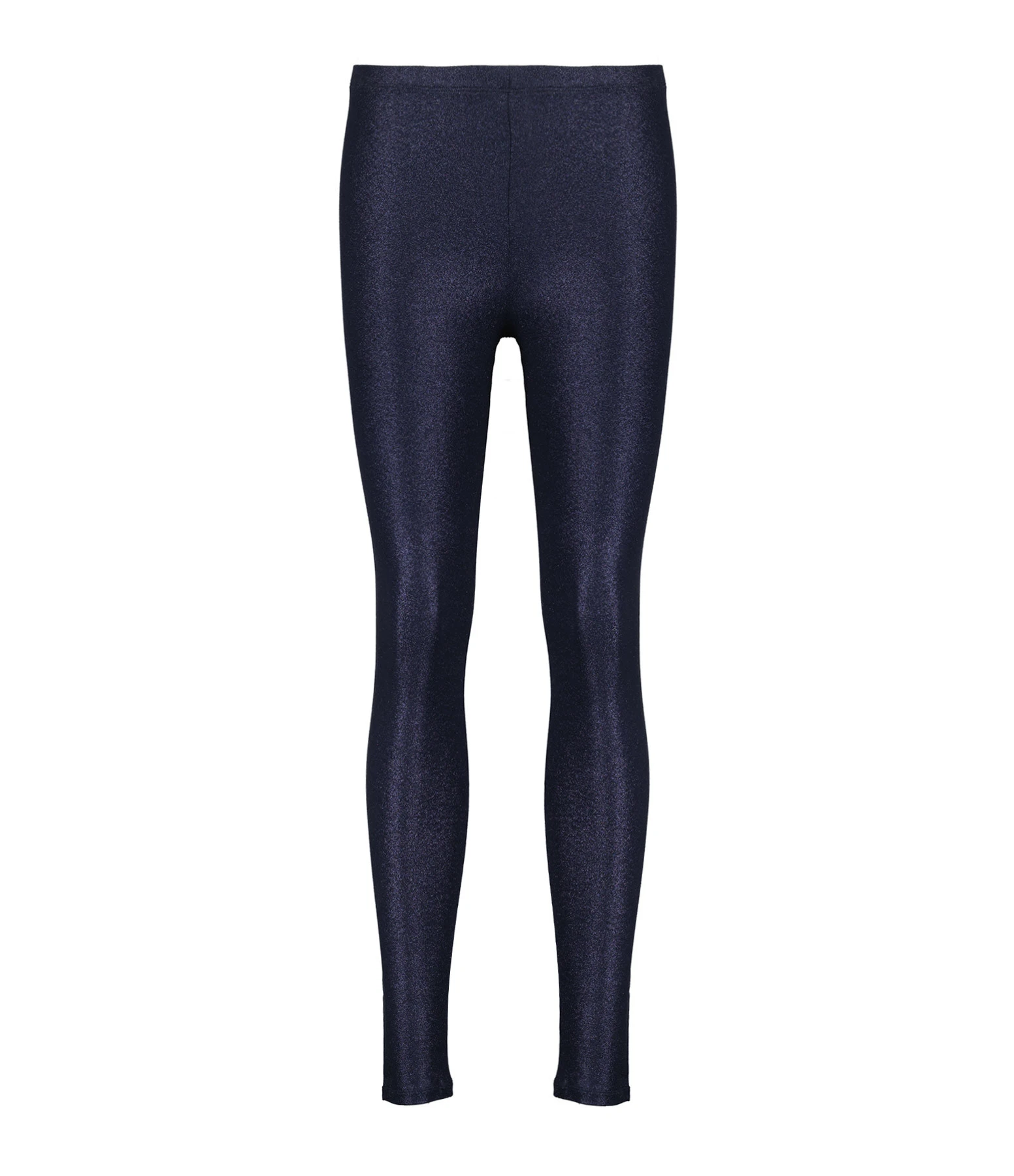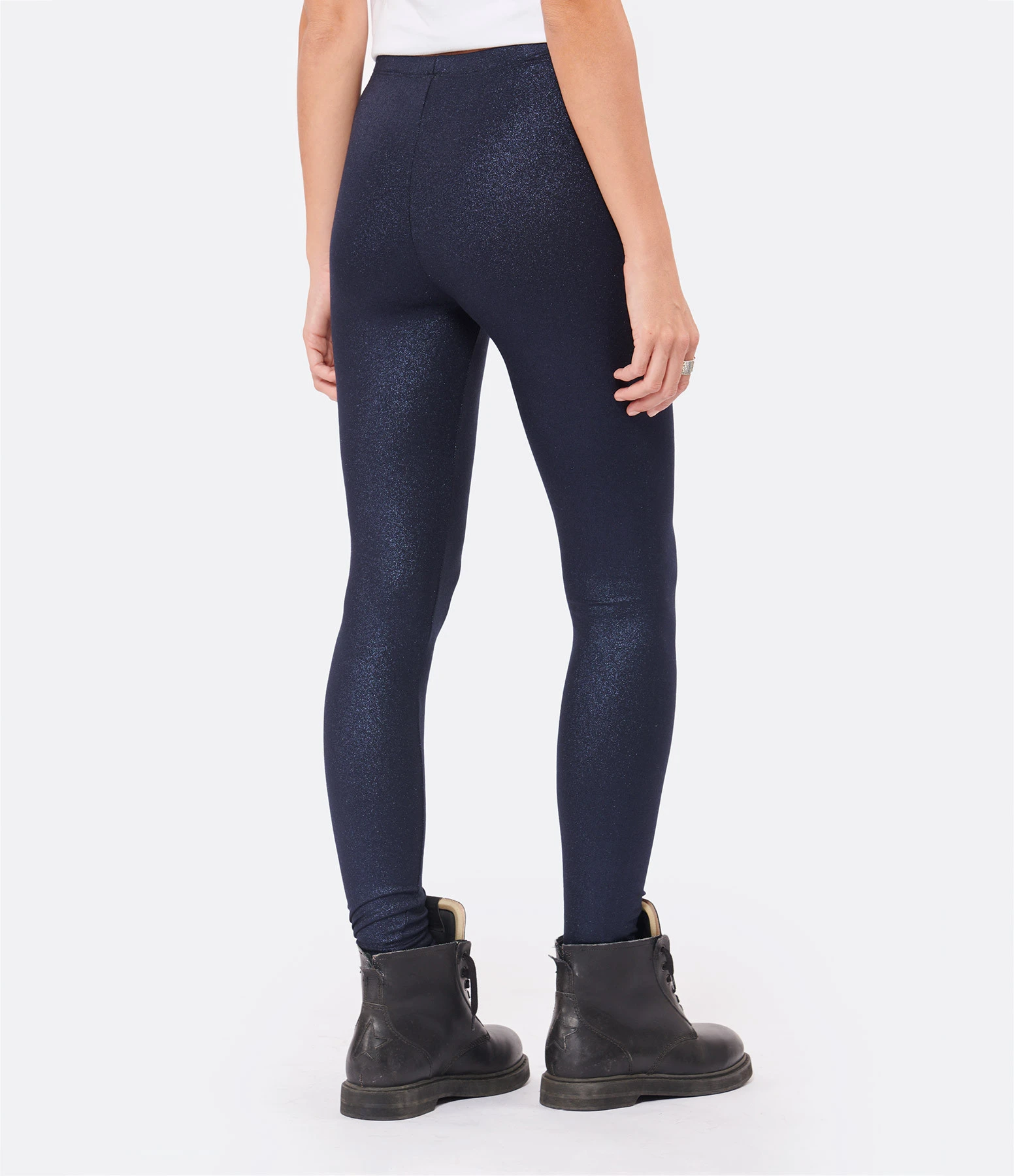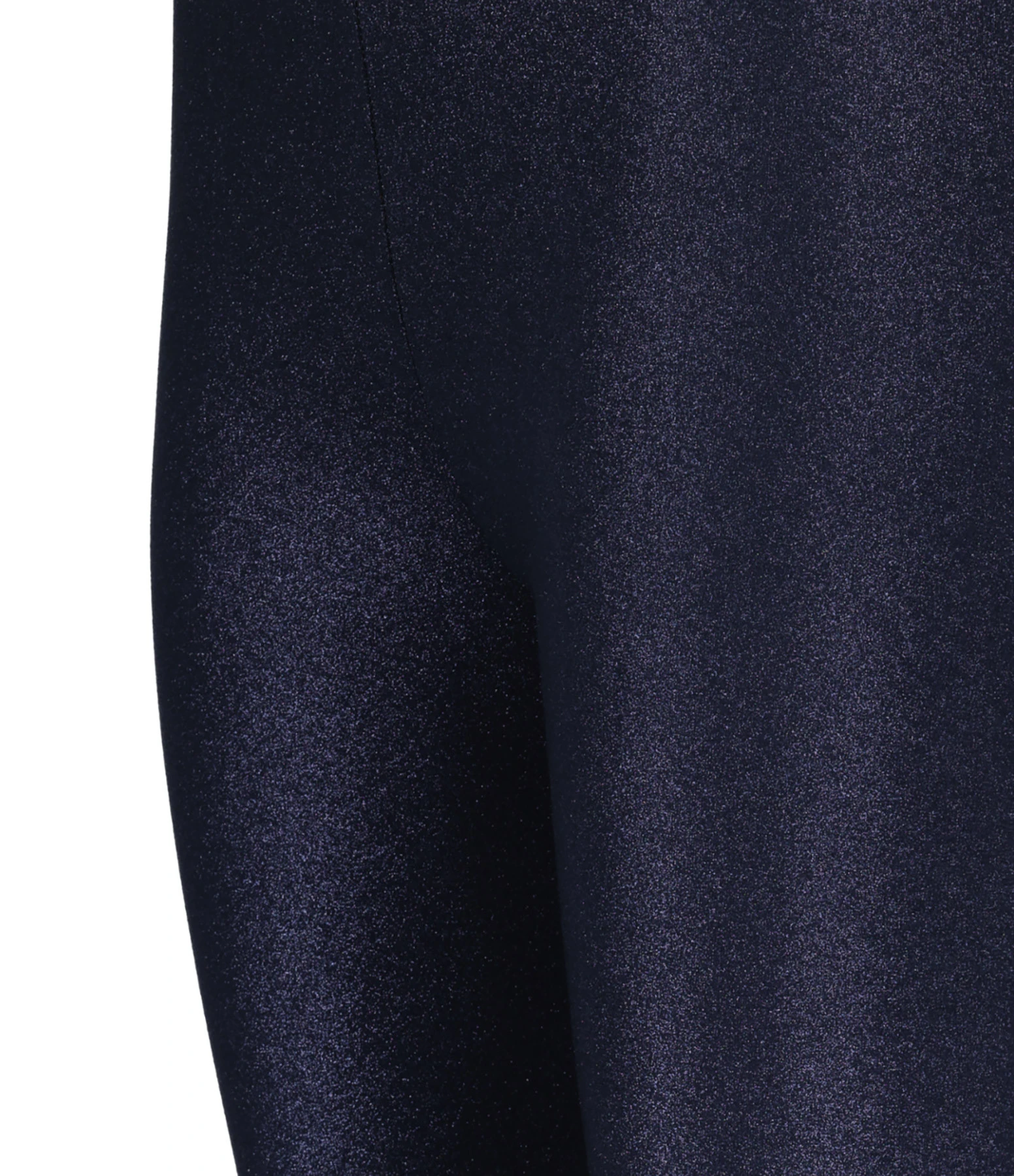 Legging métallisé bleu nuit. Taille élastiquée. Coupe slim.