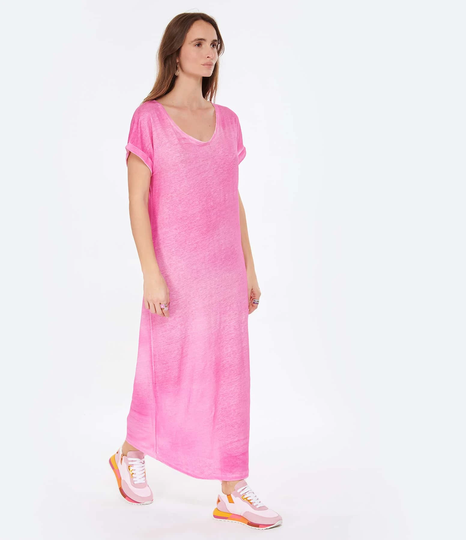 Robe longue en lin rose. Manches courtes. Col en V. Coupe droite. Base droite.