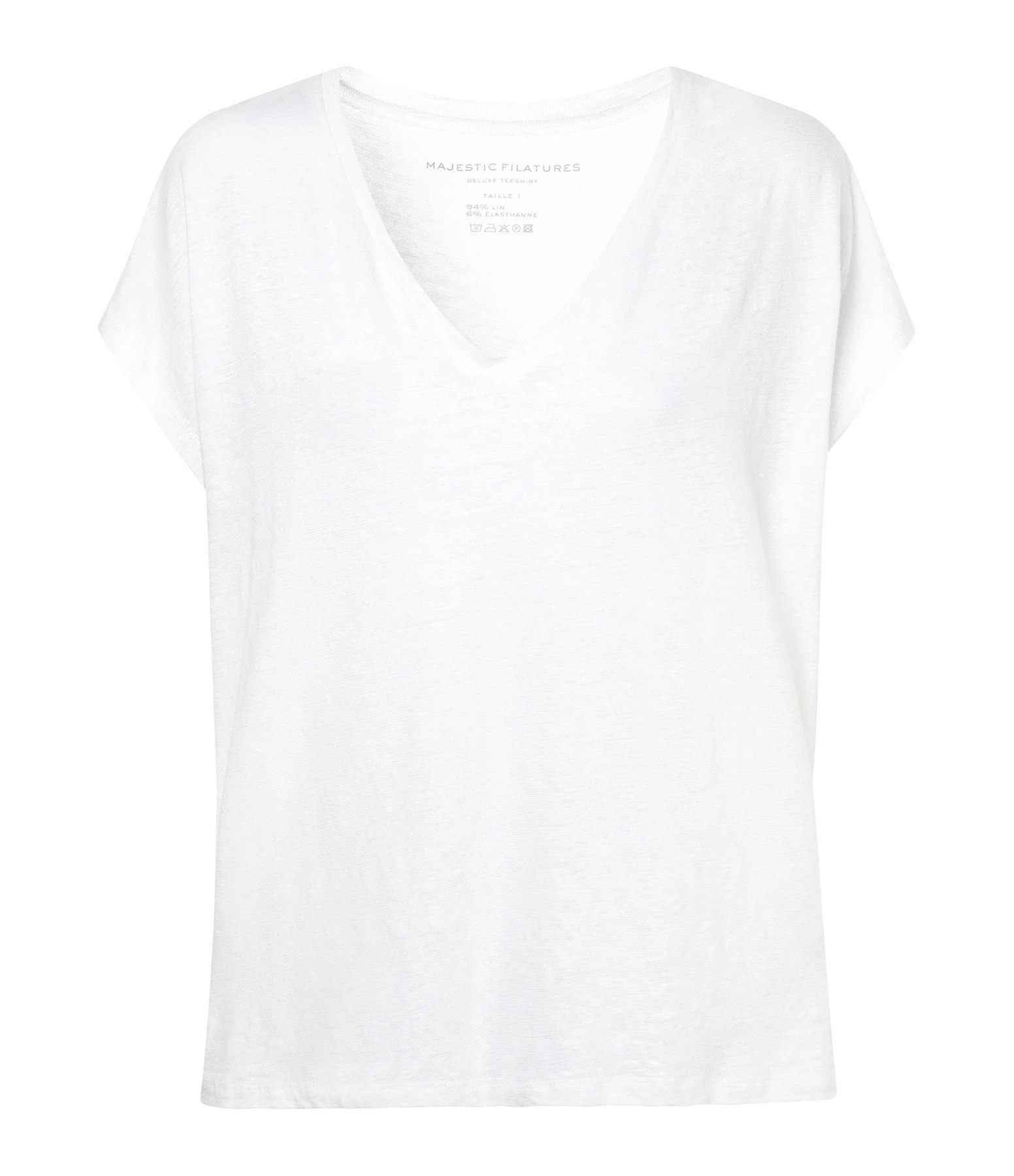 Tee-shirt manches courtes en lin blanc. Coupe large. Col en V. Base droite légèrement plus longue à l’arrière.