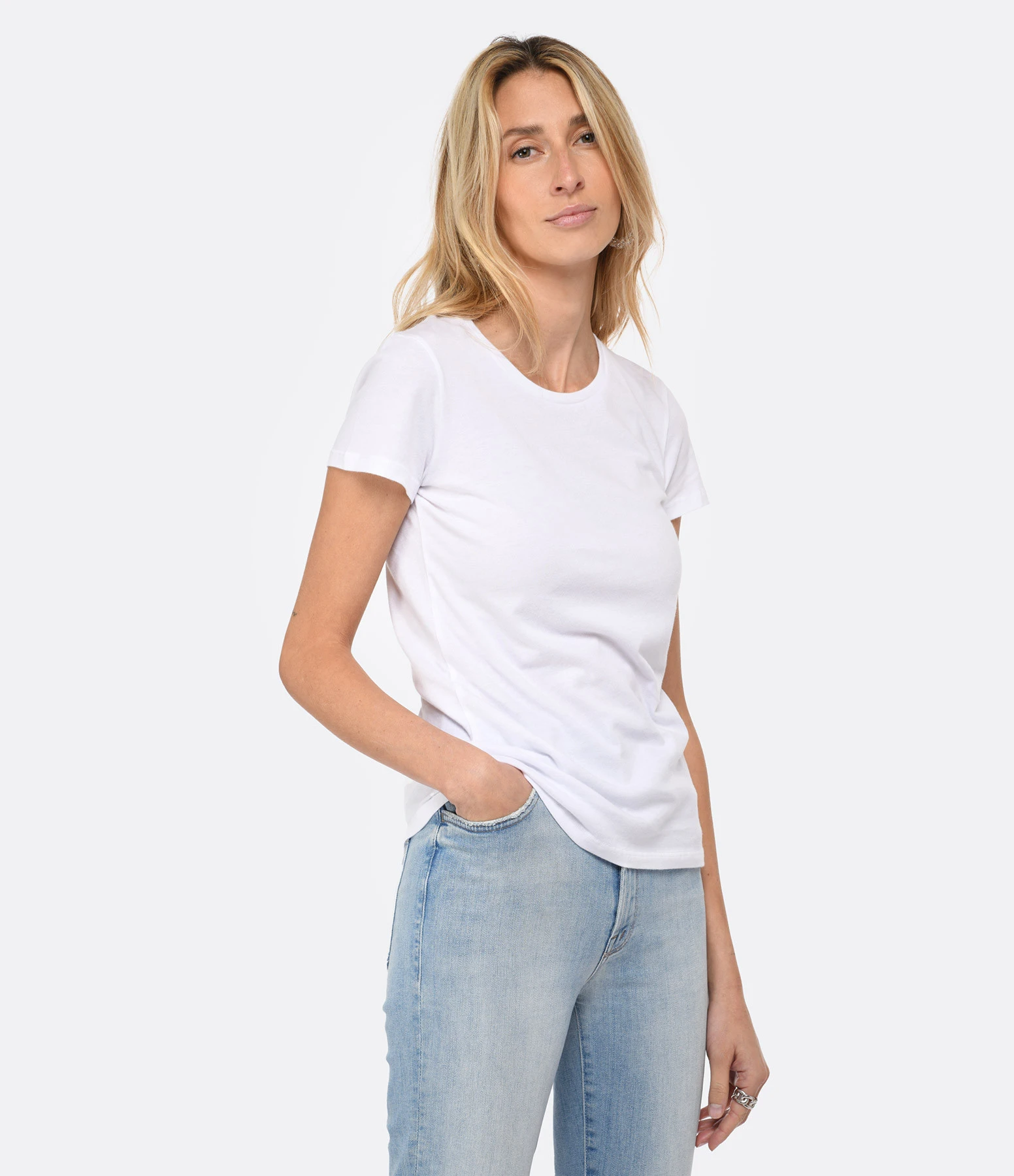 Tee-shirt manches courtes en coton blanc. Col rond. Base droite.