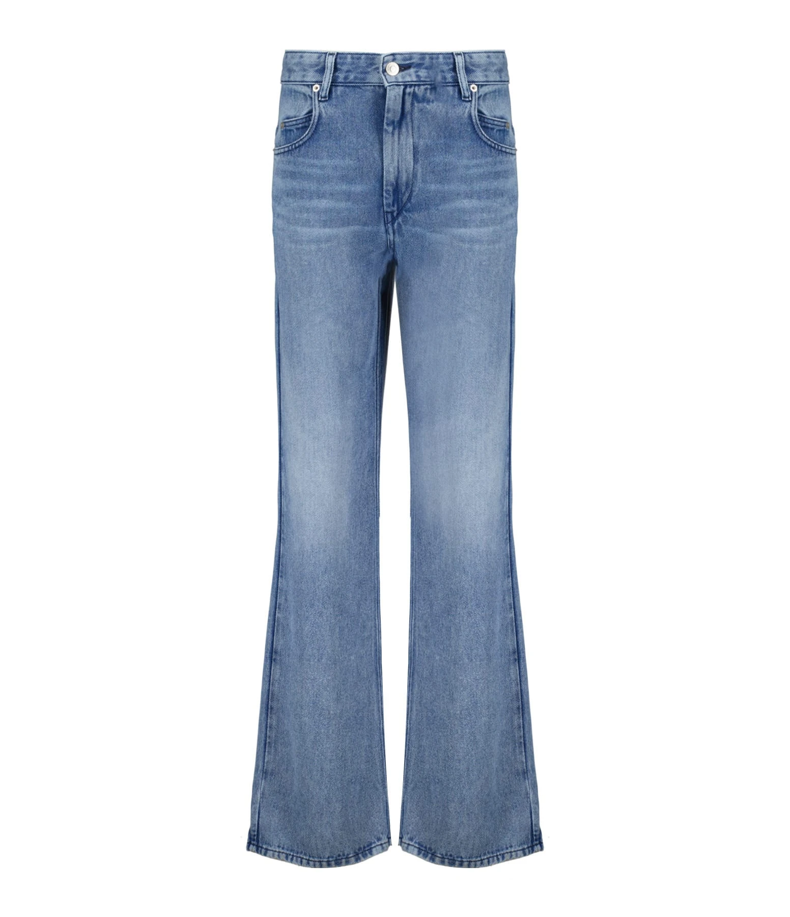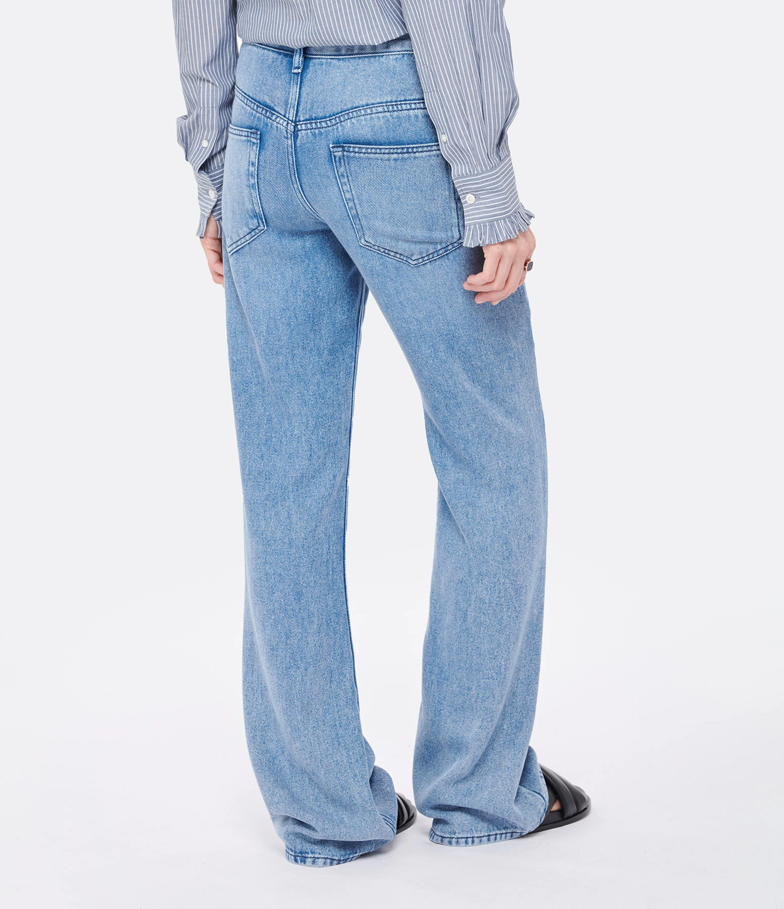 Pantalon large en denim de coton bleu clair. Taille avec passants pour ceinture. Braguette zippée et bouton. Bouton métallique argenté avec logo. Deux poches italiennes et une poche à gousset. Deux poches plaquées dans le dos. Coupe droite. Base droite.