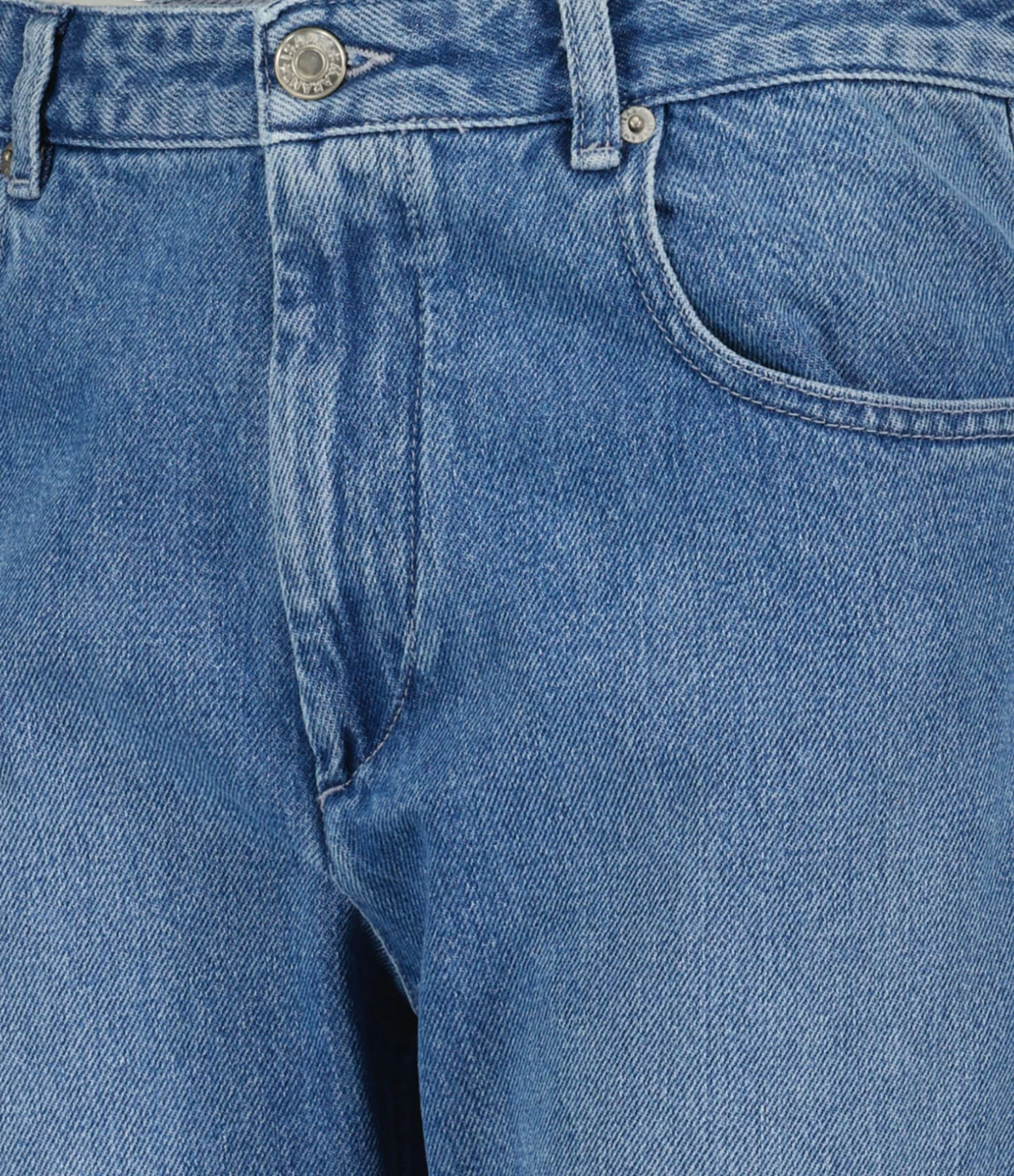 Pantalon en denim de coton bleu. Cinq poches. Taille mi- haute. Fermeture par zip et boutons. Passants pour ceinture. Coupe droite.