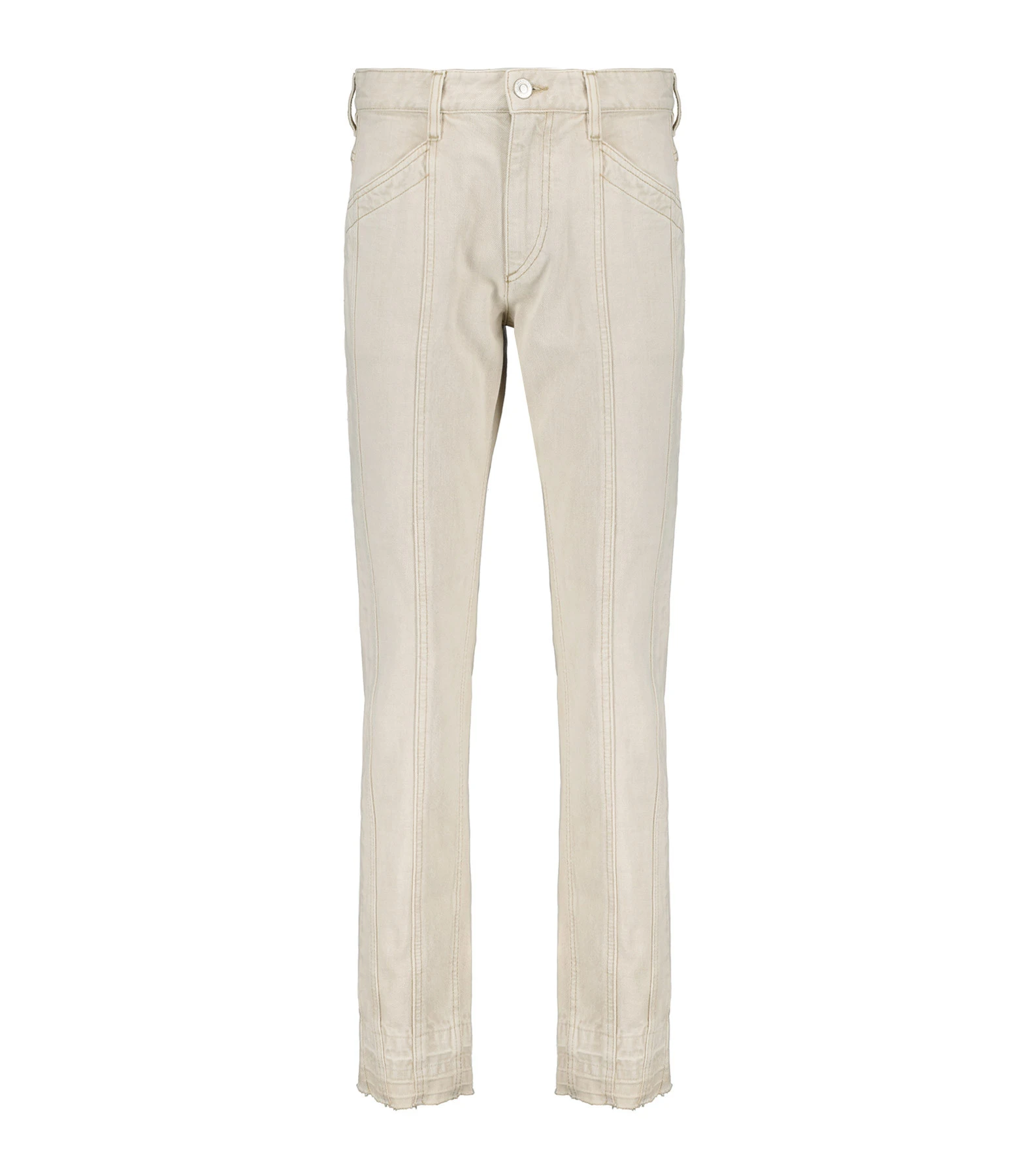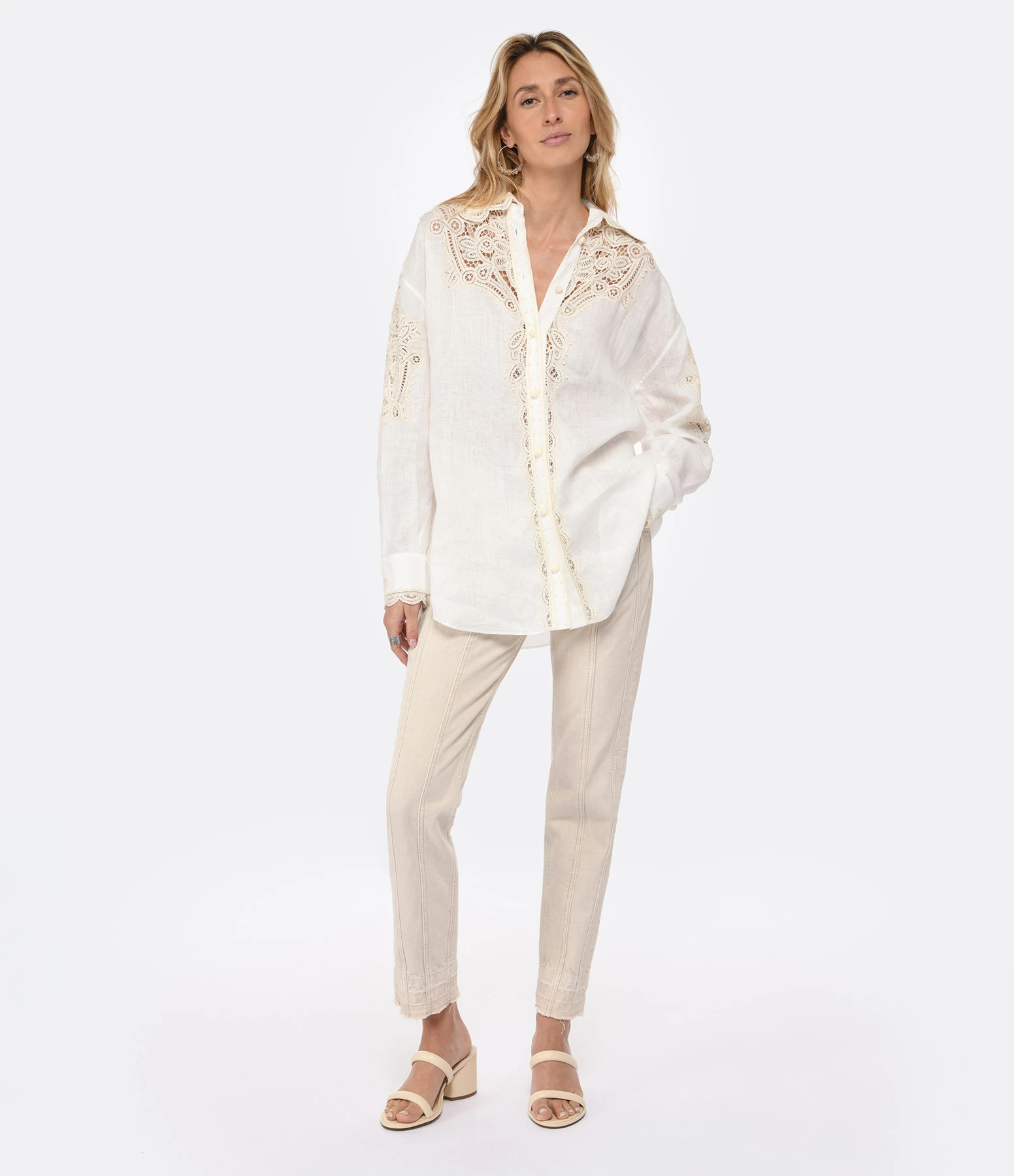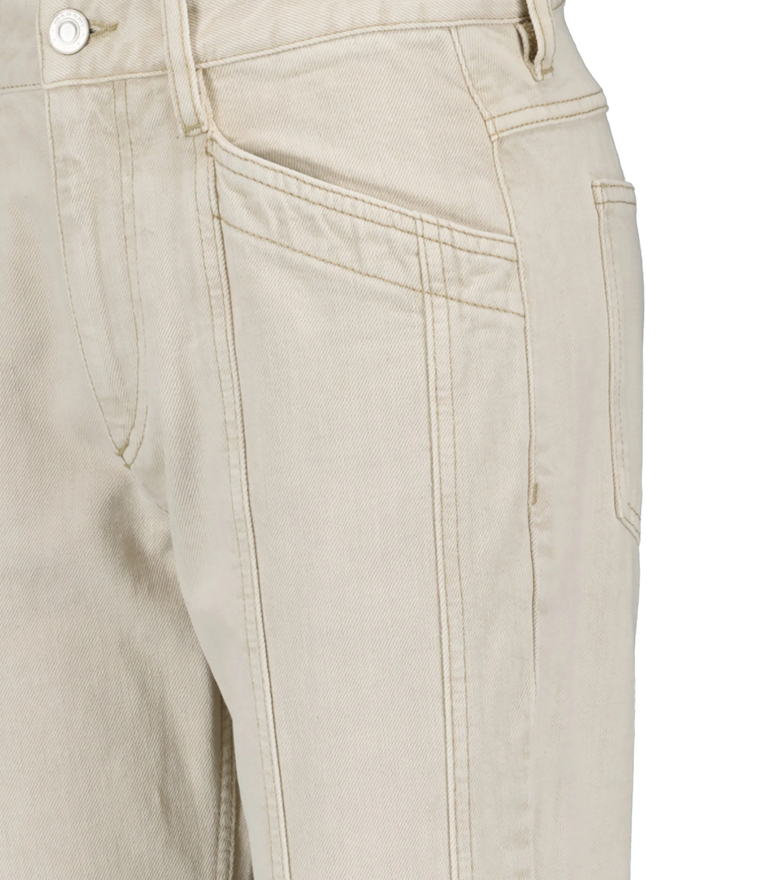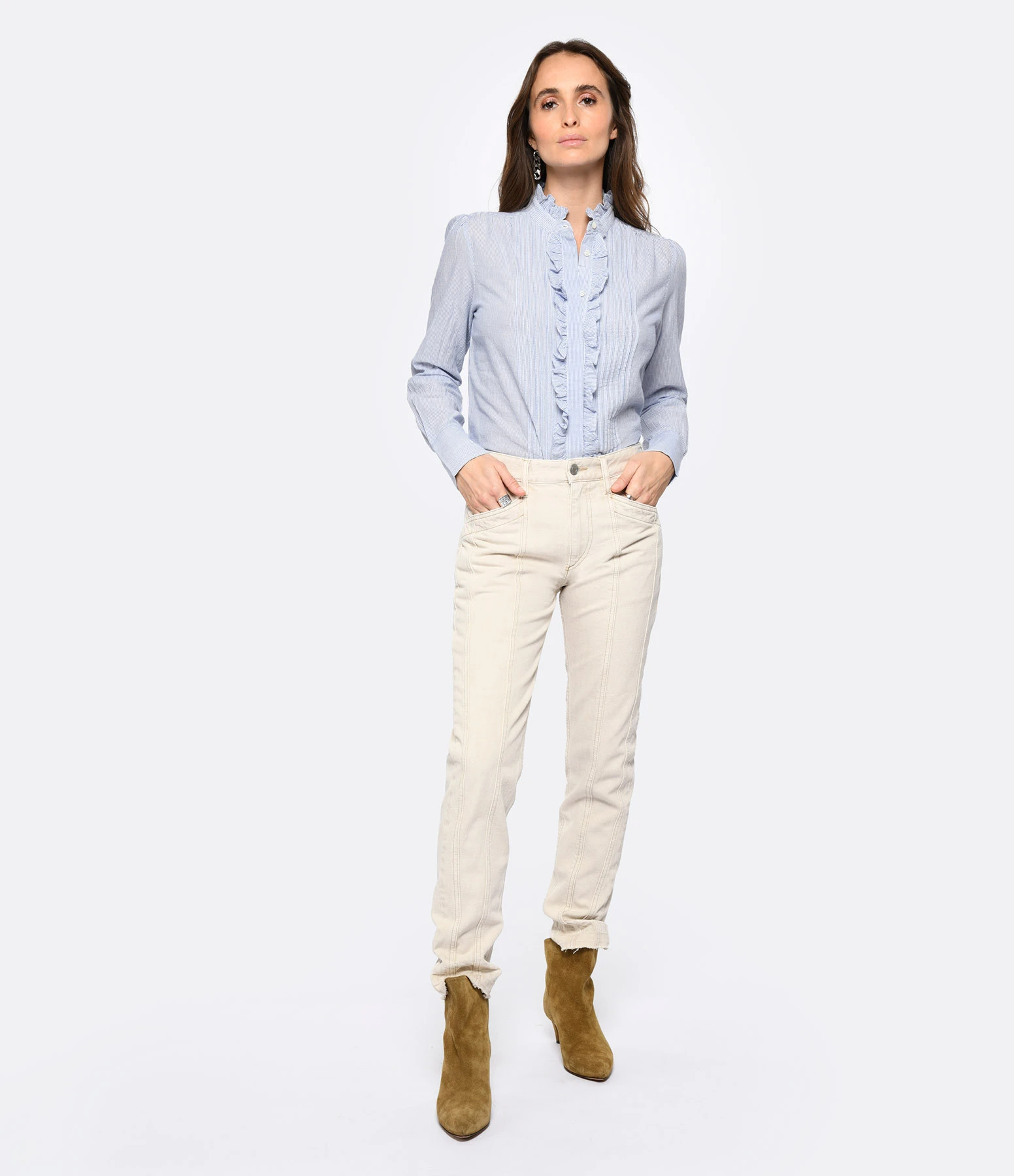 Pantalon en denim de coton écru. Passants pour ceinture. Braguette zippée et bouton métallique argenté. Deux poches italiennes. Deux poches plaquées dans le dos. Coupe droite. Base droite coupée à cru.