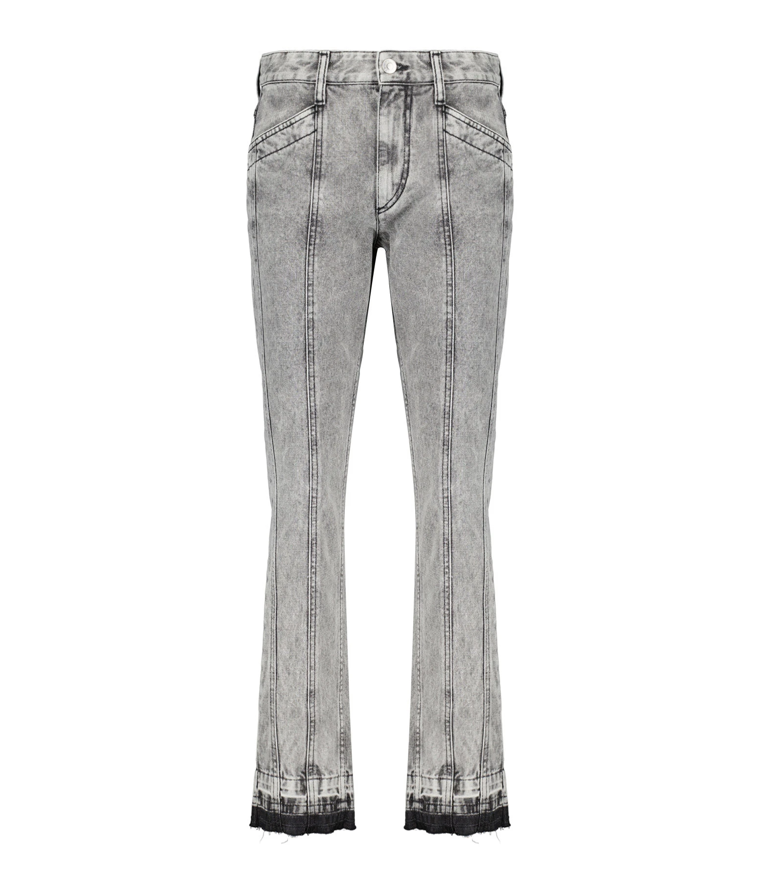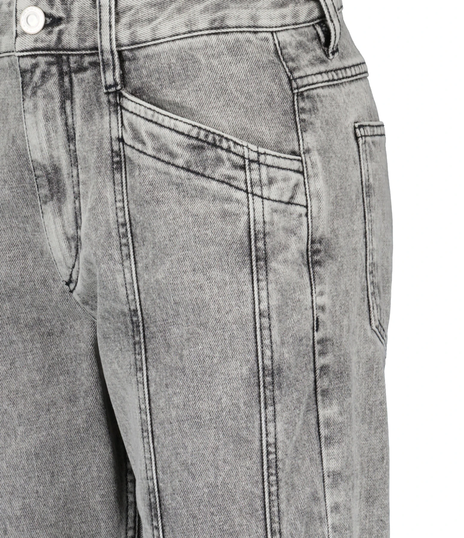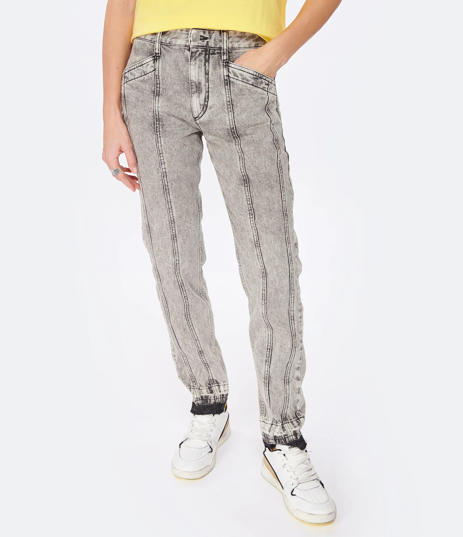 Pantalon en denim de coton gris. Passants pour ceinture. Braguette zippée et bouton métallique argenté. Deux poches italiennes. Deux poches plaquées dans le dos. Coupe droite. Base droite coupée à cru.