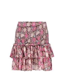 Jupe courte à volants en coton fleuri dans les tons roses. Taille smockée et élastiquée. Coupe évasée. Volants sur le bas de la jupe. Doublée.