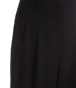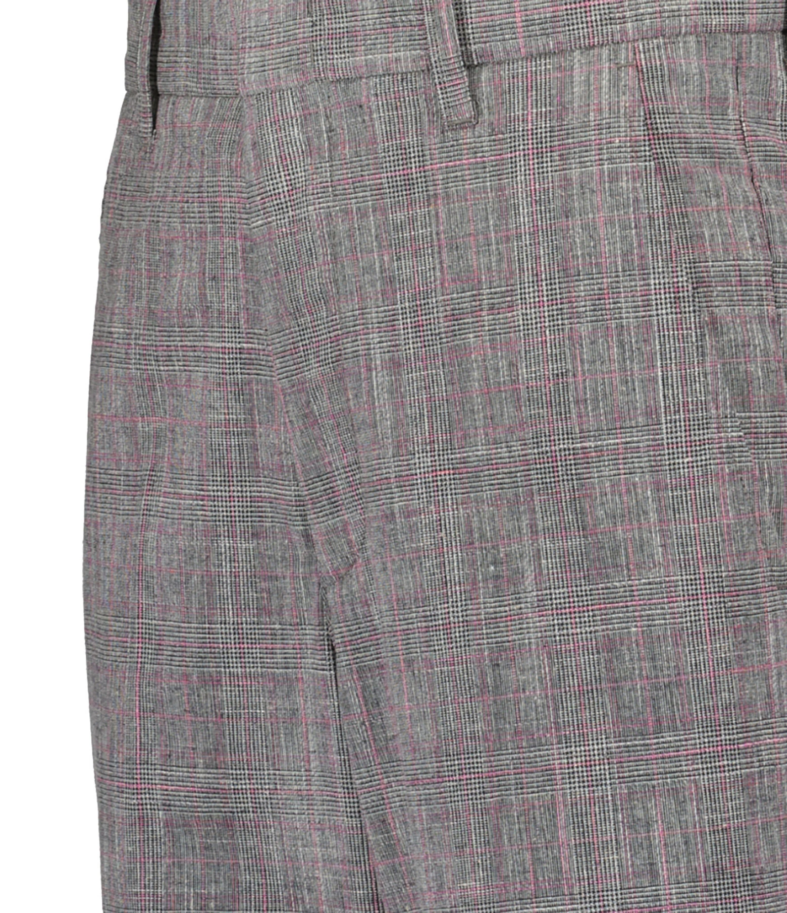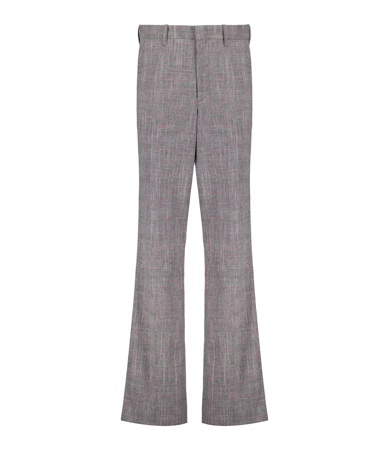 Pantalon en laine à carreaux noir et rose. Taille haute. Fermeture par zip et agrafe. Deux poches avant et deux poches passepoilées à l’arrière. Coupe droite.