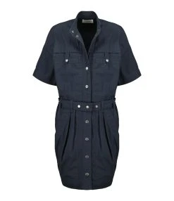 Robe en coton noir délavé à manches courtes. Deux poches passepoilées au niveau de la poitrine. Fermeture par boutons métalliques sur le devant. Col officier avec boutons métalliques. Deux poches raglans. Ceinture à boutons au niveau de la taille. Coupe droite. Base droite.