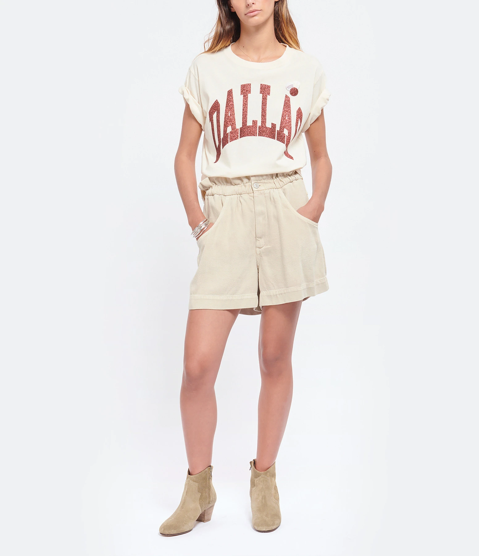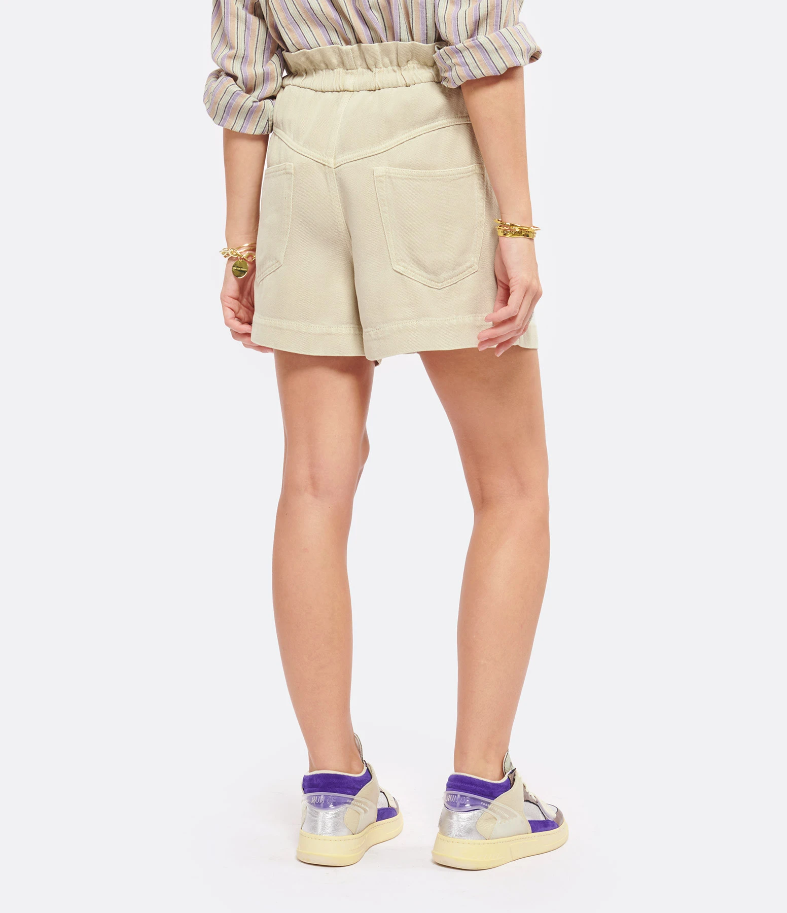 Short en coton écru. Taille haute élastiquée. Deux poches italiennes. Deux poches plaquées au dos. Fermeture zippée avec bouton. Coupe droite. Base droite.