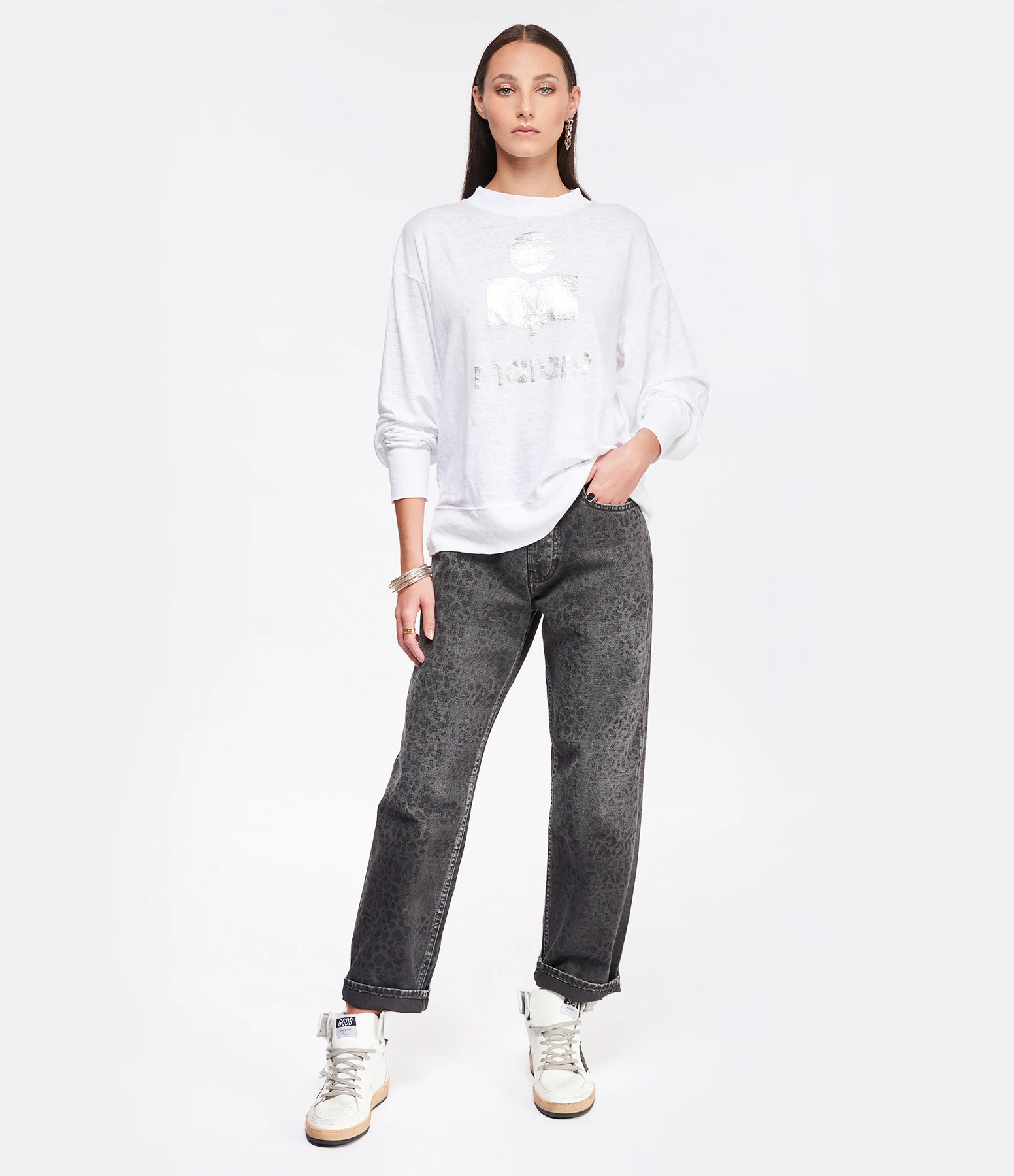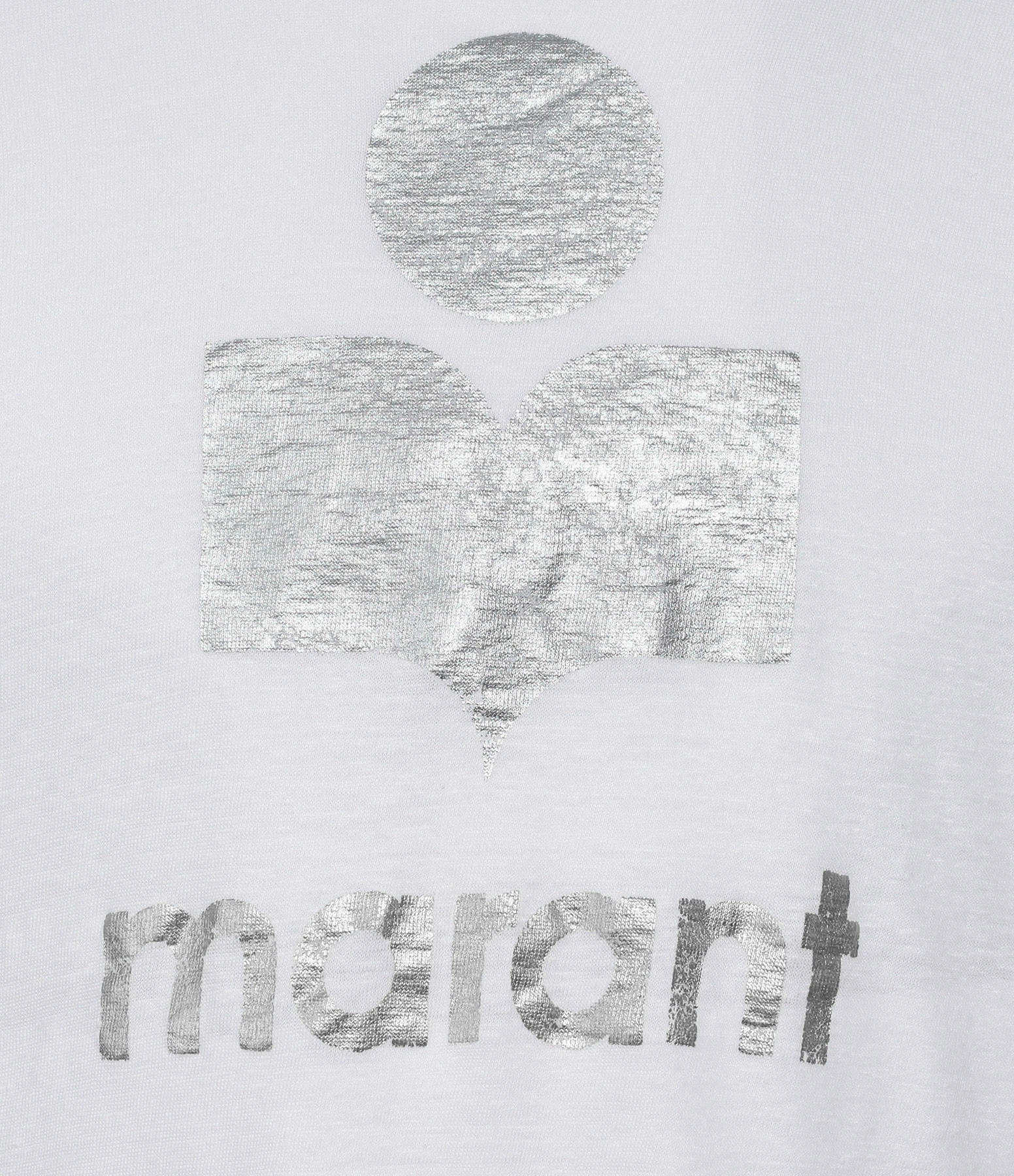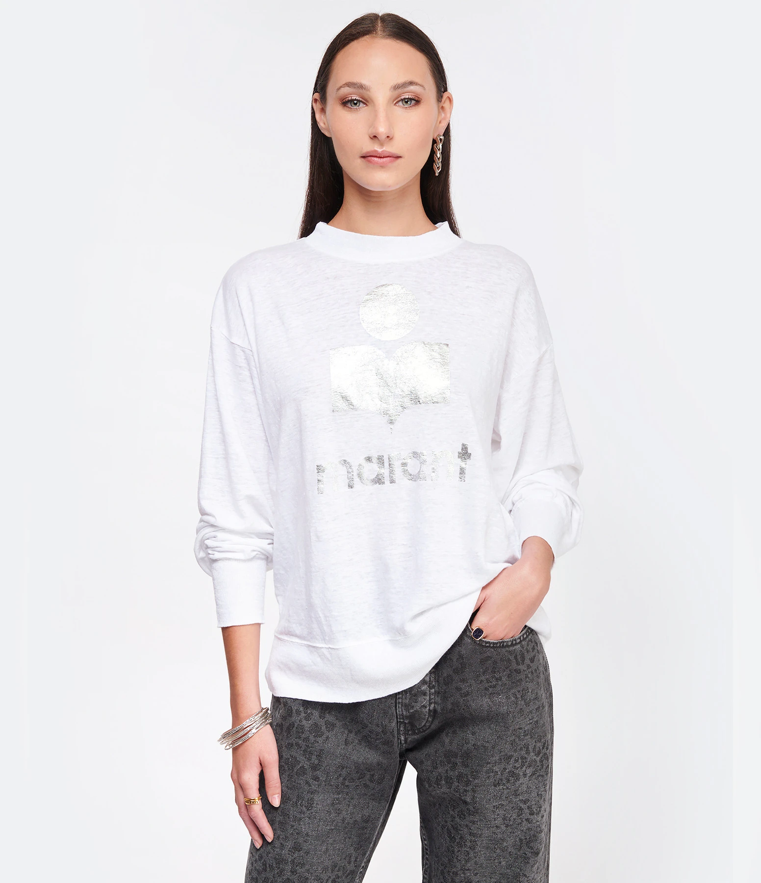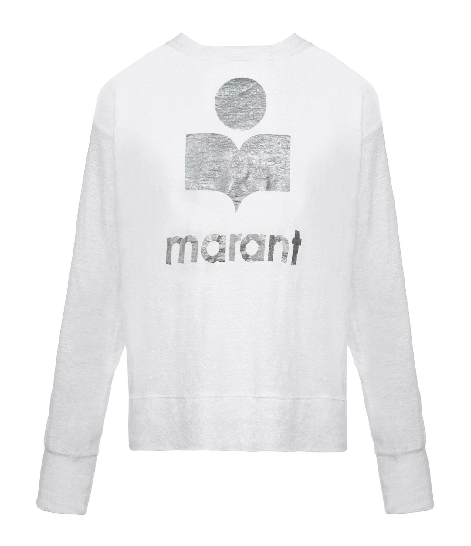 Tee-shirt en lin blanc orné du logo « Marant » flocké en argenté. Col rond côtelé. Manches longues avec poignets côtelés. Coupe droite. Base droite.
