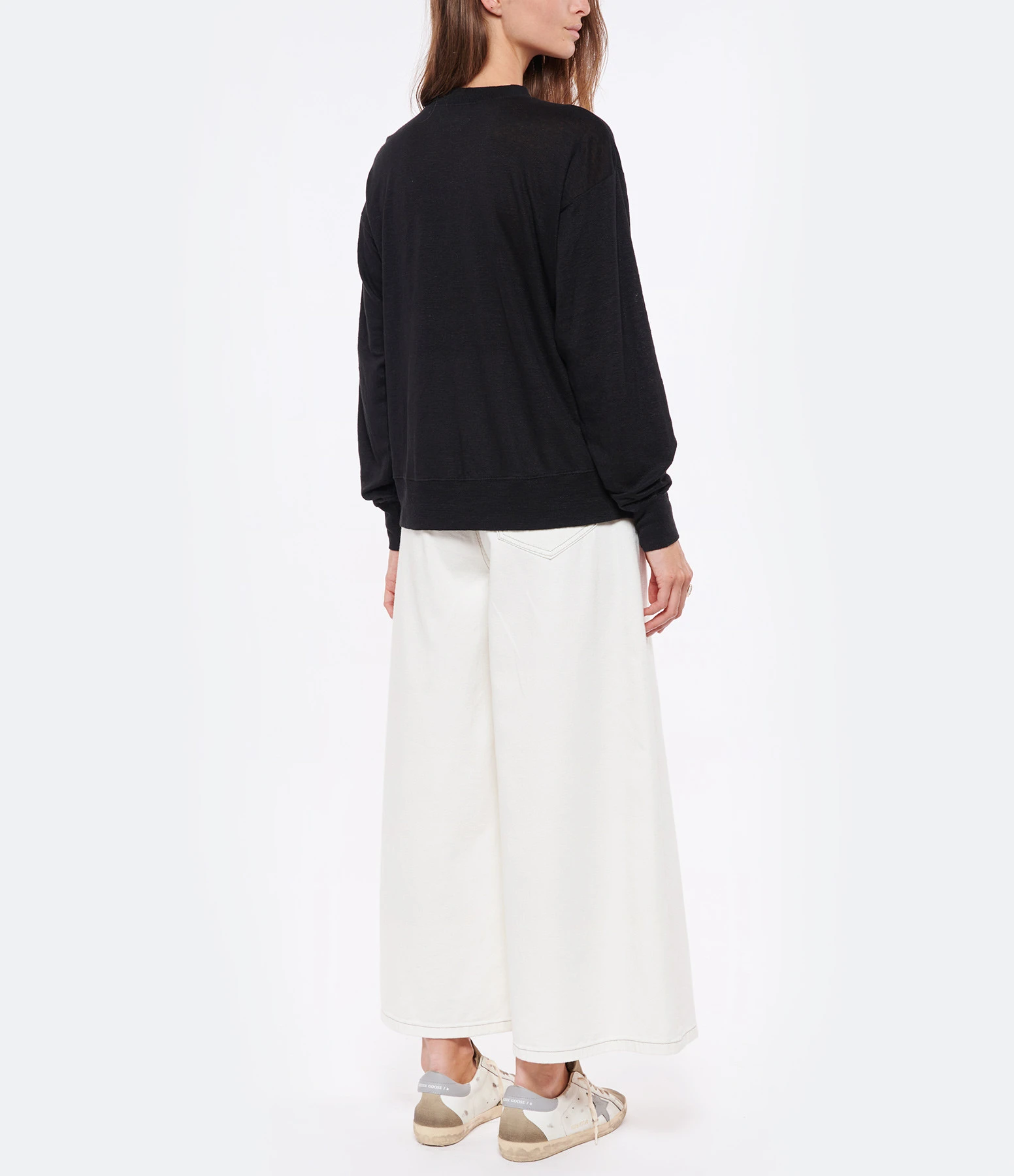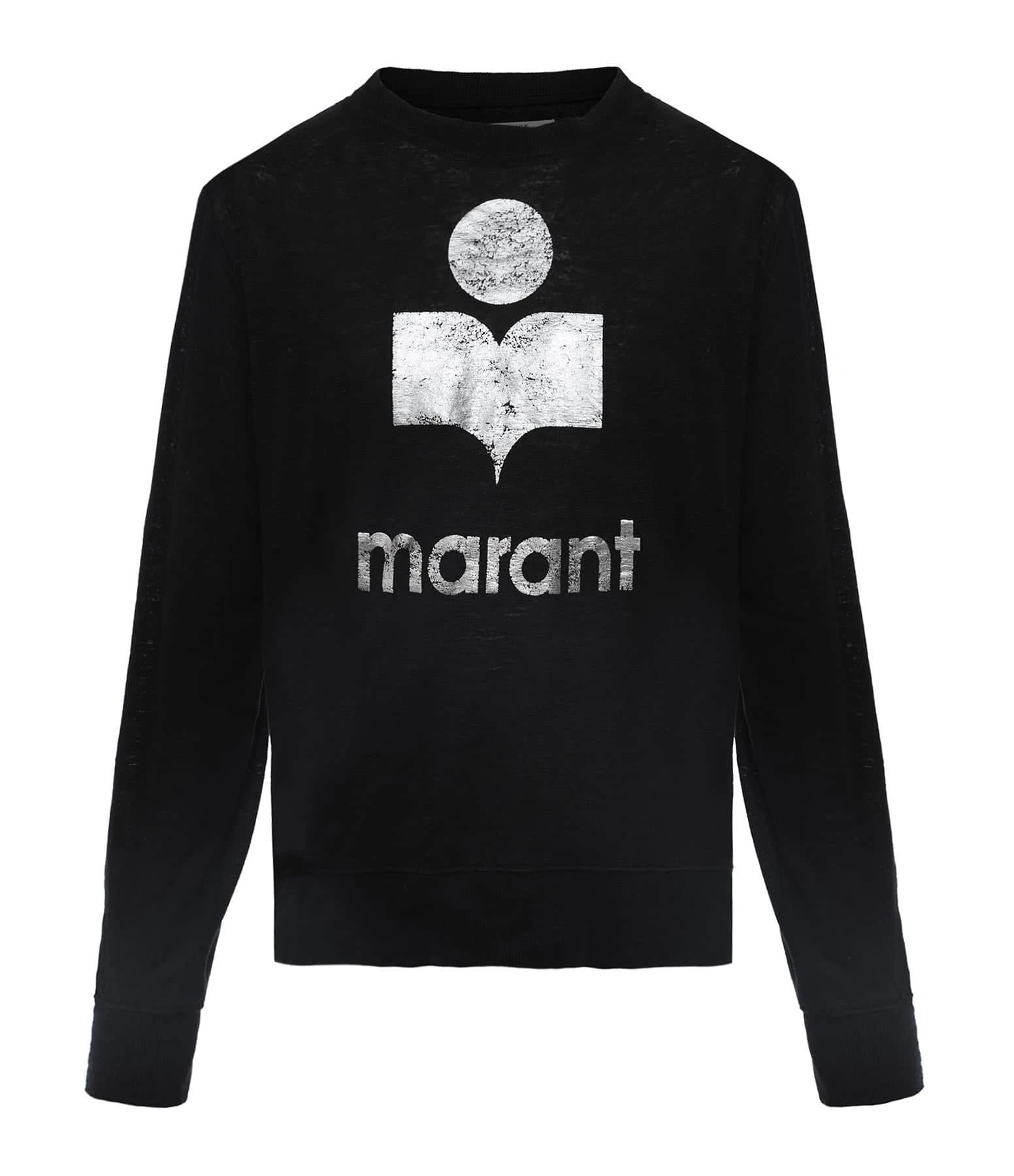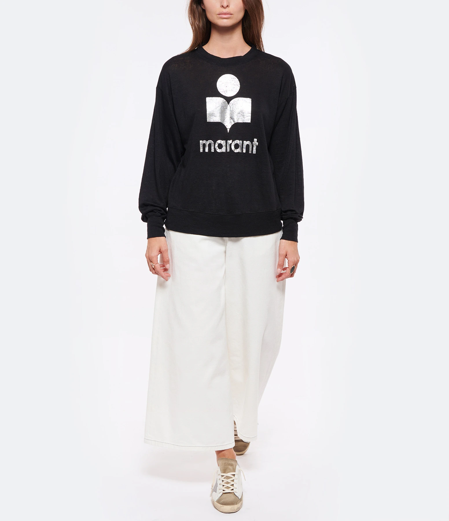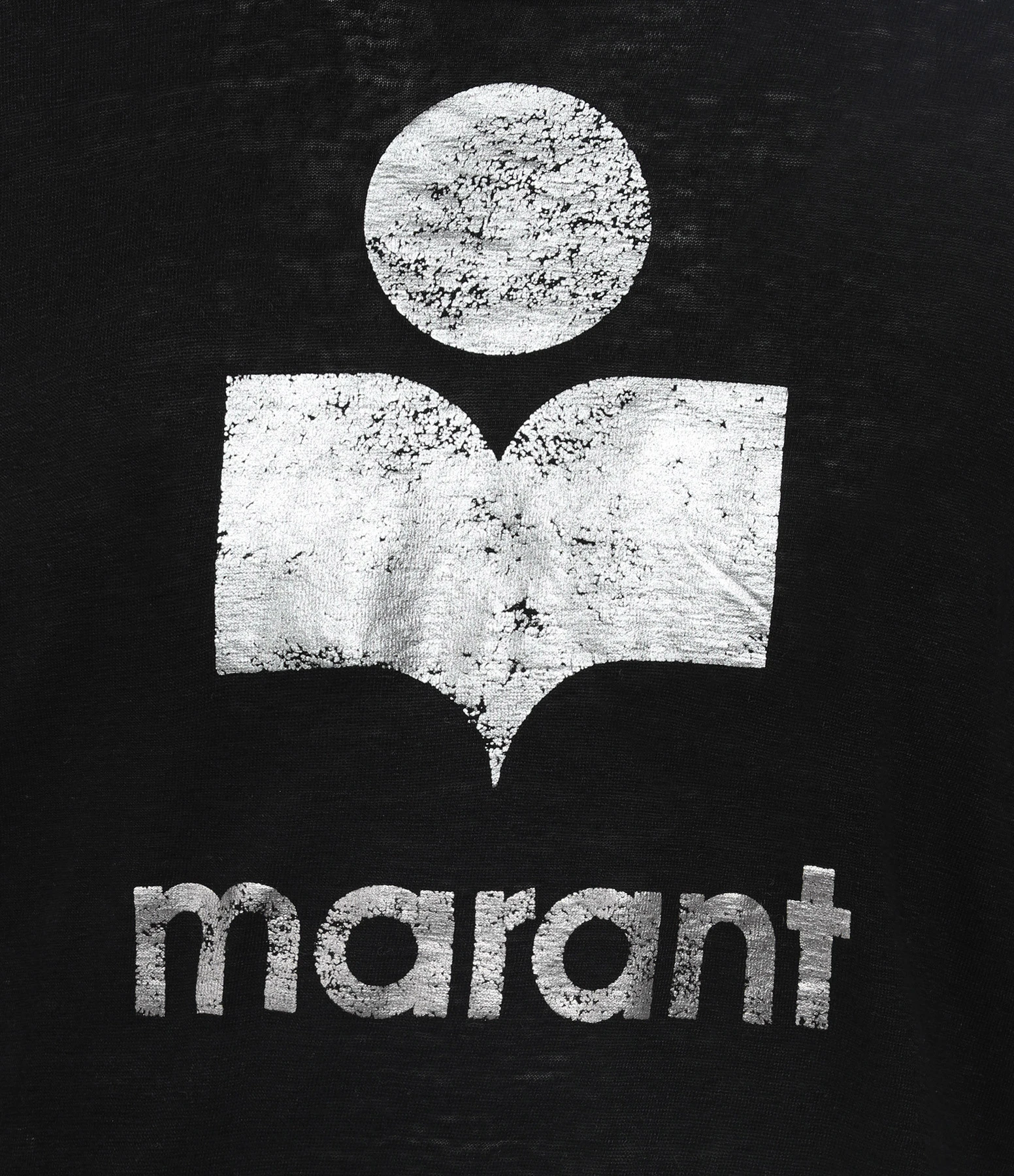 Tee-shirt en lin noir imprimé. Logo « MARANT » flocké argenté sur le devant. Col rond. Manches longues. Coupe droite. Base droite. Non doublé.