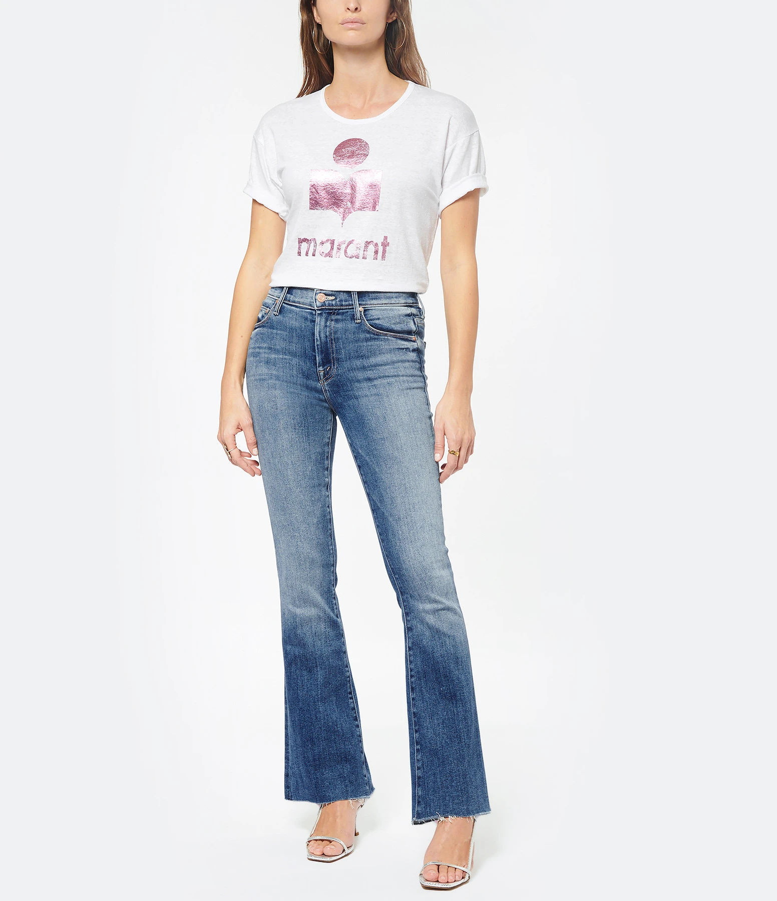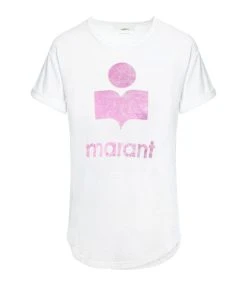 Tee-shirt en lin blanc avec le logo MARANT flocké en rose métallisé sur le devant. Col rond. Manches courtes. Coupe droite. Base arrondie.