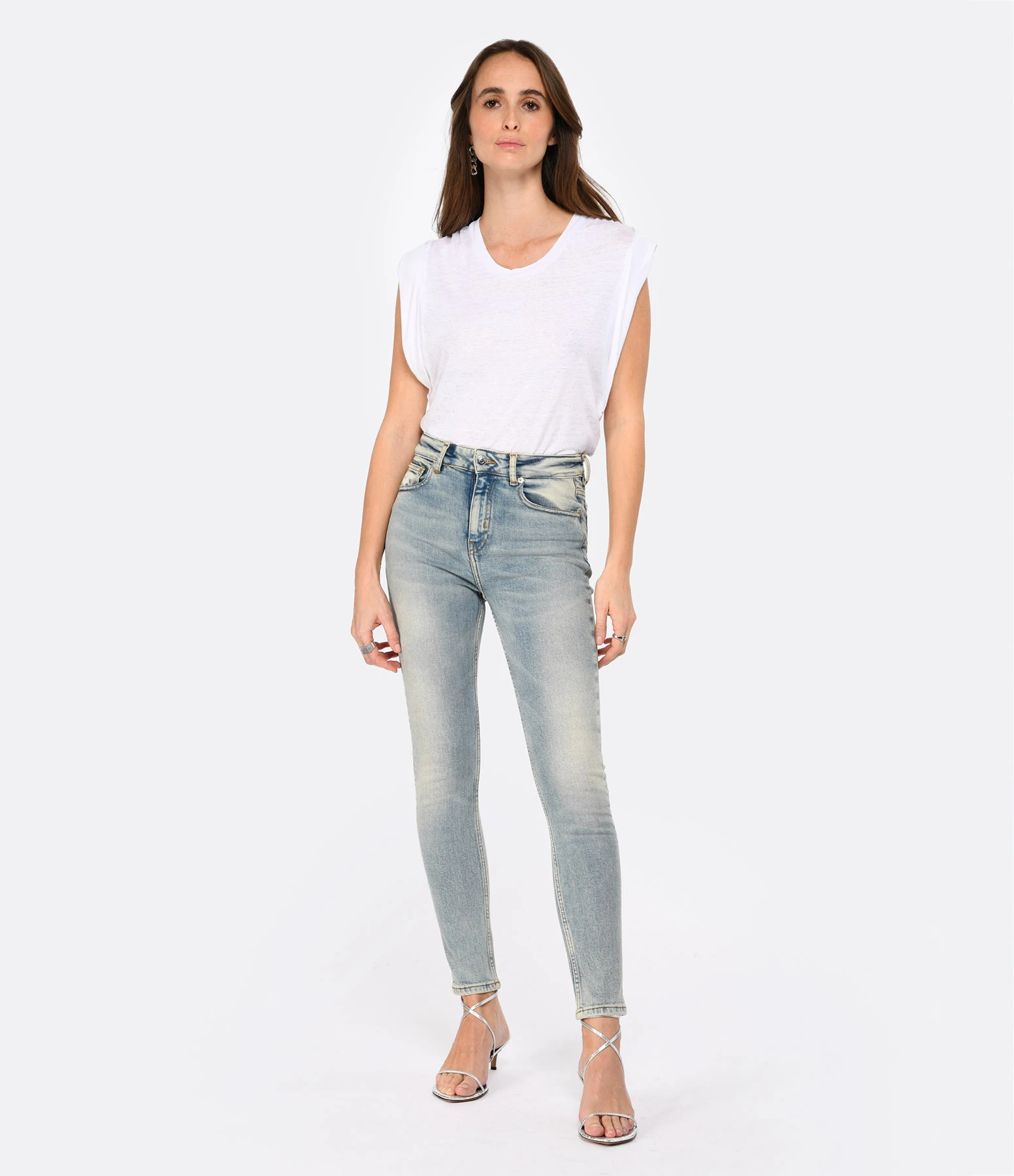 Tee-shirt en lin blanc. Col rond côtelé. Épaules froncées et élastiquées. Manches courtes avec bords rabattus. Coupe droite. Base arrondie.