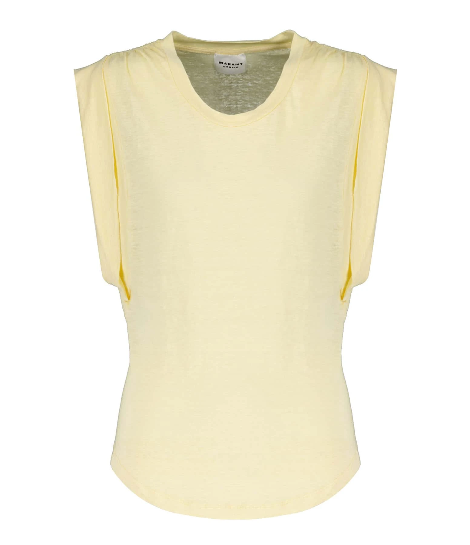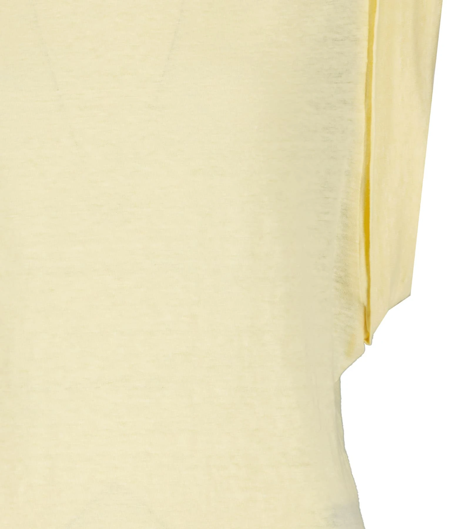 Tee-shirt en lin jaune. Col rond côtelé. Épaules froncées et élastiquées. Manches courtes avec bords rabattus. Coupe droite. Base arrondie.