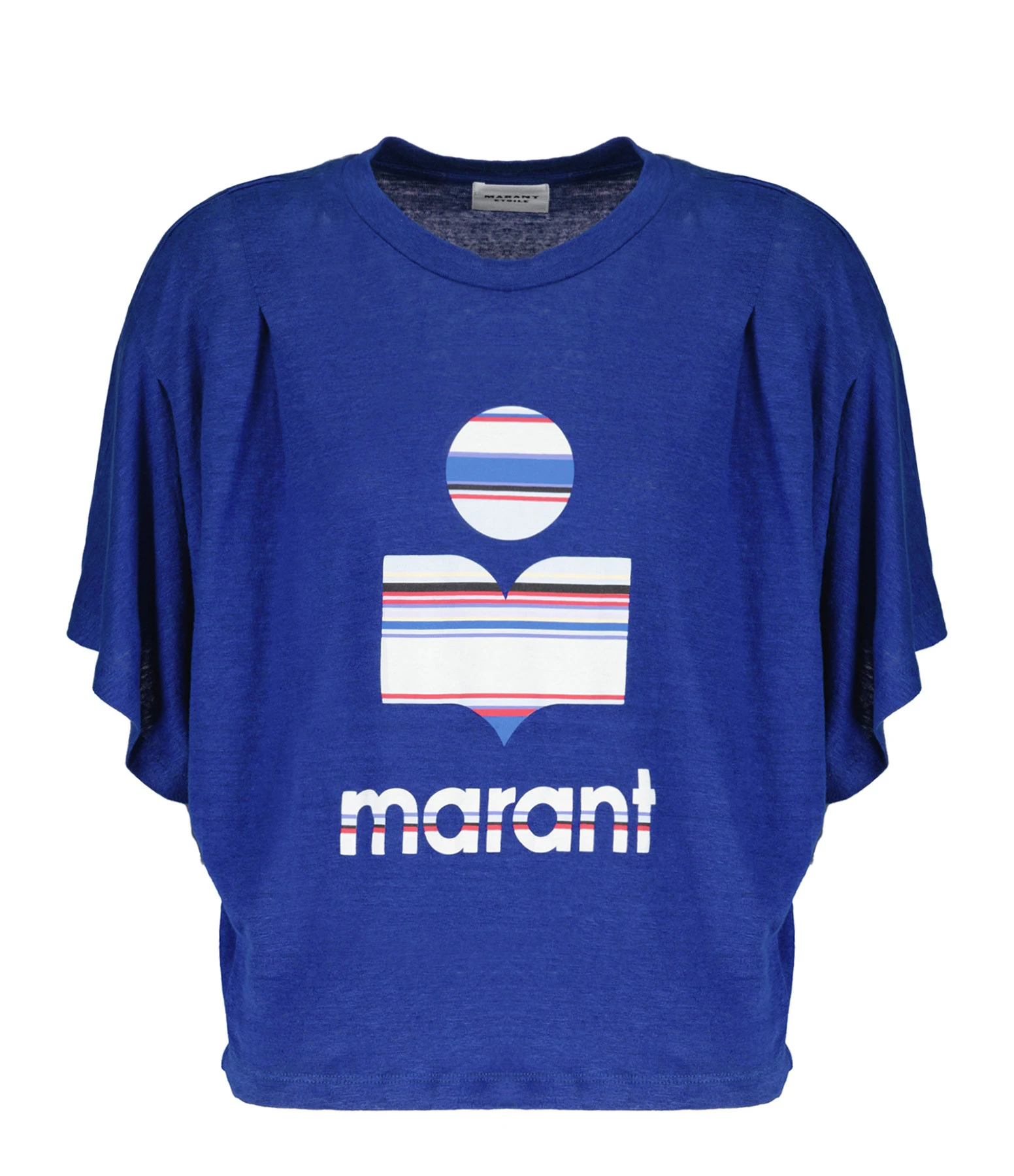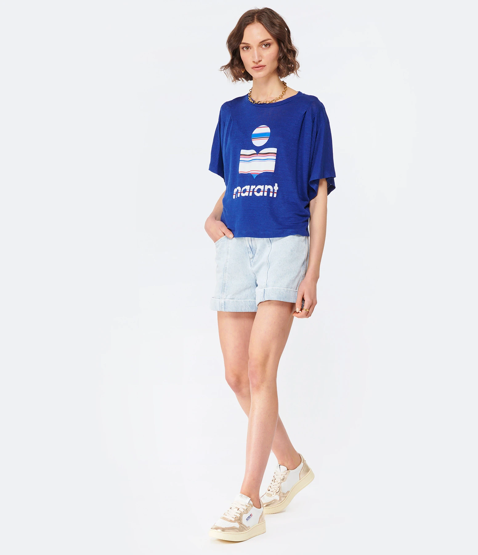 Tee-shirt en lin bleu avec le logo Marant à rayures multicolores flocké sur le devant. Col rond côtelé. Épaules plissées. Manches courtes chauve-souris. Coupe ample. Base droite.