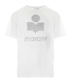 Tee-shirt en lin blanc orné du logo « MARANT » flocké en argenté sur le devant. Col rond côtelé. Manches courtes. coupe droite. Base droite.