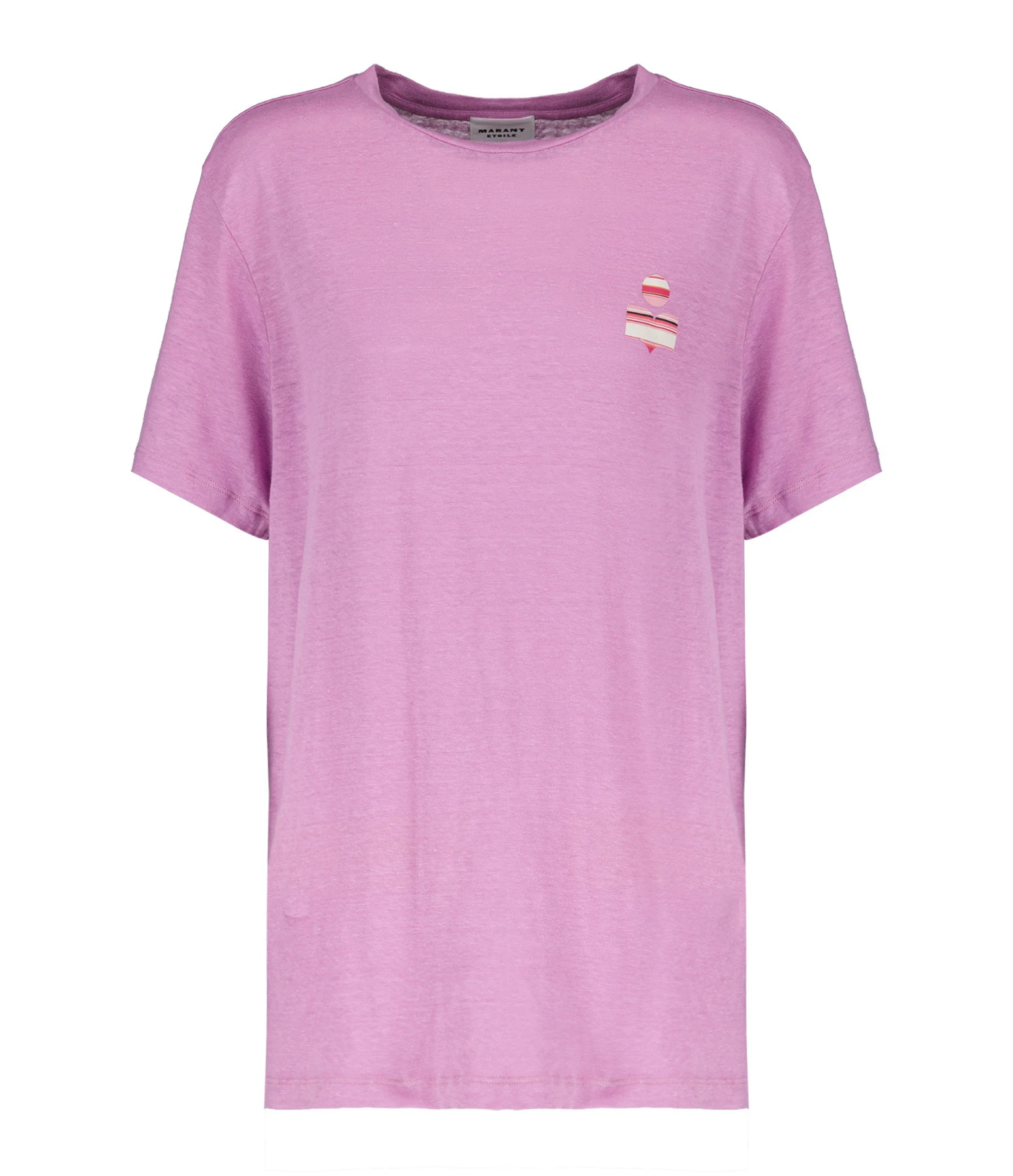 Tee-shirt en lin rose avec le logo à rayures dans des tons roses et beiges flocké sur la poitrine et dans le dos. Col rond côtelé. Manches courtes. Coupe droite. Base droite.