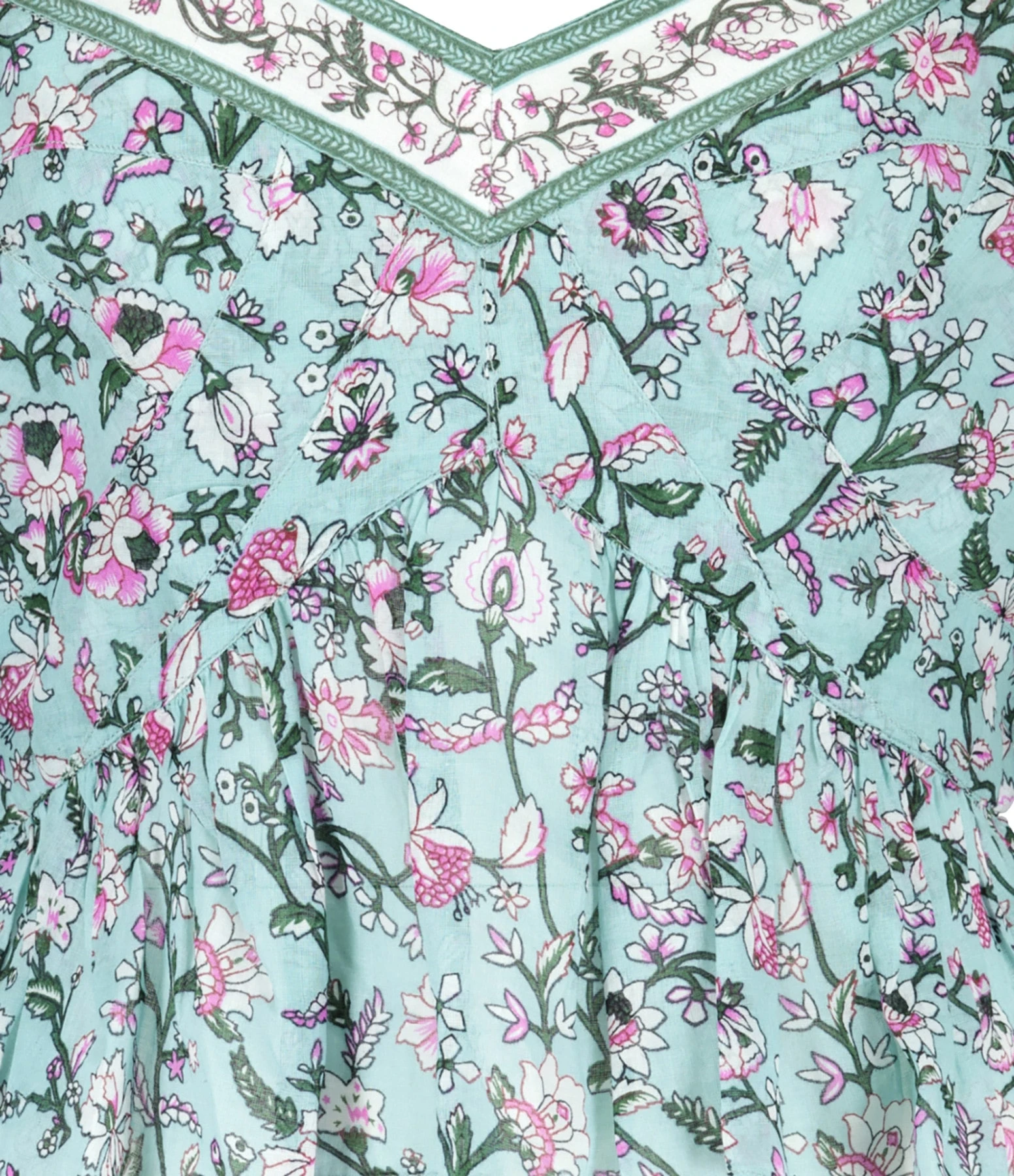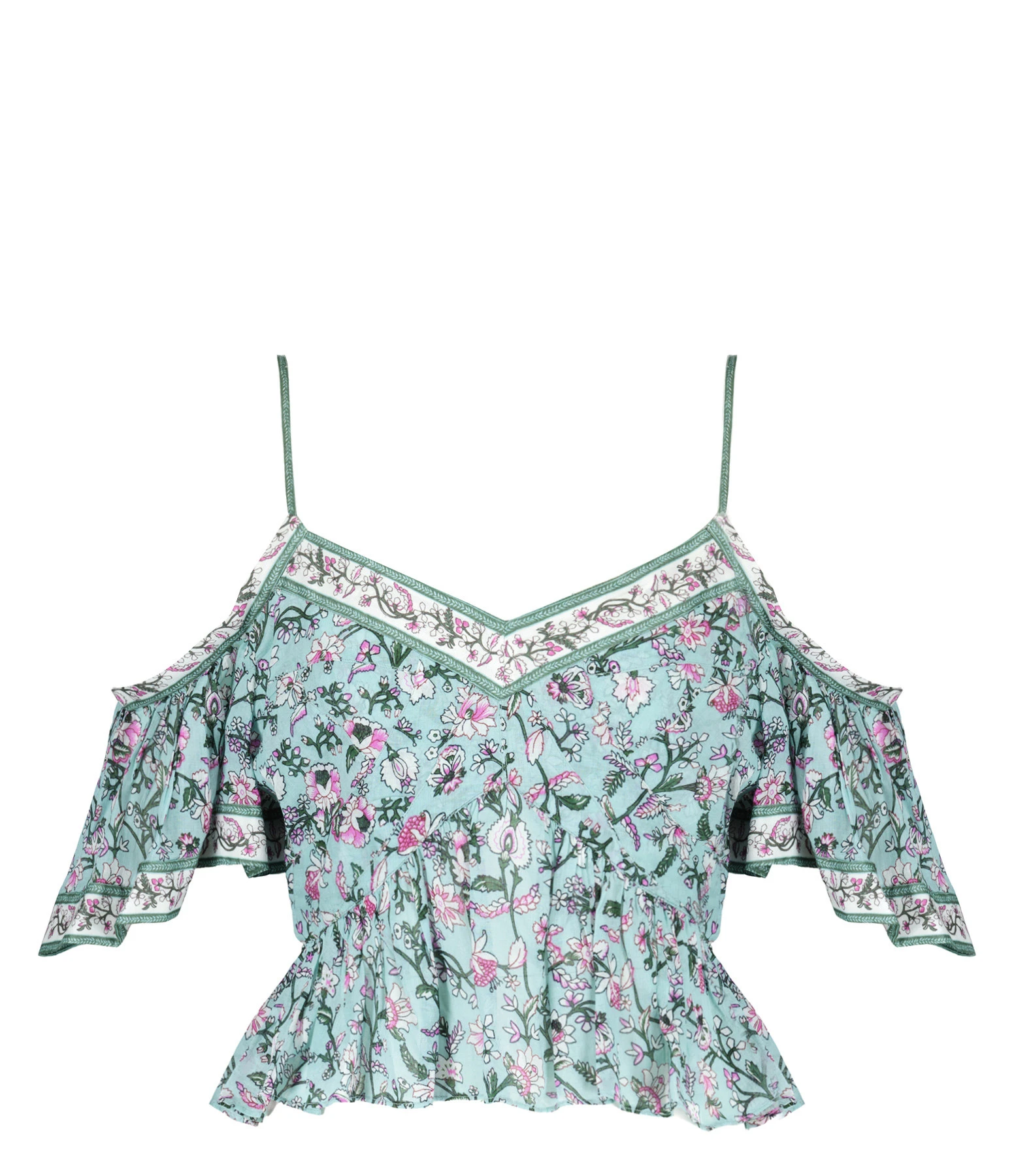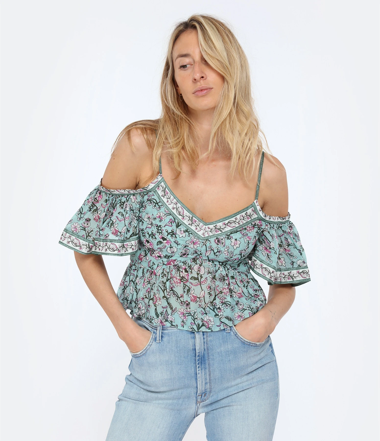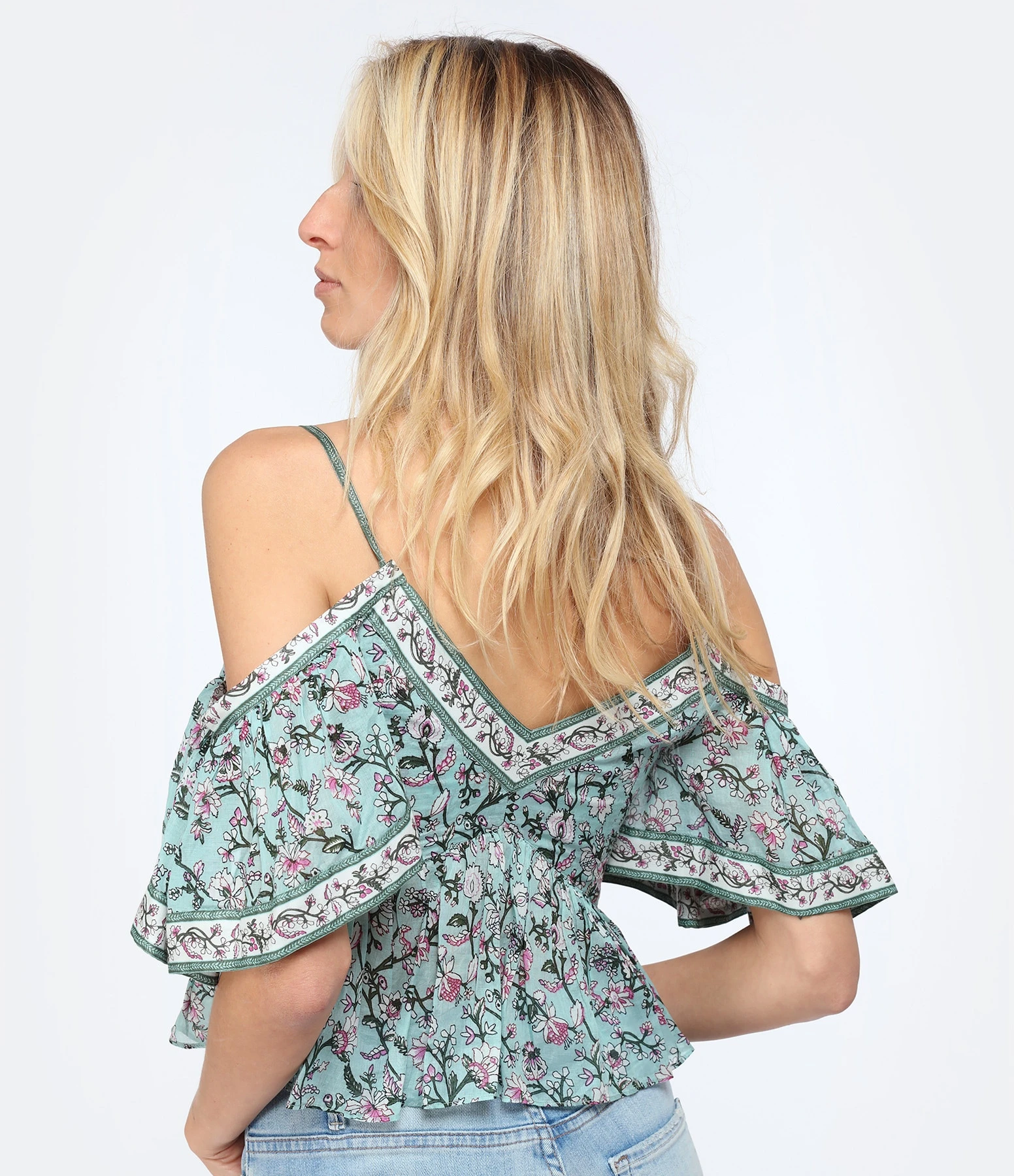 Top à volants en coton à imprimé floral vert. Encolure en V. Épaules ajourées avec fines brettelles et manches courtes. Coupe droite. Base asymétrique.