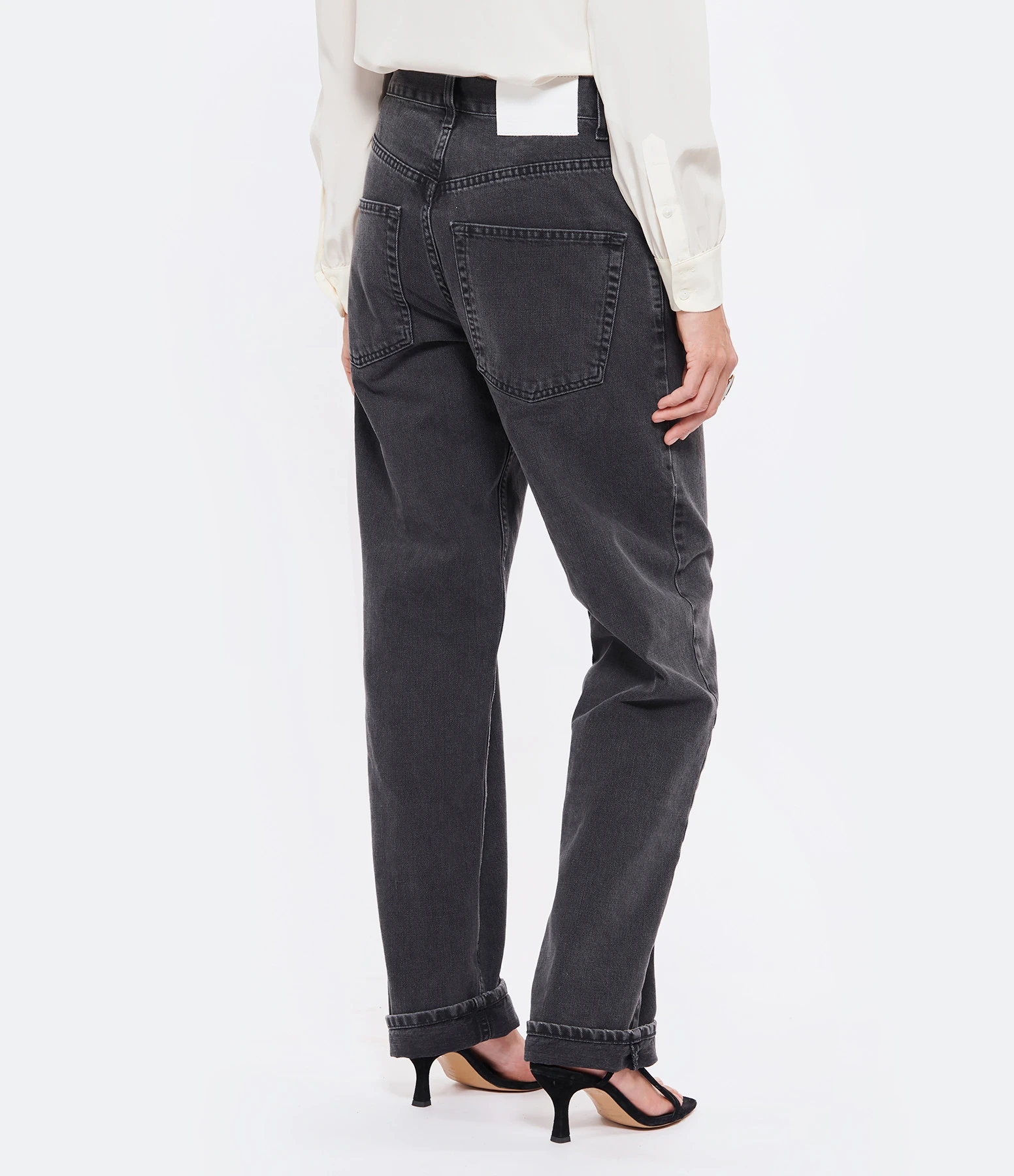 Pantalon en denim de coton noir délavé. Passants pour ceinture. Braguette boutonnée. Boutons et rivets métalliques. Deux poches italiennes et une poche à gousset. Deux poches plaquées dans le dos. Jacron blanc dans le dos. Coupe large. Base droite.