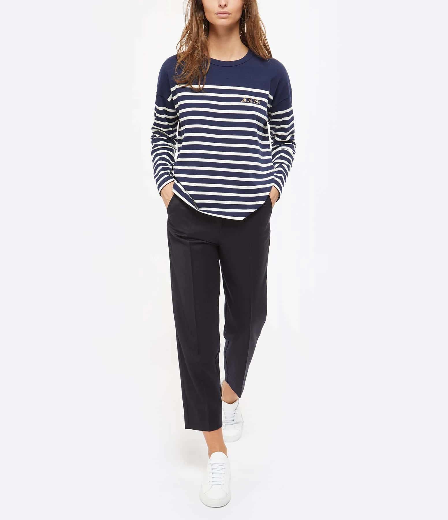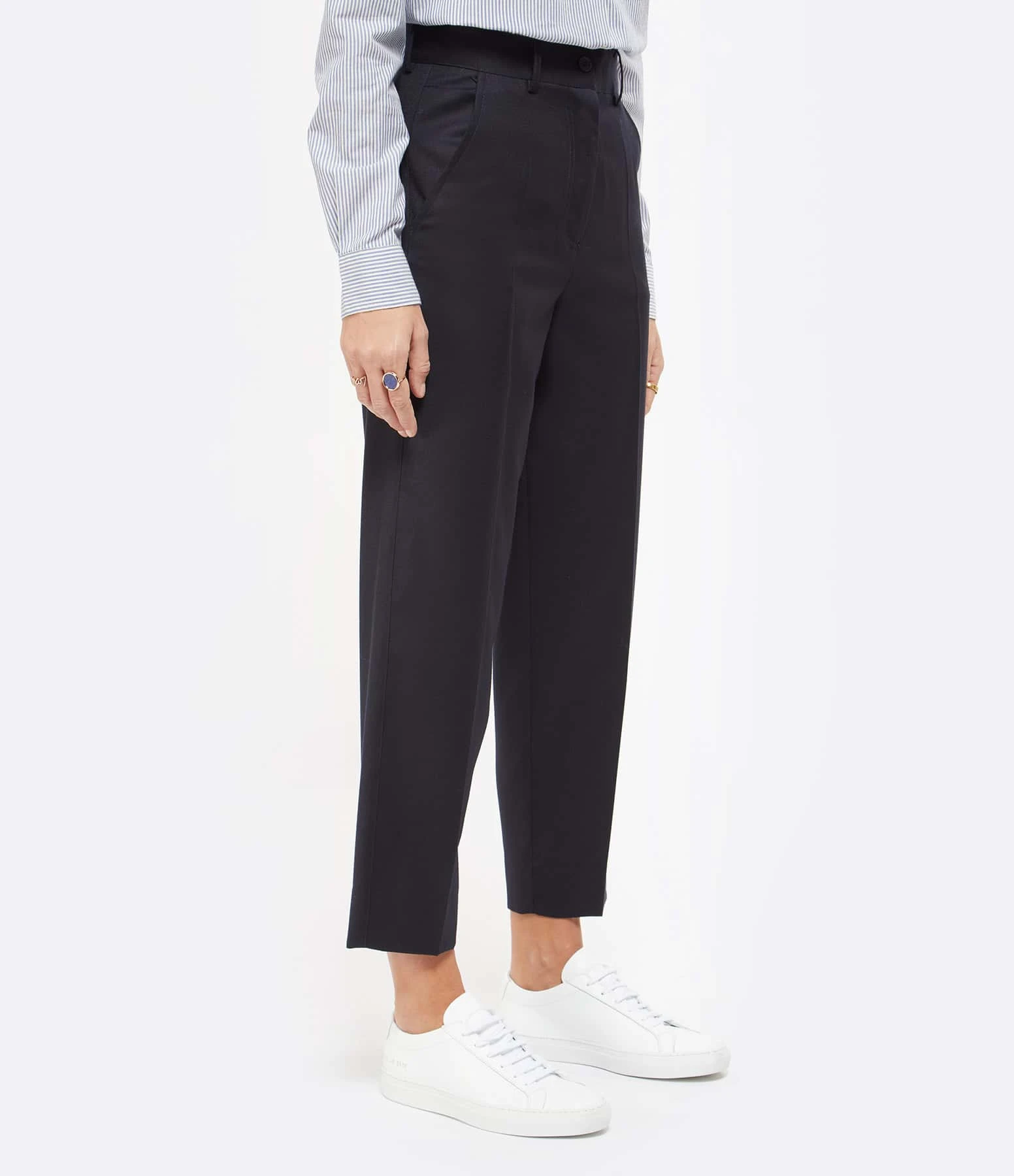 Pantalon droit en laine bleu marine pour femme. Deux poches italiennes et deux poches passepoilées. Pli sur le milieu des jambes. Fermeture par zip. Non doublé.
