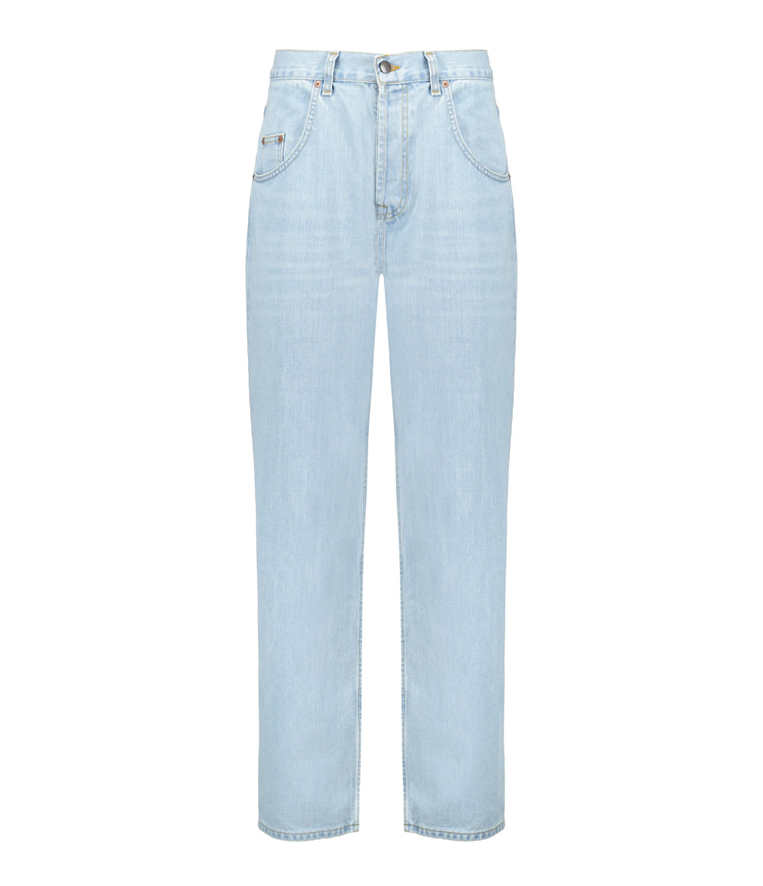 Jean oversize en denim de coton bleu clair. Passant pour ceinture. Cinq poches. Jacron en cuir lisse à l’arrière. Coupe oversize. Base droite.