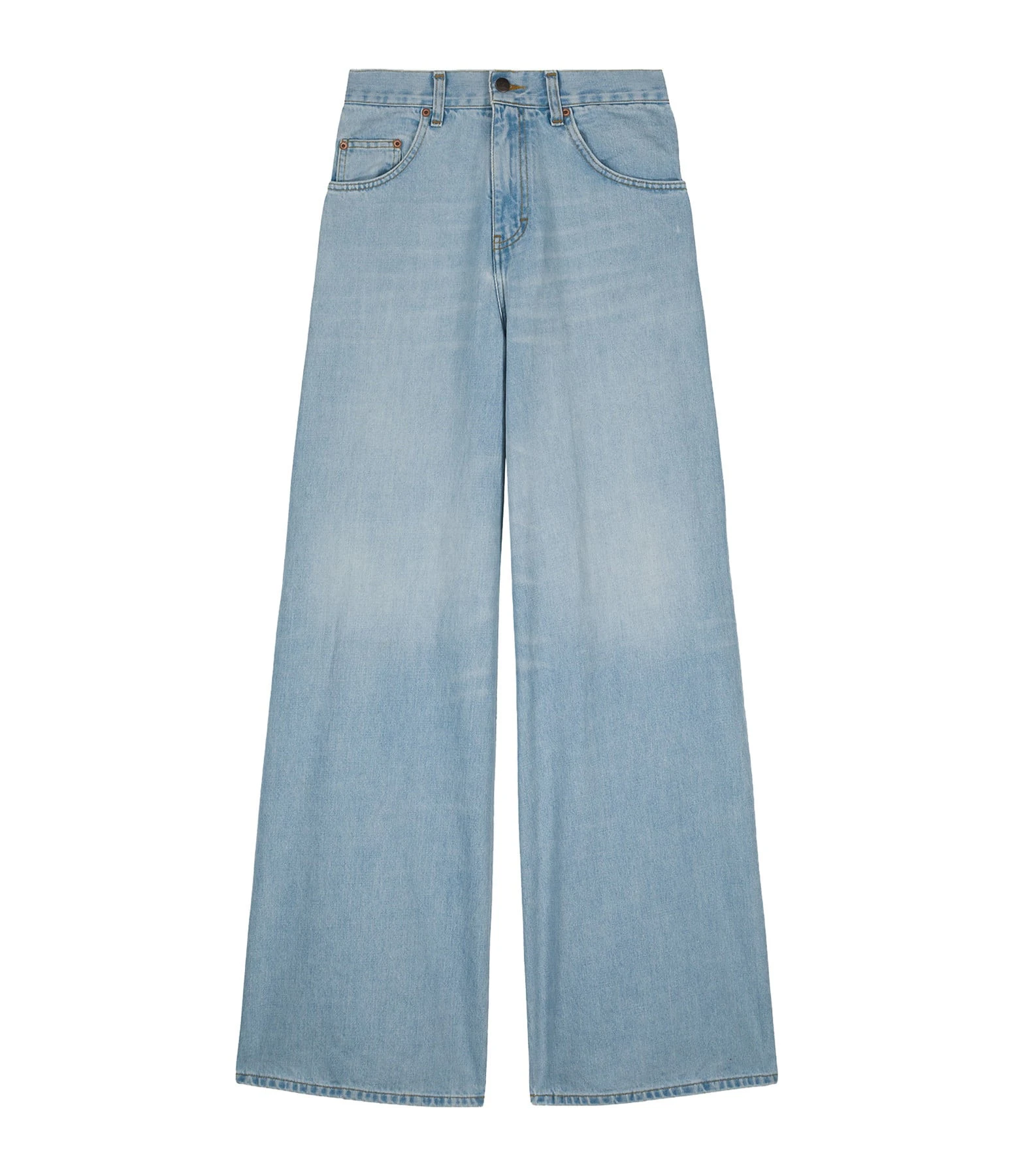 Jean large en denim de coton bleu clair. Fermeture par zip et bouton. Cinq poches. Passants pour ceinture. Coupe droite. Base droite.