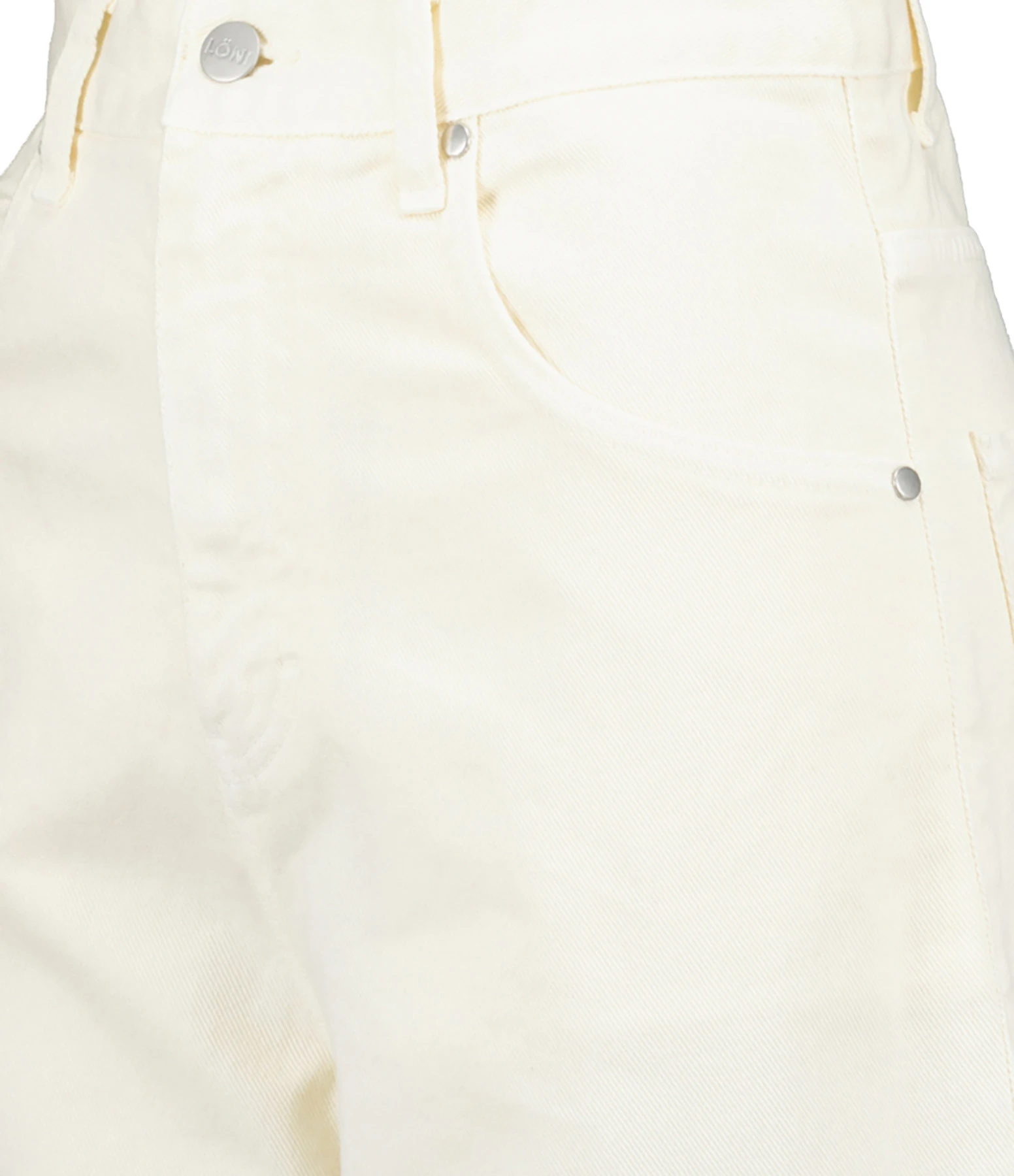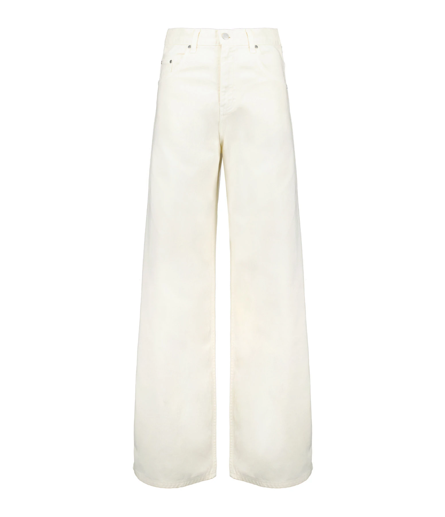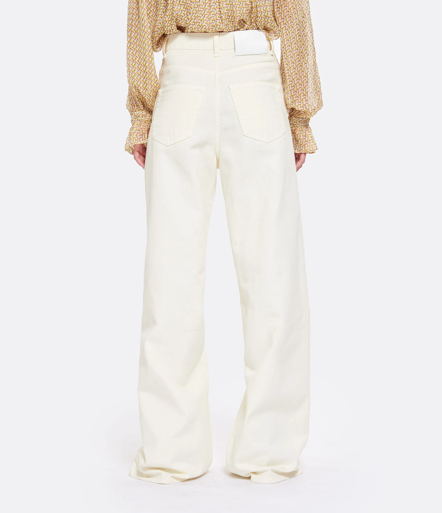 Jean large en denim de coton écru. Fermeture par zip et bouton. Cinq poches. Passants pour ceinture. Coupe droite. Base droite.